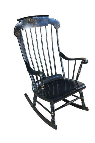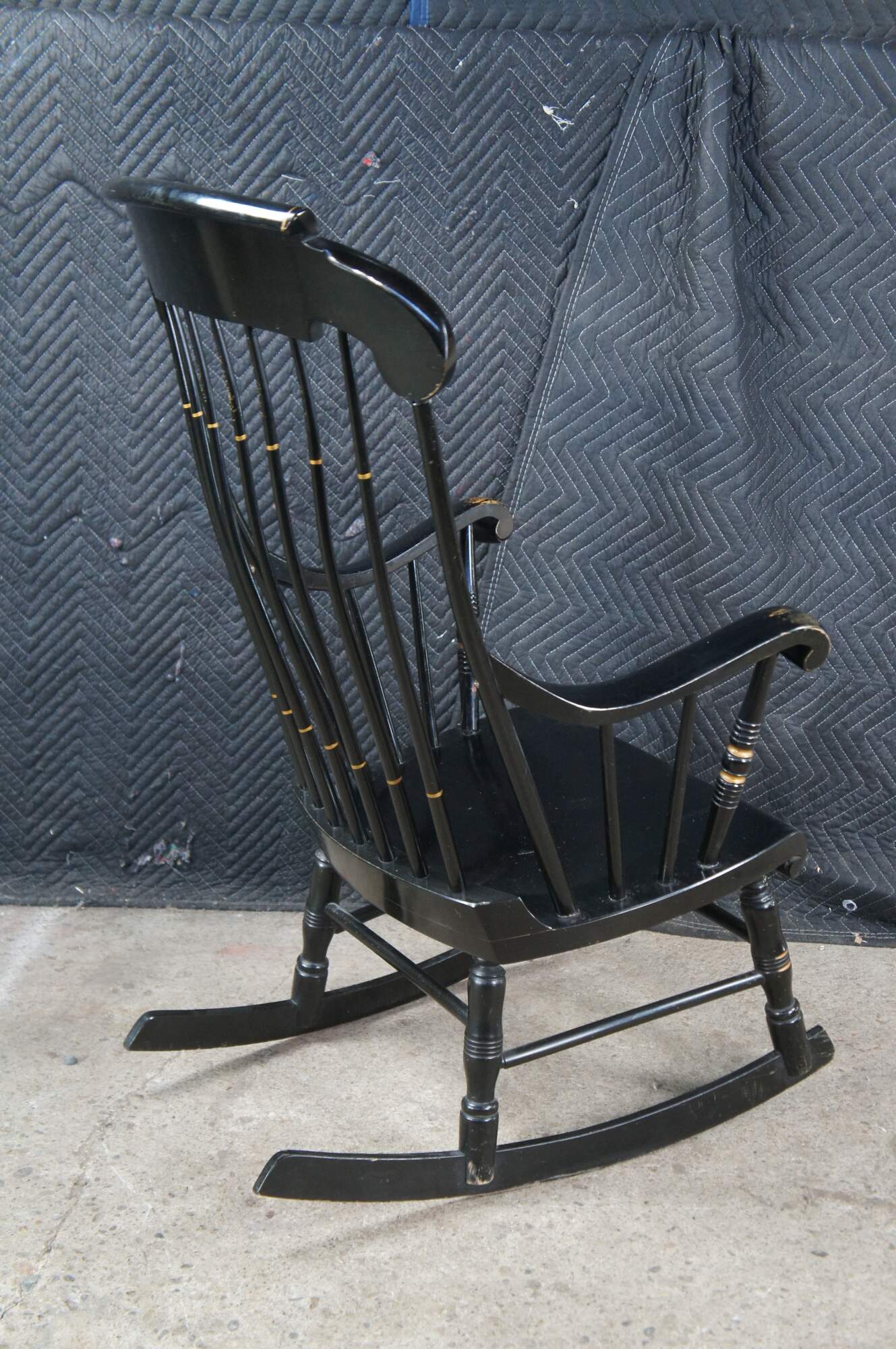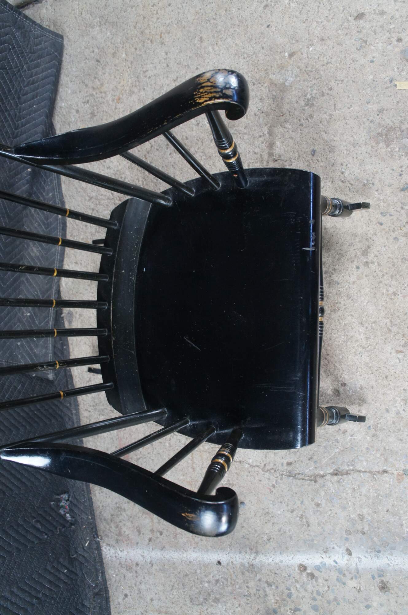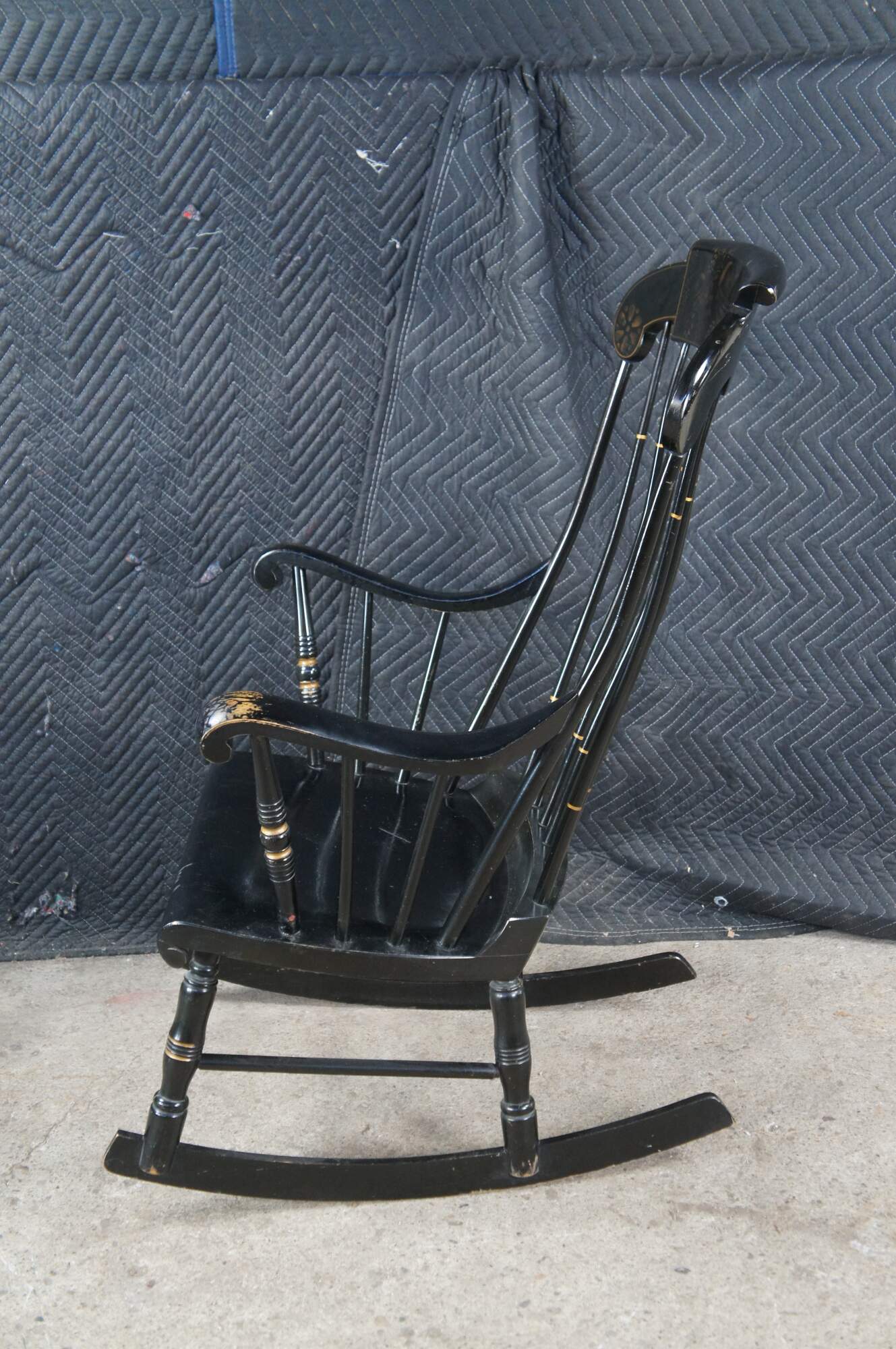 Antique black harvest Colonial Windsor Hitchcock style rocking armchair / rocker featuring an ebonized finish with gold accents and stenciled fruit.