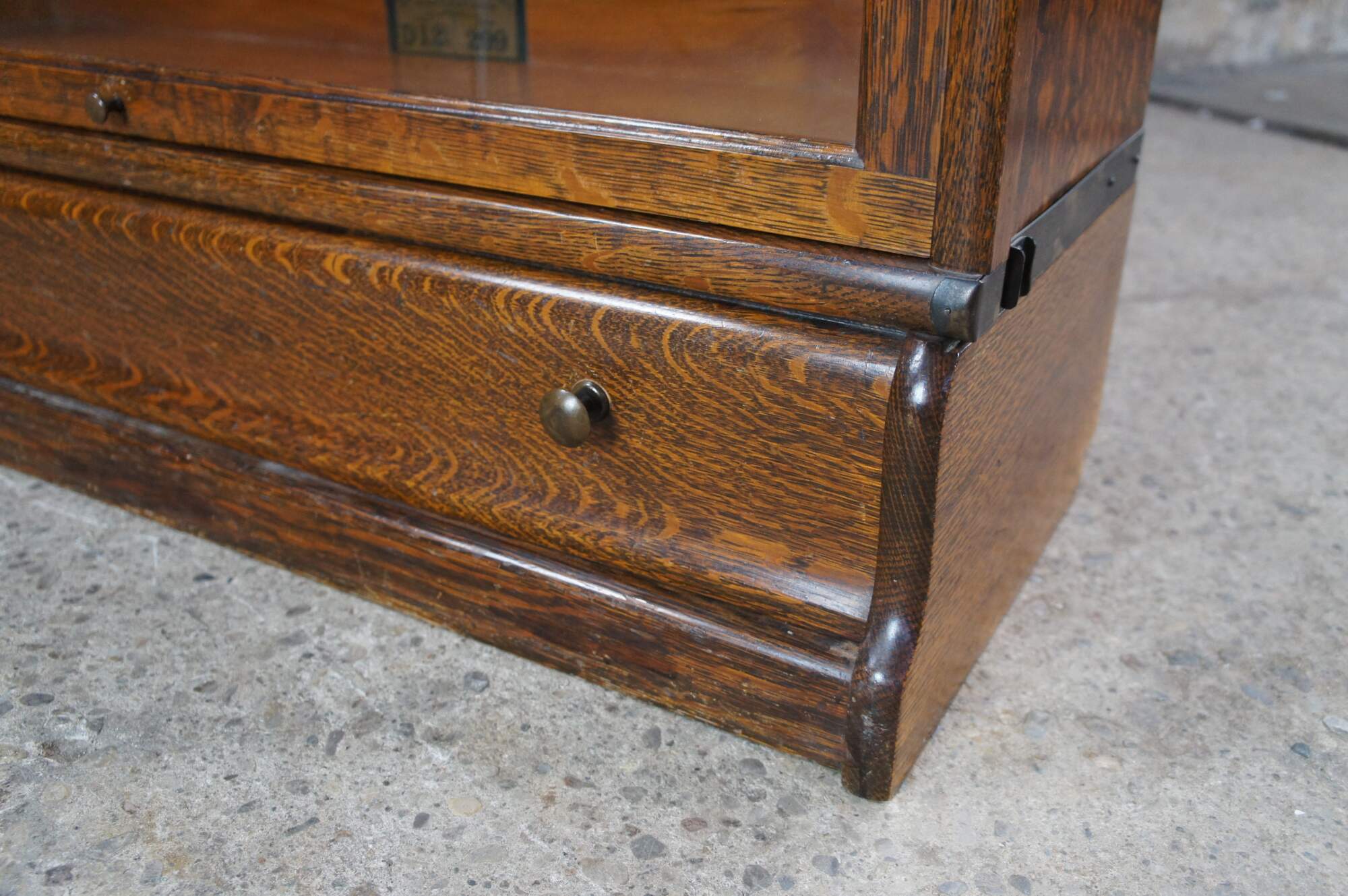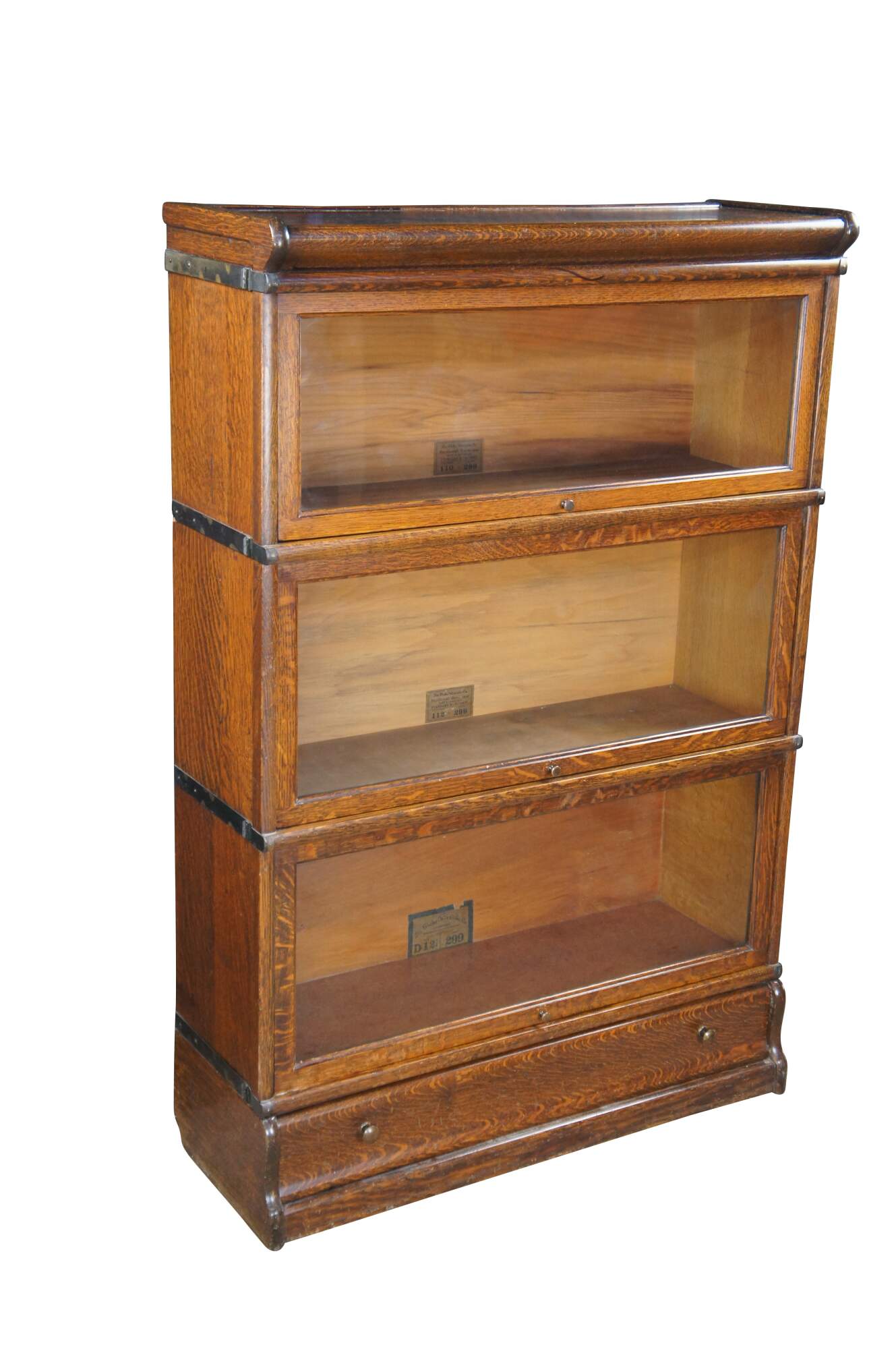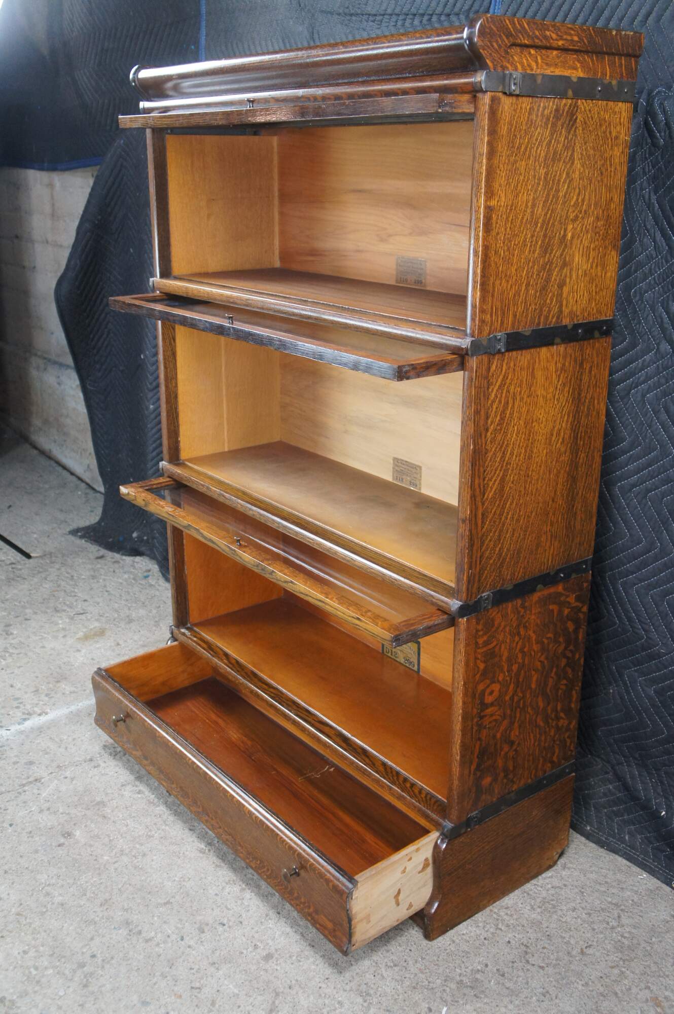 Antique 5 piece Globe Wernicke library lawyer barrister bookshelf / bookcase. Made of quartersawn oak featuring Mission styling with three curio bookshelves and lower drawer. Pattern 110, 112, D12 Grade 299.