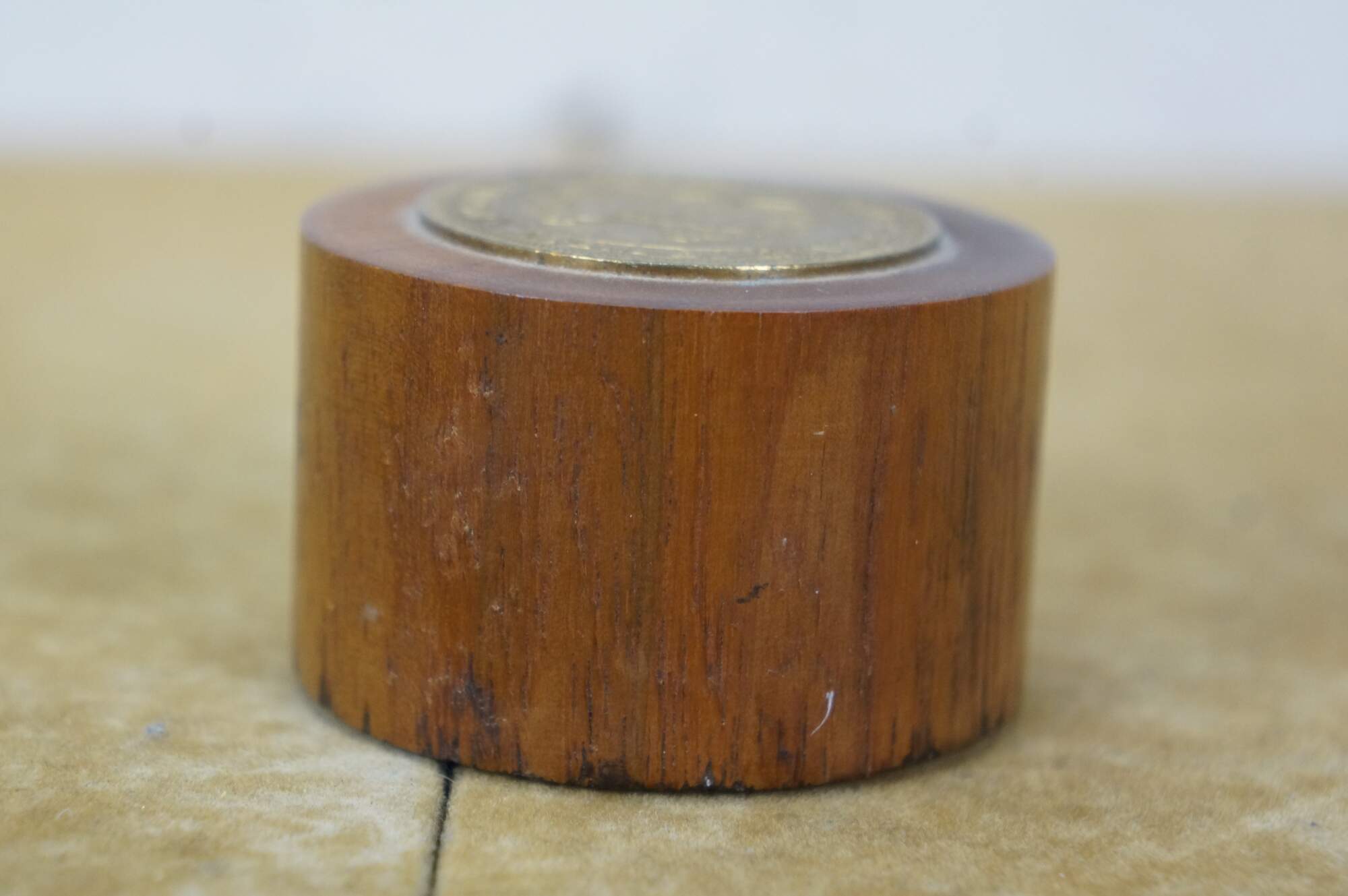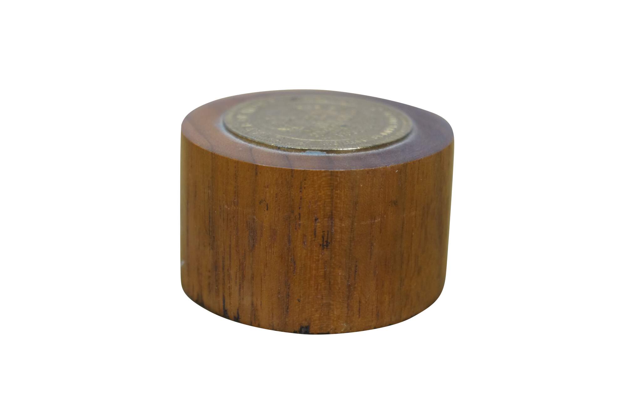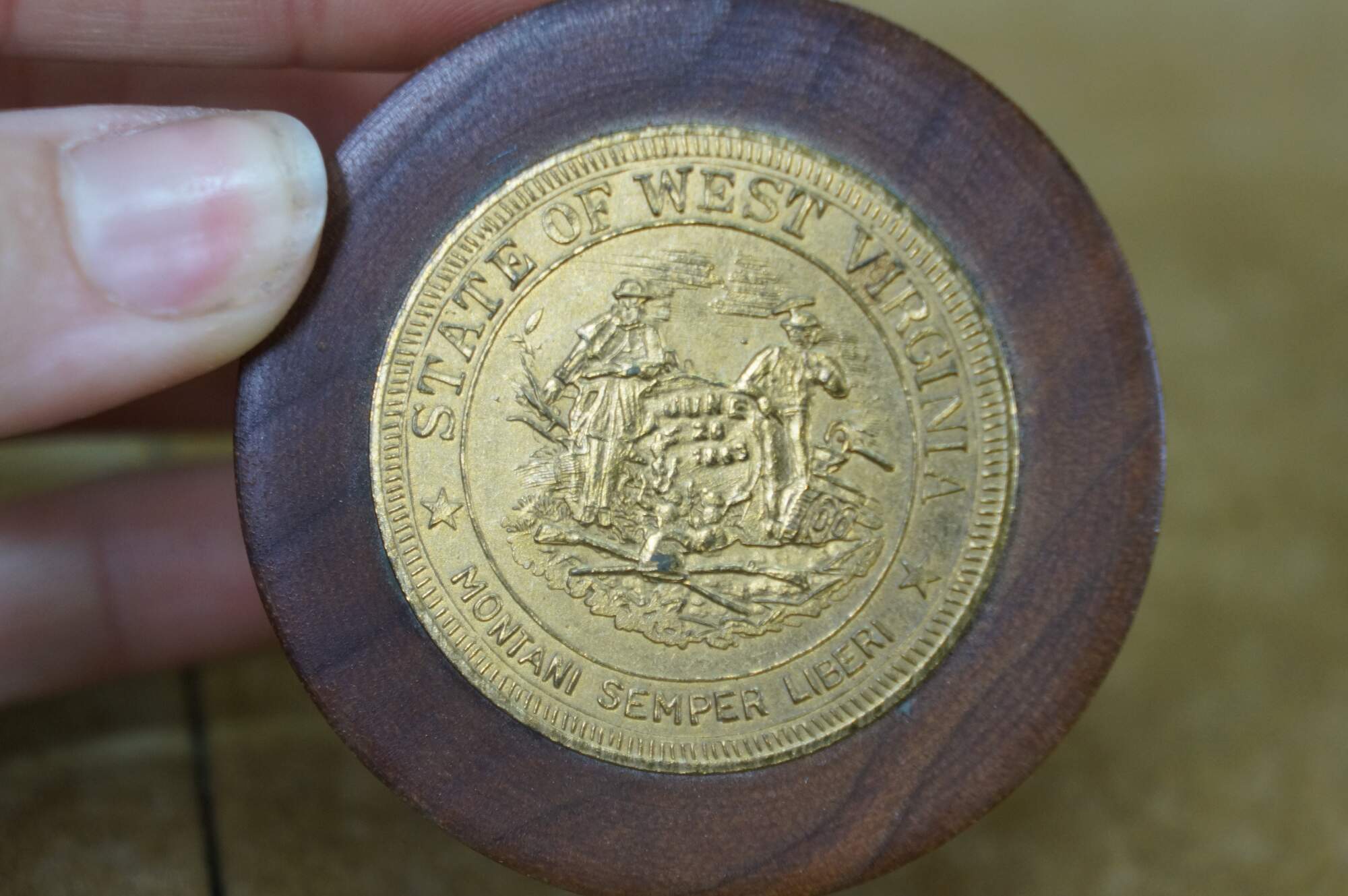 Vintage 20th century paperweight - round wooden cylinder with a State of West Virginia seal / coin / gold tone medallion inlaid in the top.