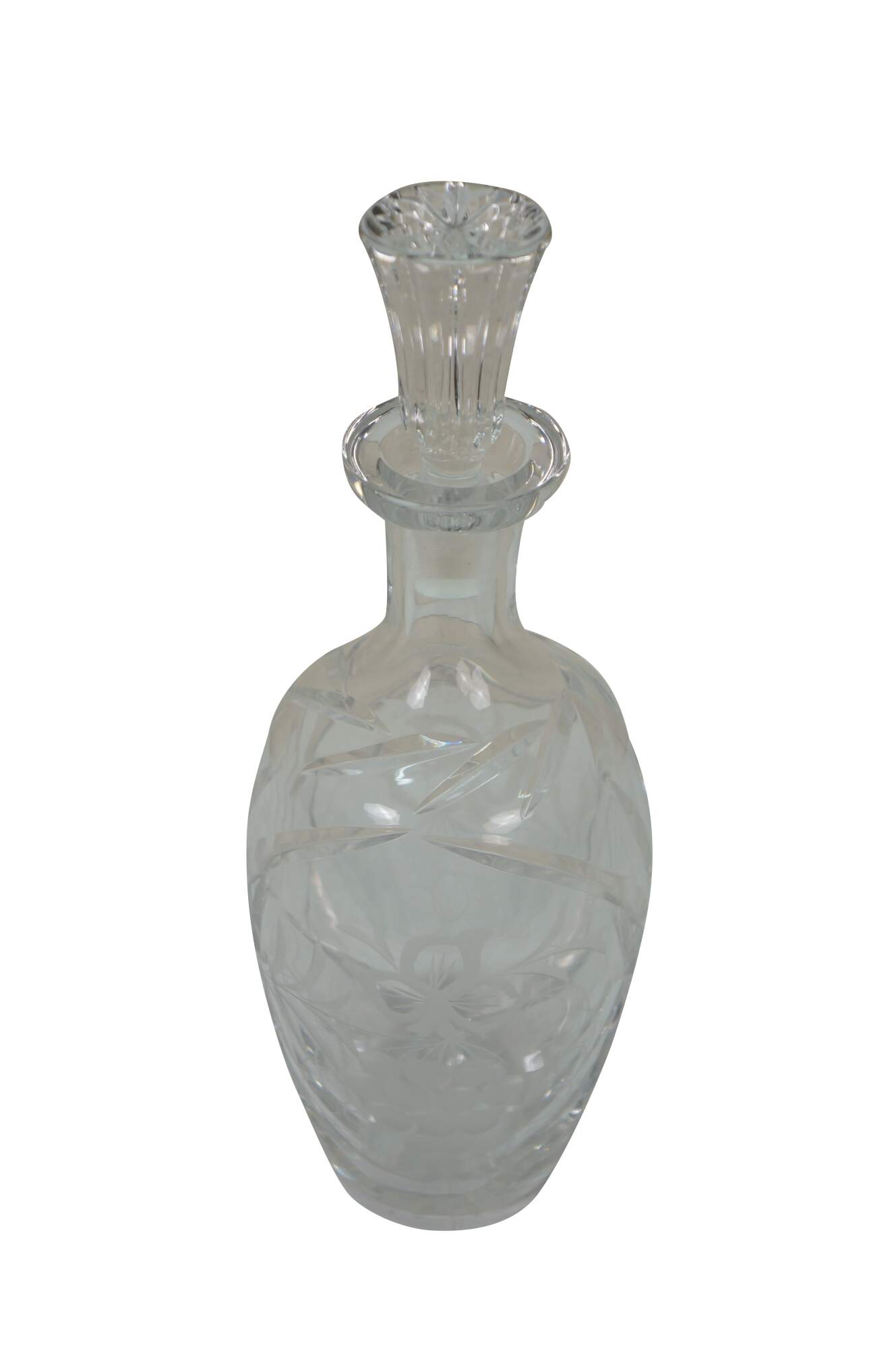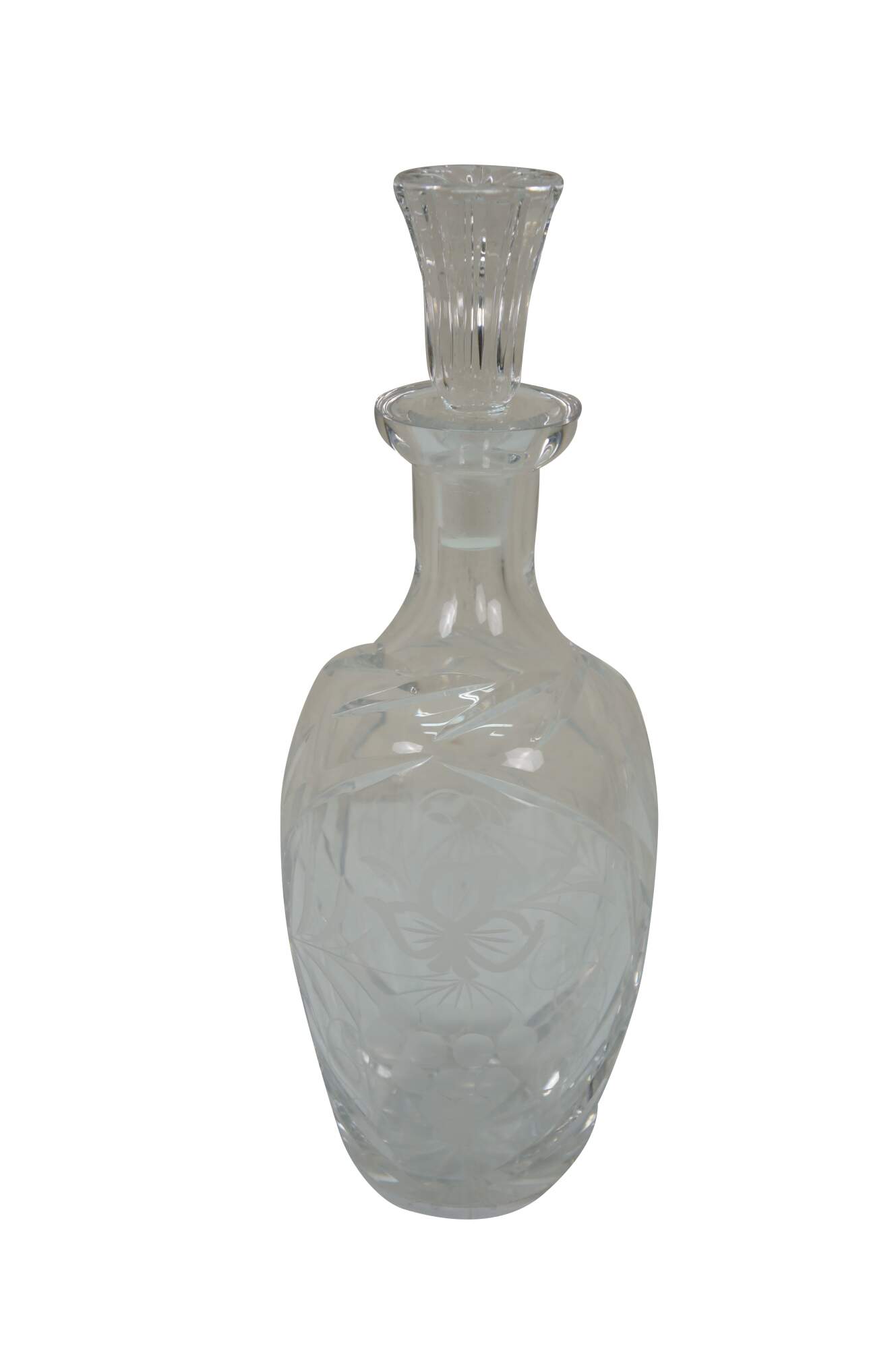 Mid to late 20th century crystal decanter / bottle with stopper, cut with criss crossed wheat sheaf shapes and etched / frosted grapevine patterns on the sides.