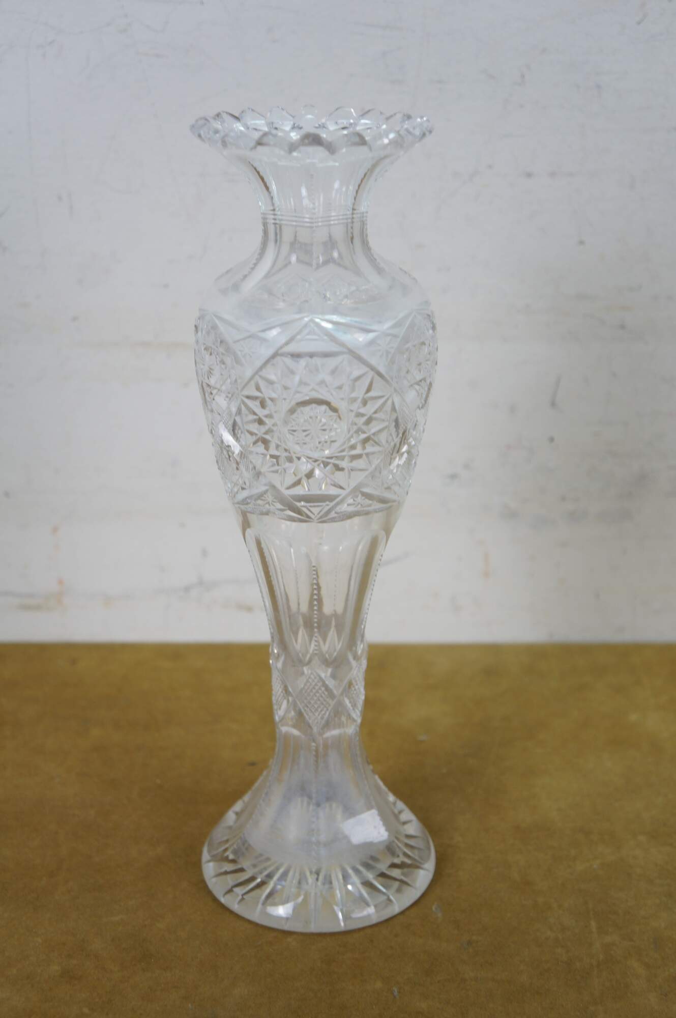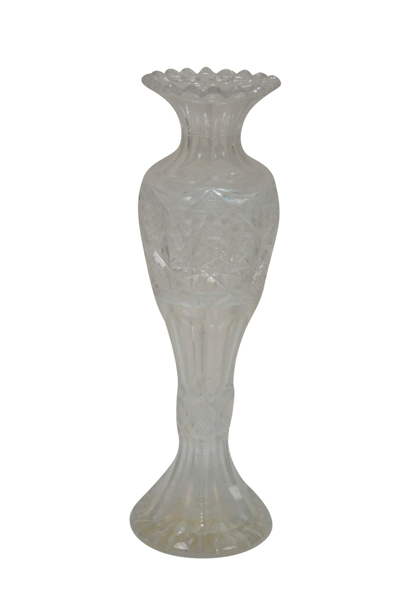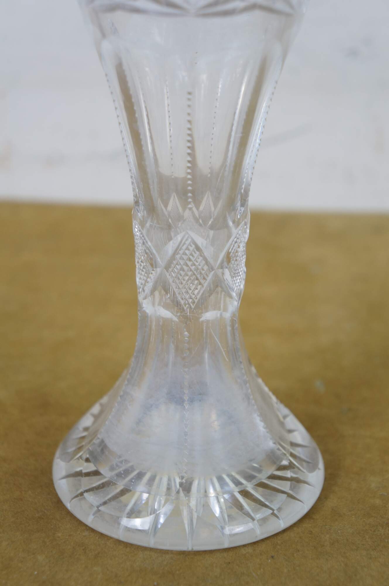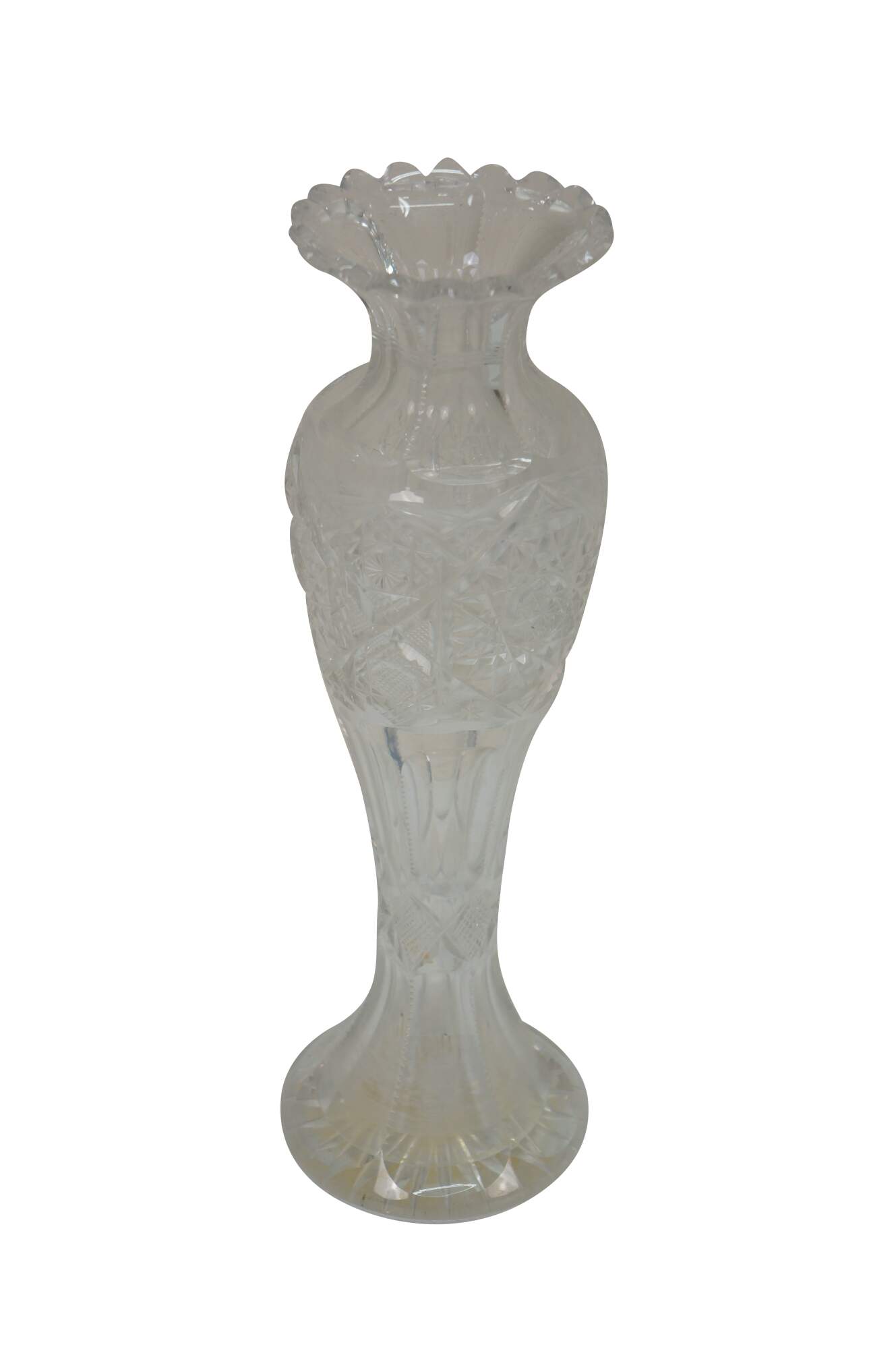 Early to mid 20th century American brilliant style cut glass / crystal flower vase. Elegantly shaped with sawtooth rim, cut with patterns of textured diamonds and hobstars.