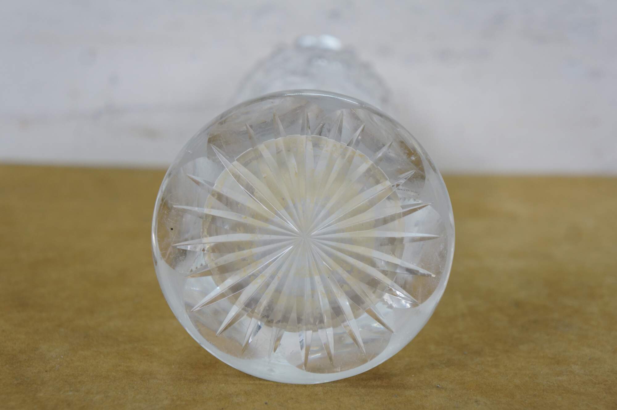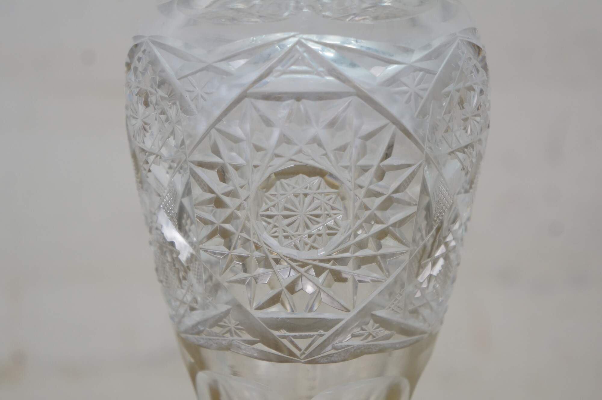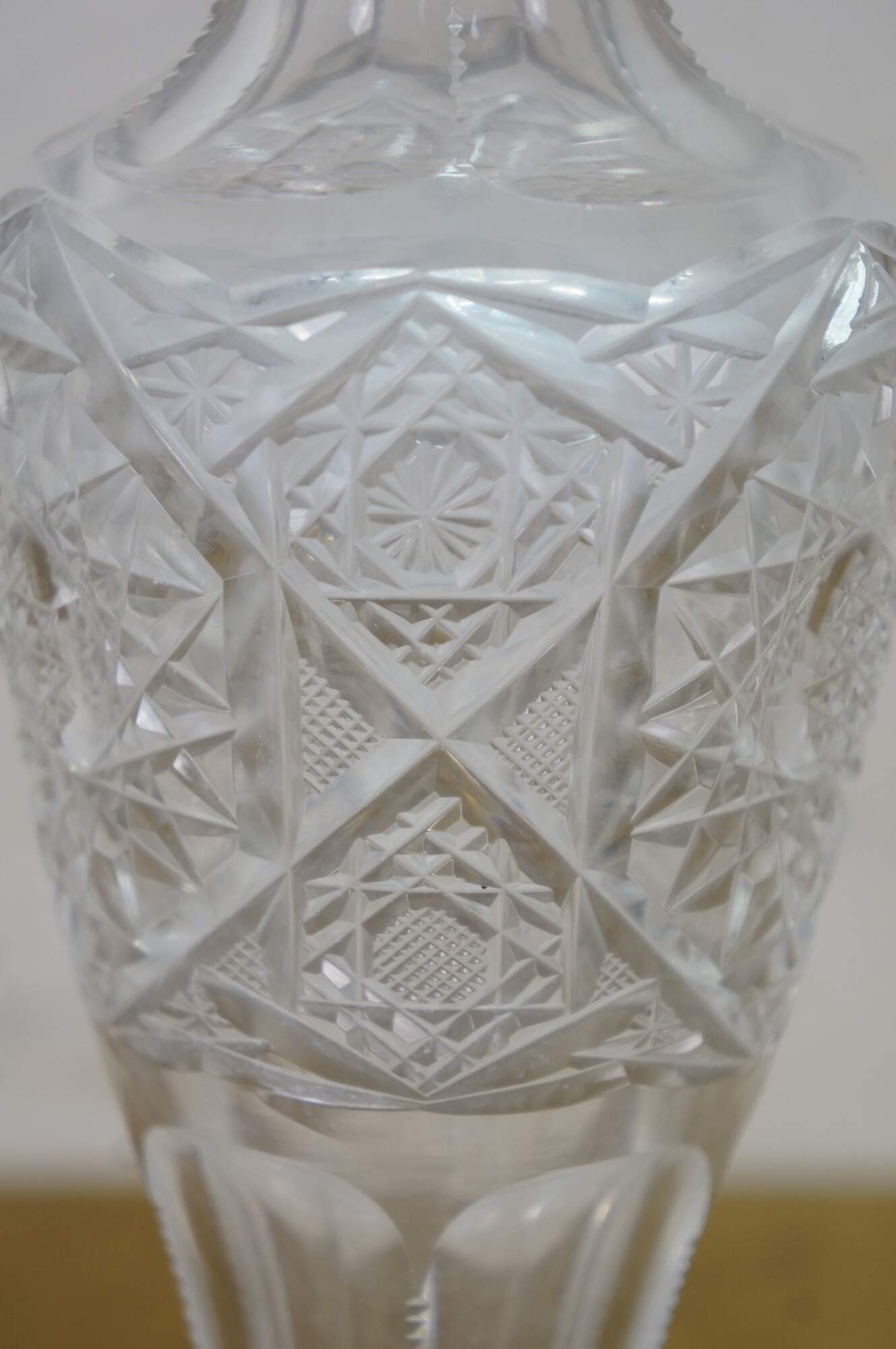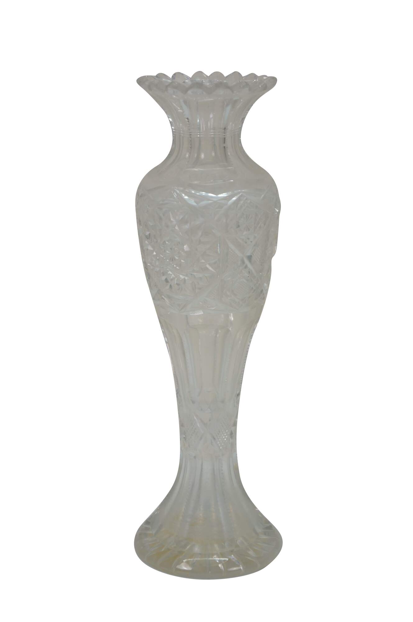 Early to mid 20th century American brilliant style cut glass / crystal flower vase. Elegantly shaped with sawtooth rim, cut with patterns of textured diamonds and hobstars.
