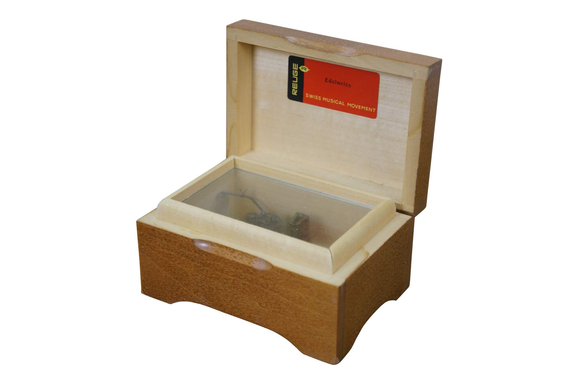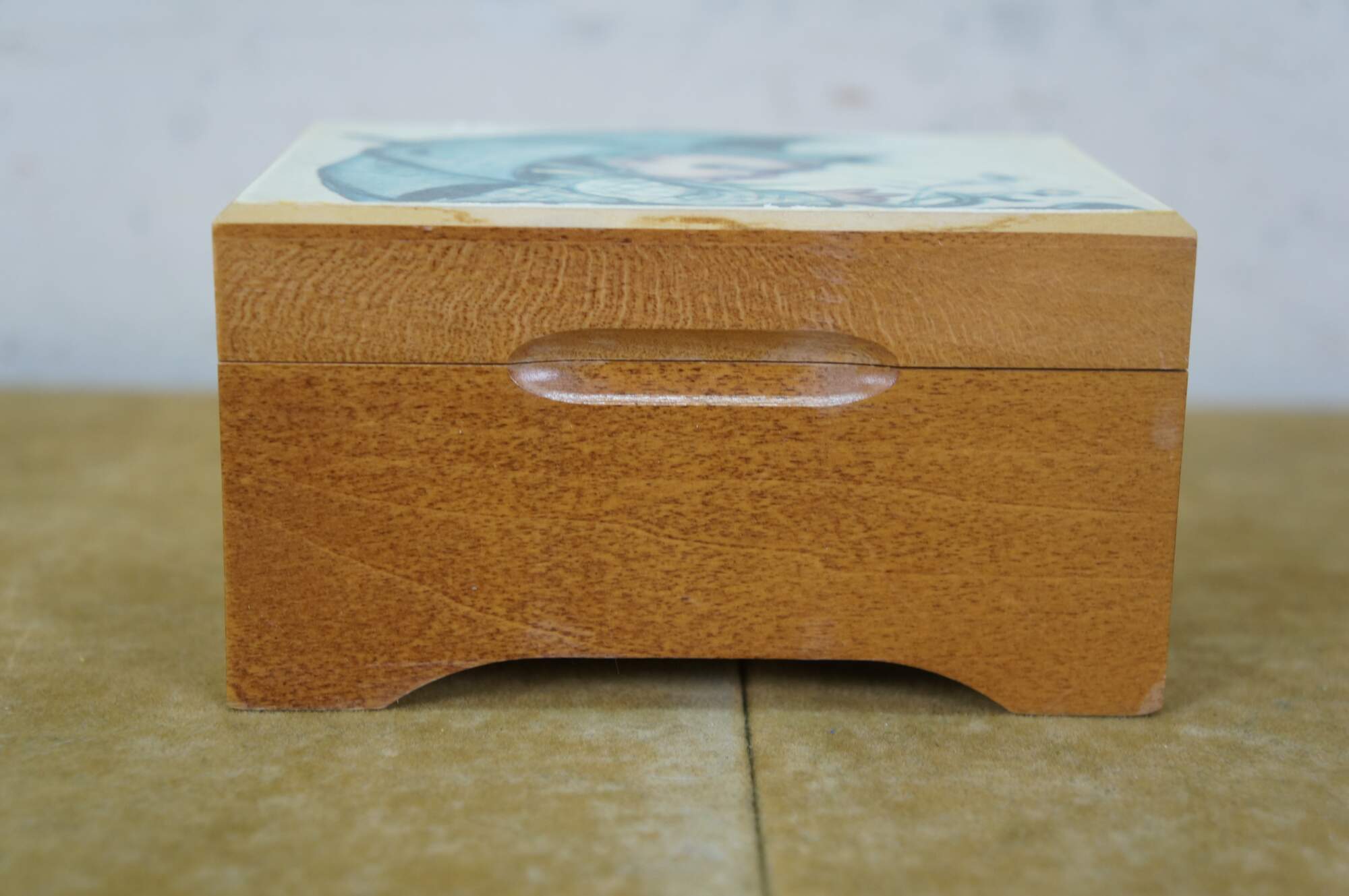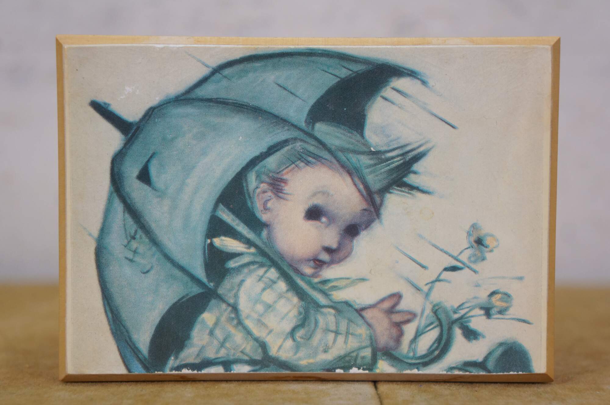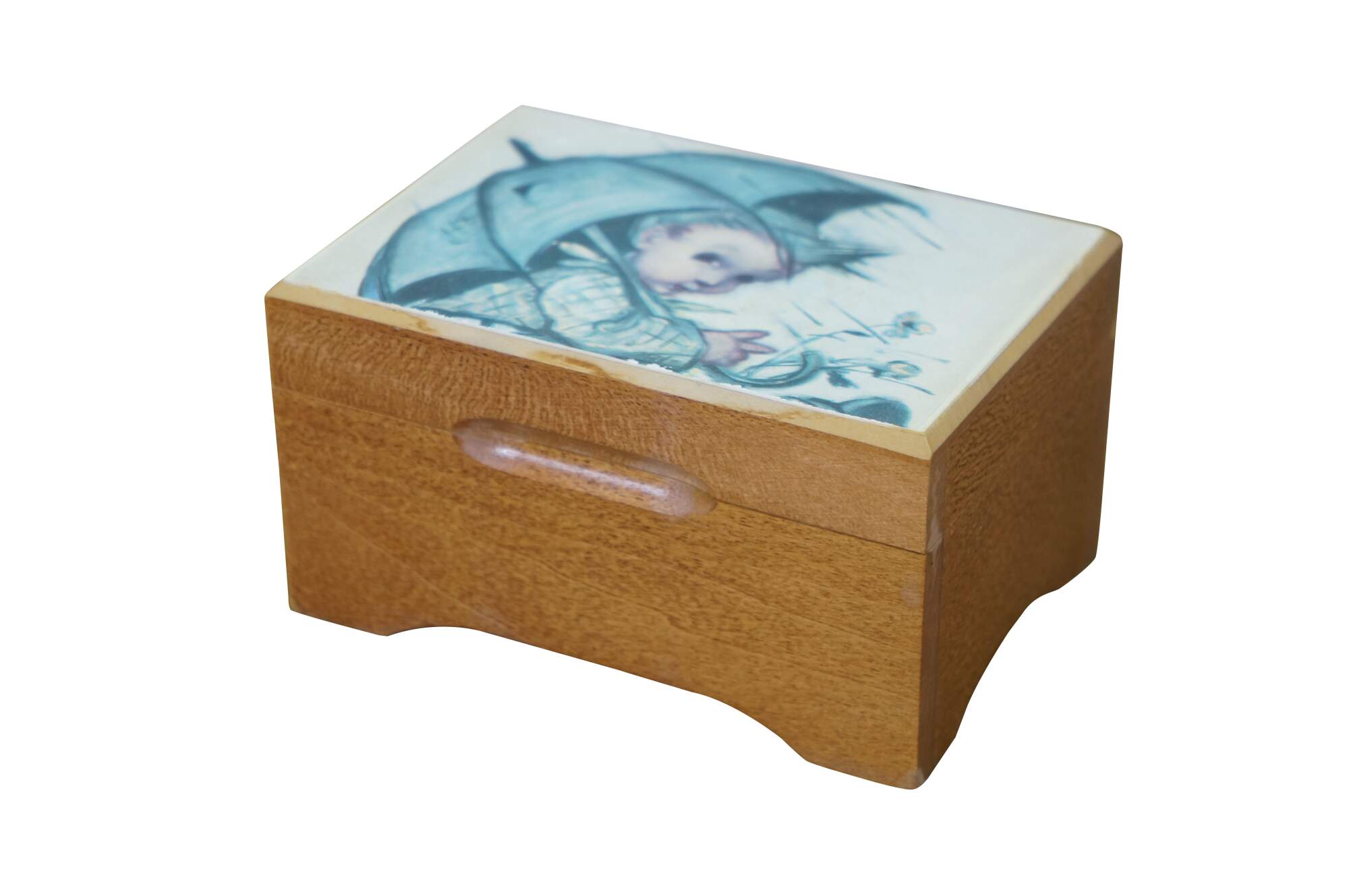 Mid to late 20th century Reuge Switzerland musical trinket box - rectangular wooden box, lid decorated with a printed image styled after "Umbrella Boy" originally designed by Sister Mary Innocentia Hummel. Plays "Edelweiss" from "The Sound of Music.