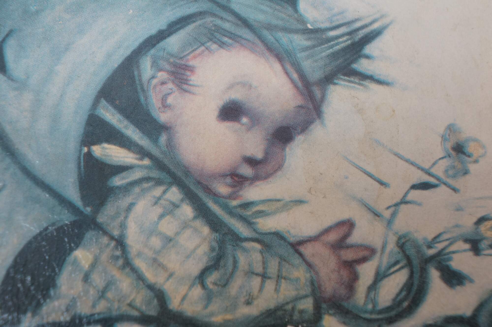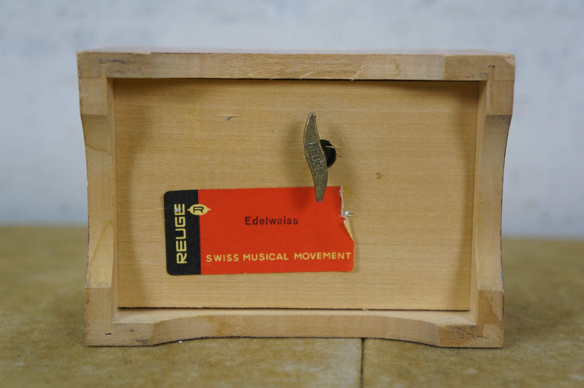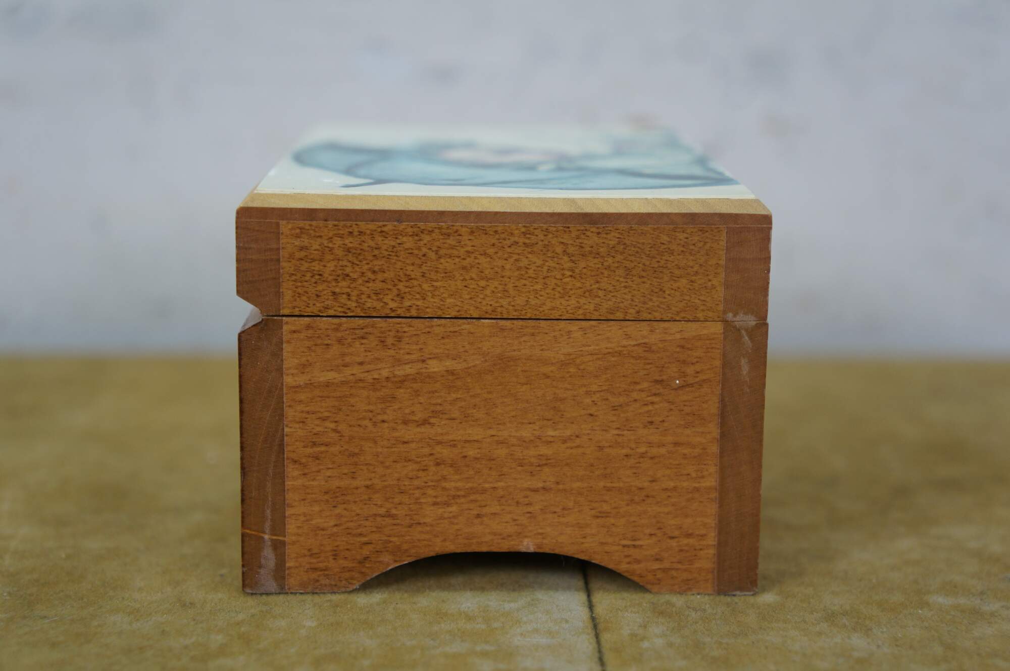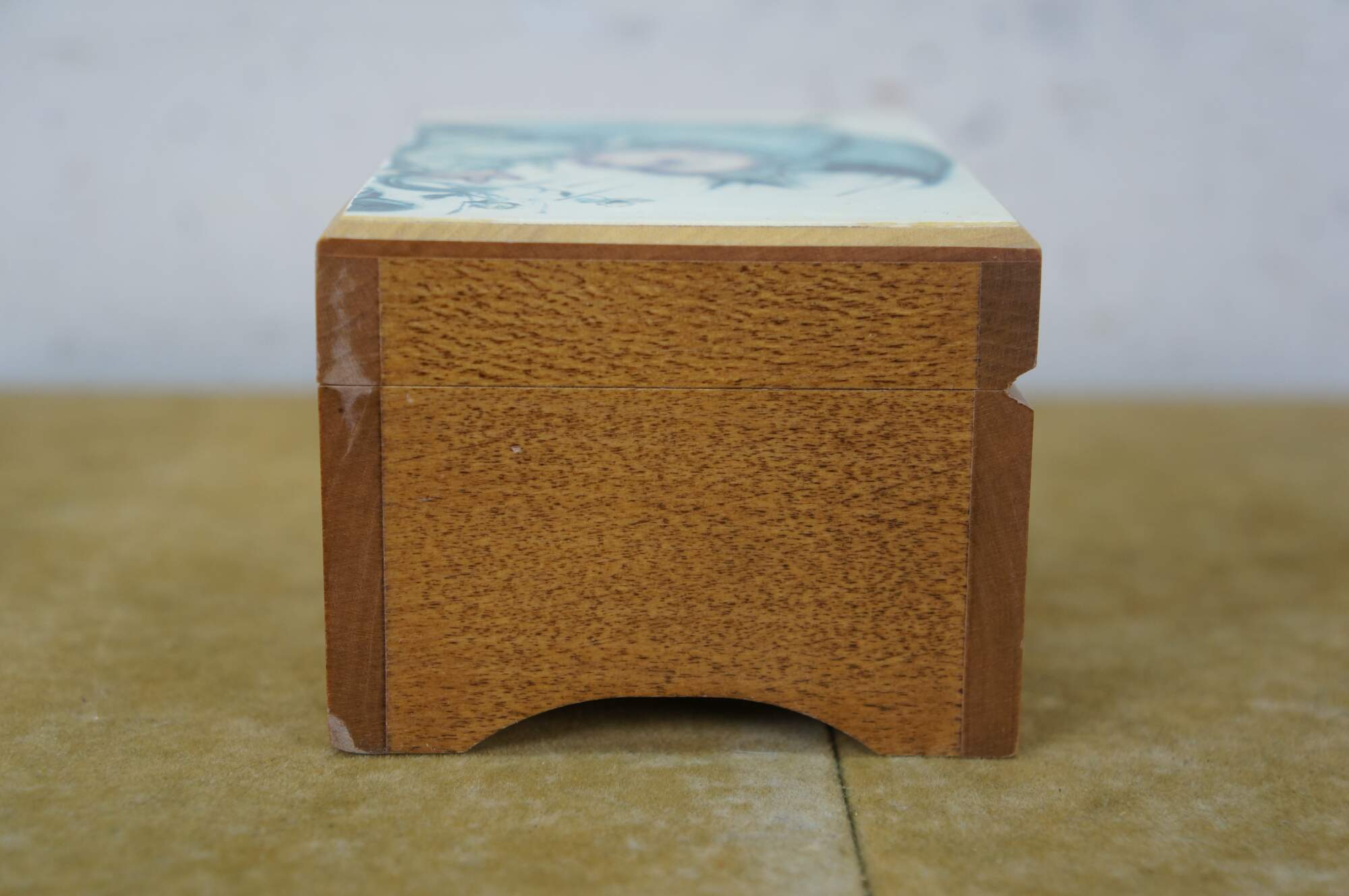 Mid to late 20th century Reuge Switzerland musical trinket box - rectangular wooden box, lid decorated with a printed image styled after "Umbrella Boy" originally designed by Sister Mary Innocentia Hummel. Plays "Edelweiss" from "The Sound of Music.