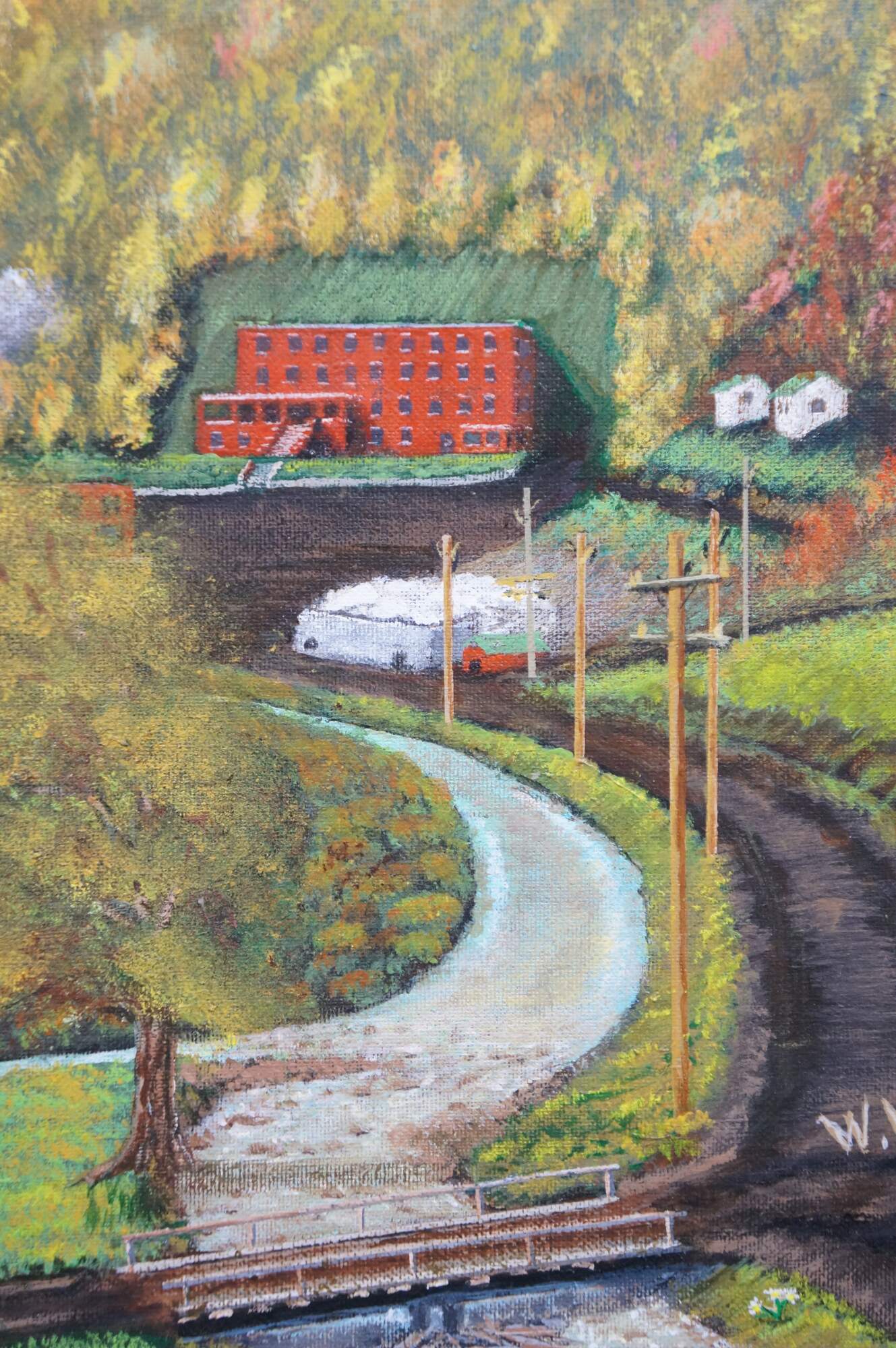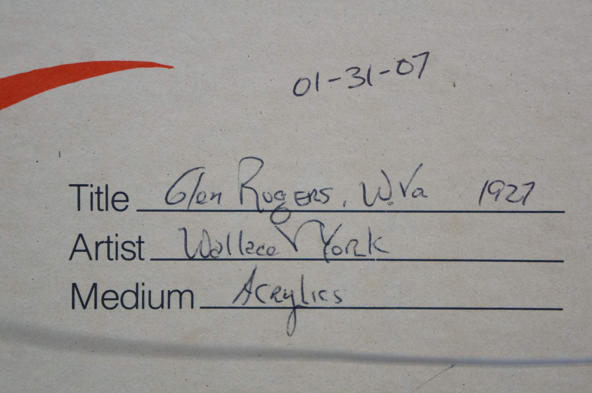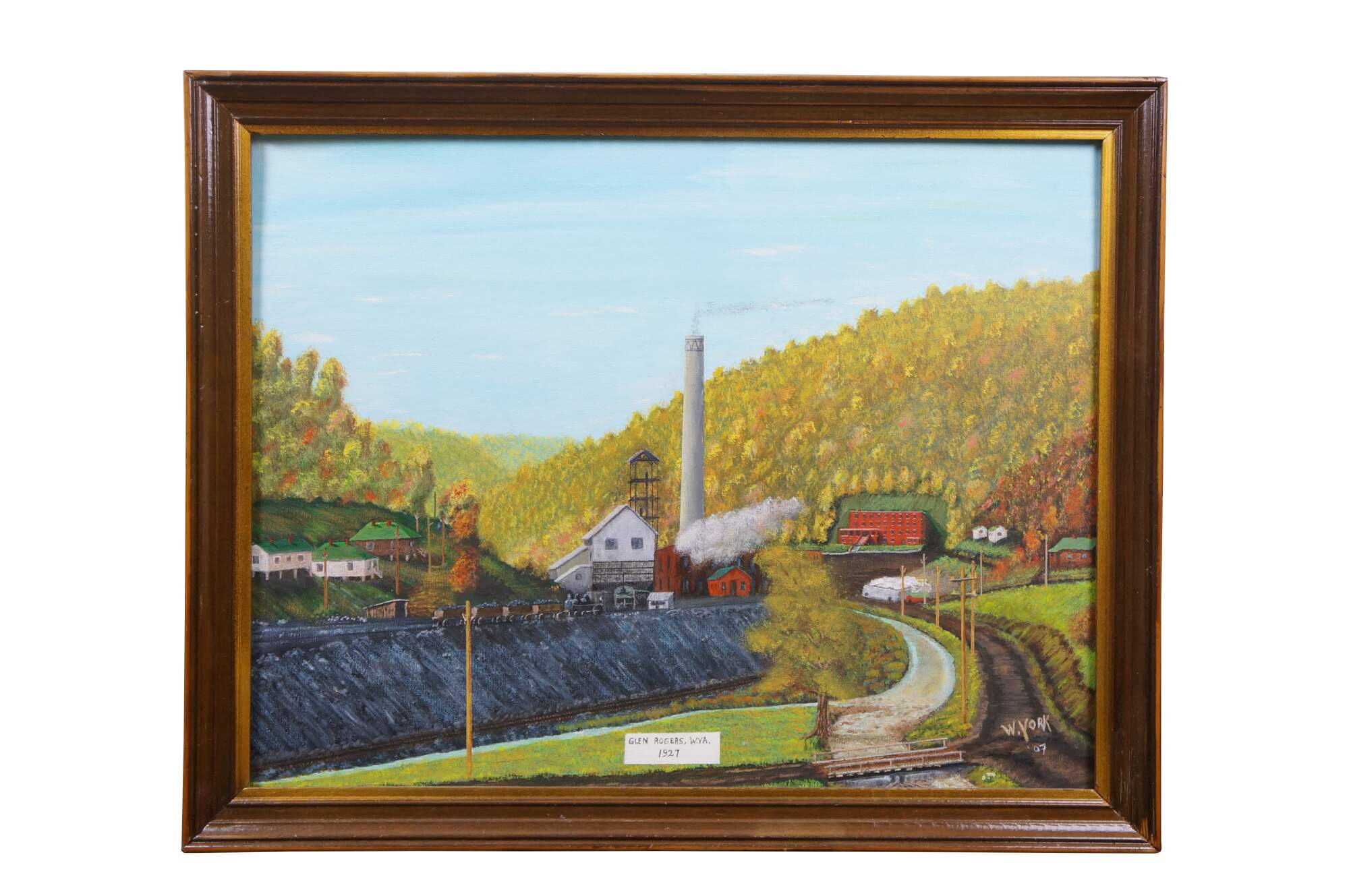 Vintage acrylic landscape oil painting on canvas board titled "Glen Rogers, West Virginia, 1927" by Rev. Wallace V. York. Depicts a landscape view of Glen Rogers with the large smokestack from the power generators. The red building is the hotel. This was the most productive coal mine in West Virginia. This piece was painted by Rev. Wallce York circa 2007 to be a door prize at Glen Rogers High School class renuion for the students that graduated 1950-1951. Signed, lower right. Beveled wood frame.