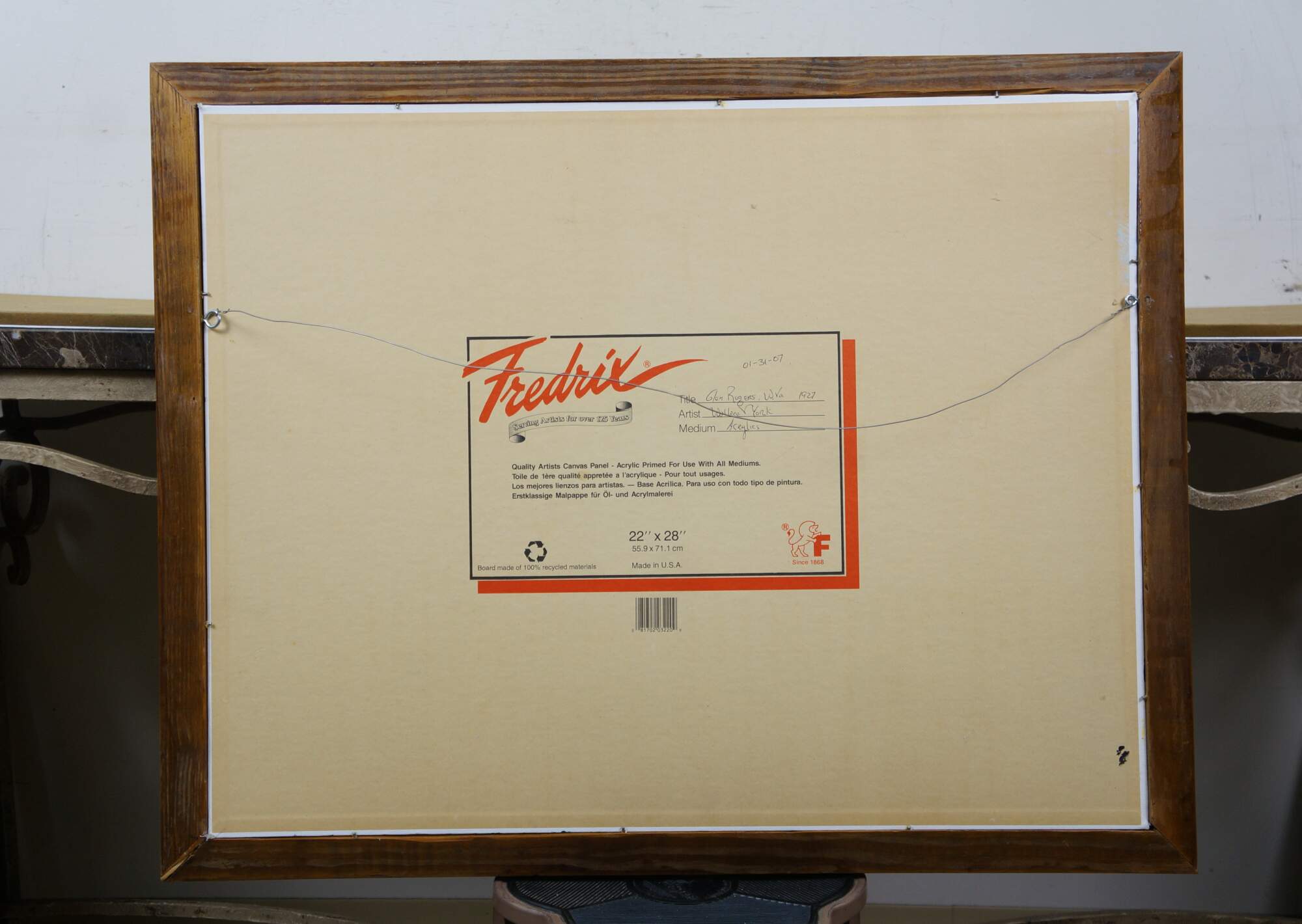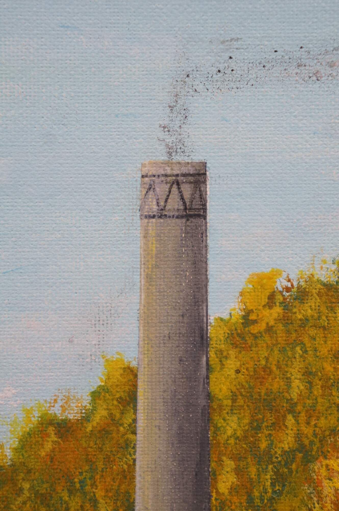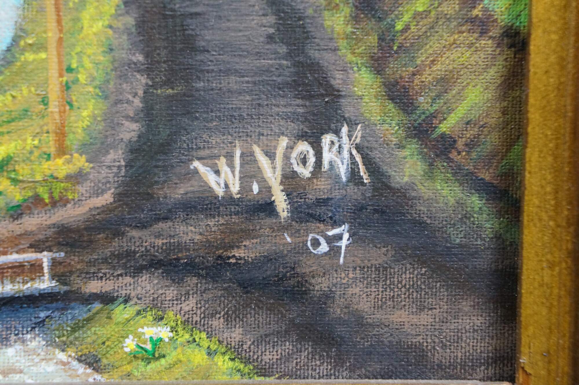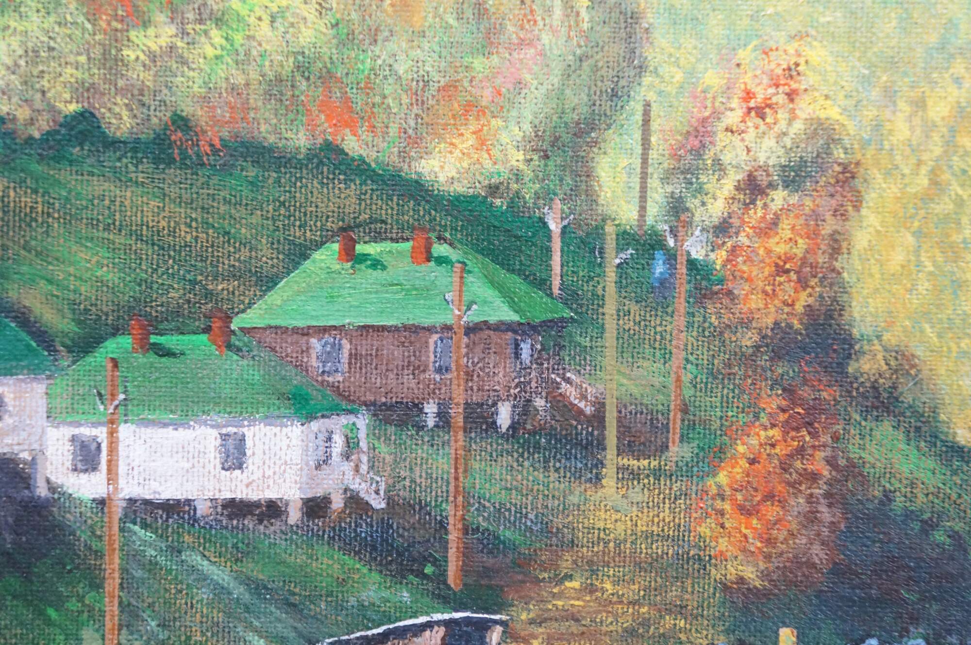 Vintage acrylic landscape oil painting on canvas board titled "Glen Rogers, West Virginia, 1927" by Rev. Wallace V. York. Depicts a landscape view of Glen Rogers with the large smokestack from the power generators. The red building is the hotel. This was the most productive coal mine in West Virginia. This piece was painted by Rev. Wallce York circa 2007 to be a door prize at Glen Rogers High School class renuion for the students that graduated 1950-1951. Signed, lower right. Beveled wood frame.