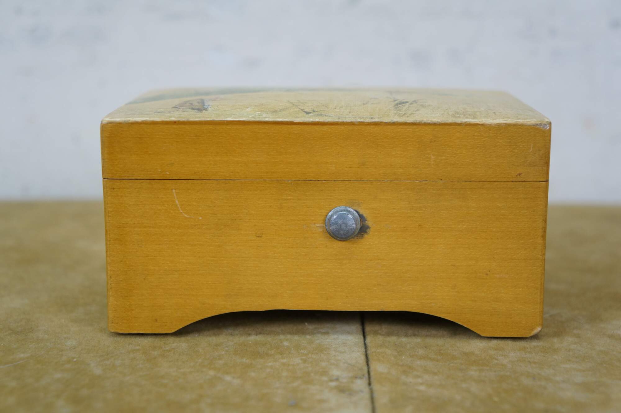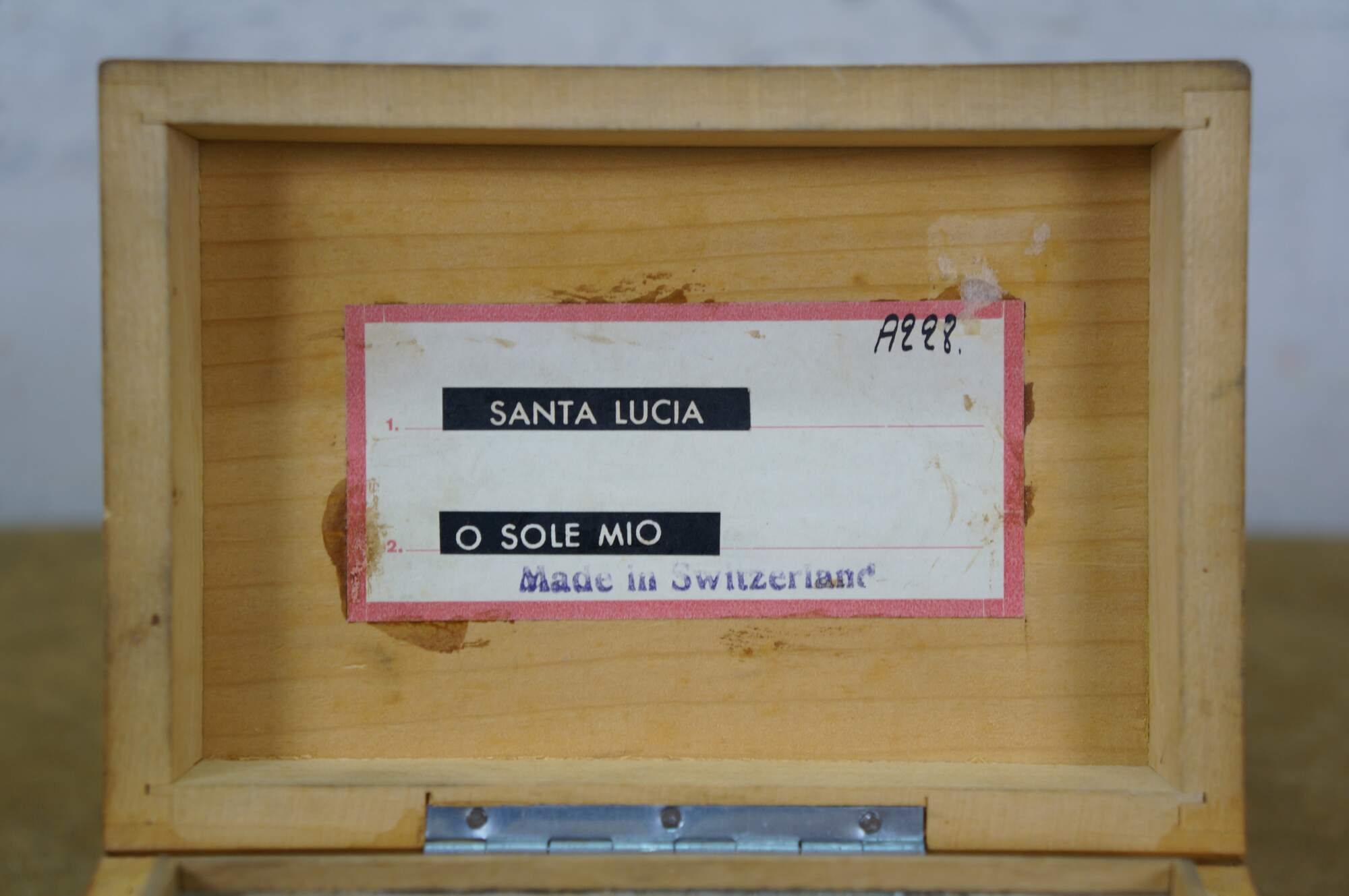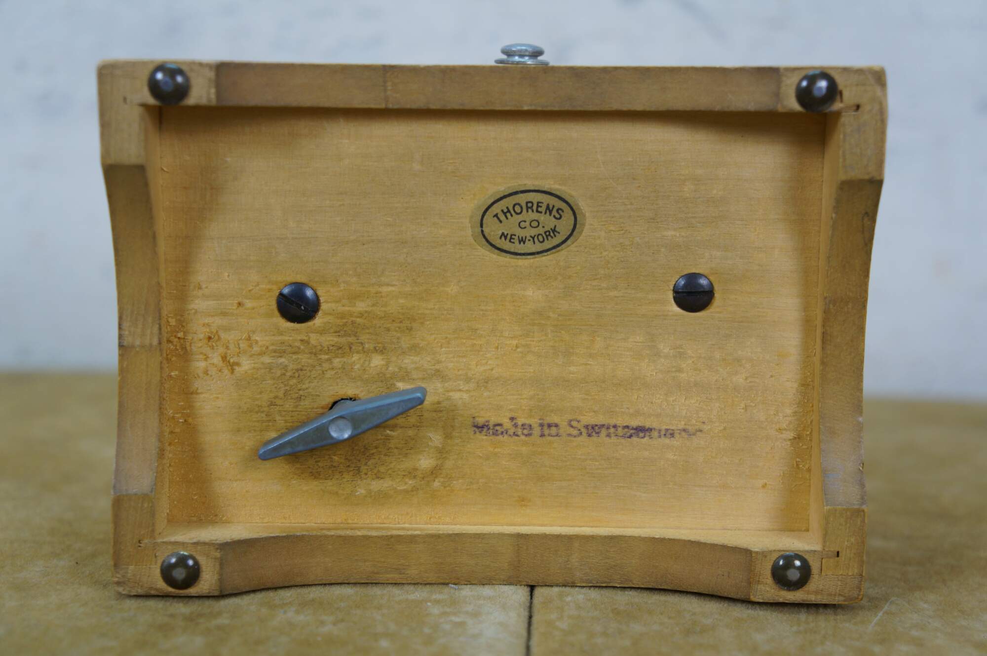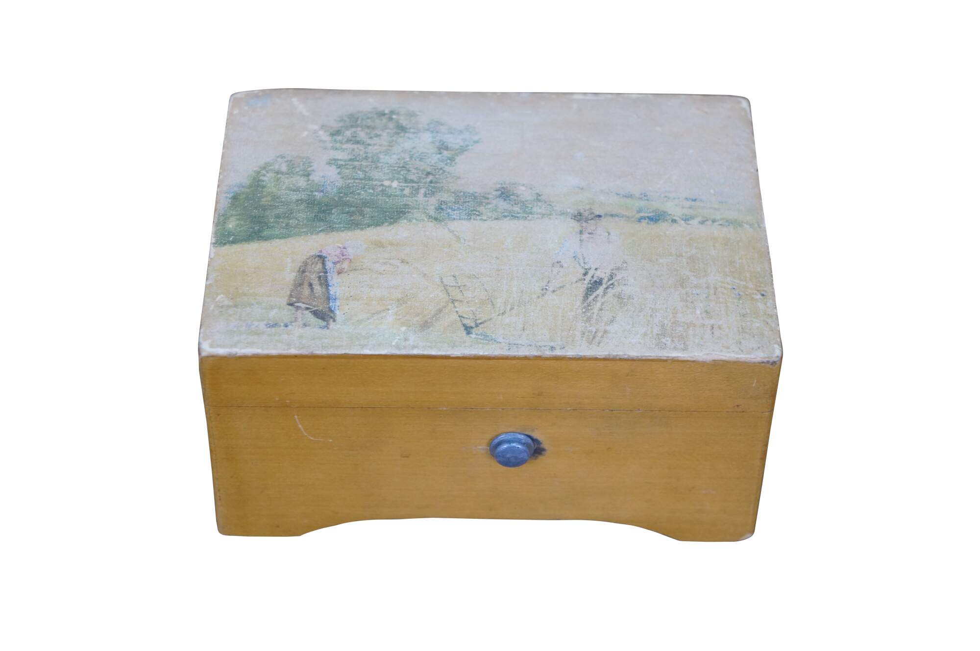 Circa mid 20th century Thorens Co music box - wooden trinket box style with printed image of peasant farmers in a field on the lid. Works displayed under glass inside. Plays two tunes - Santa Lucia and O Sole Mio. Made in Switzerland.