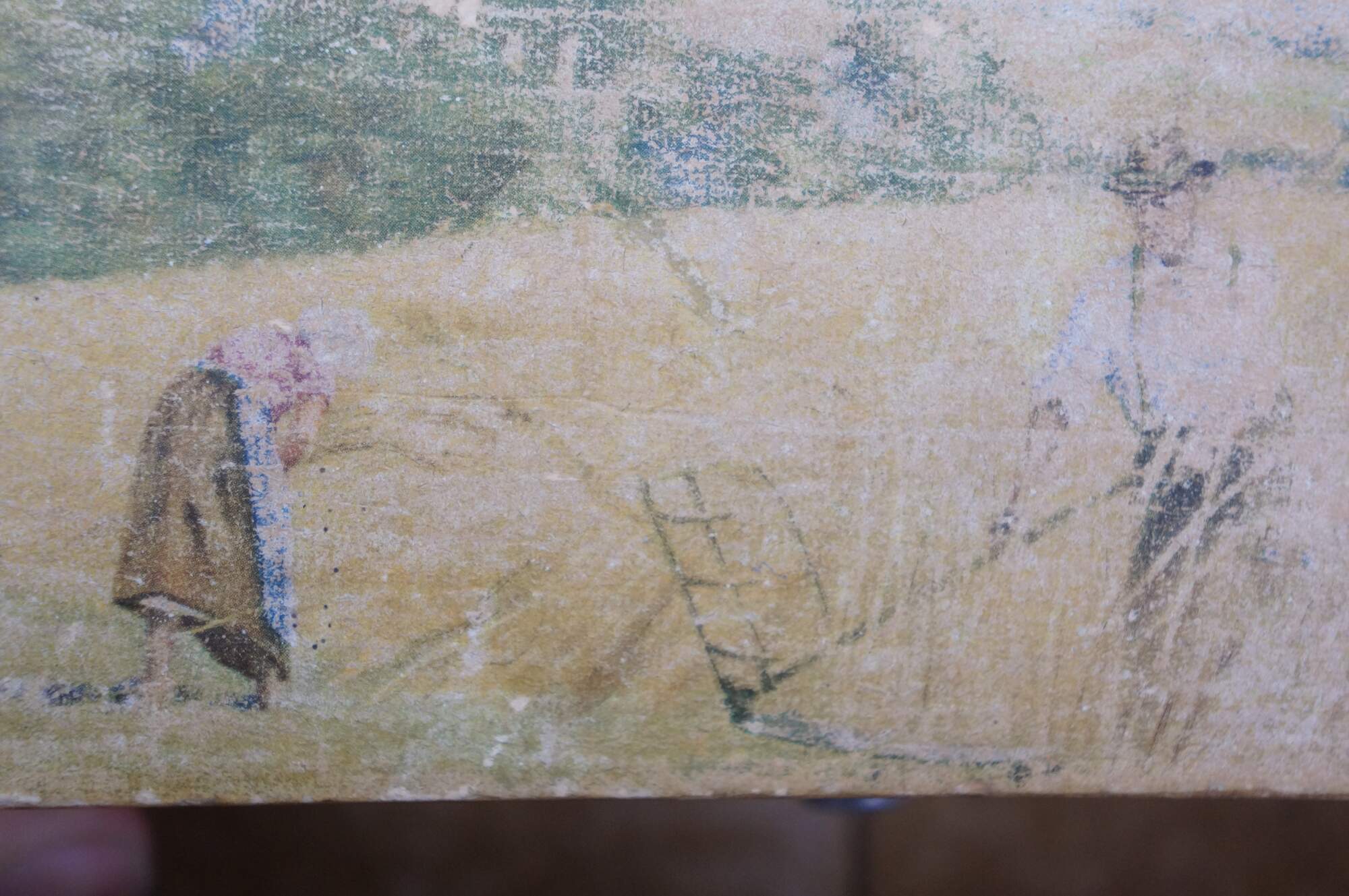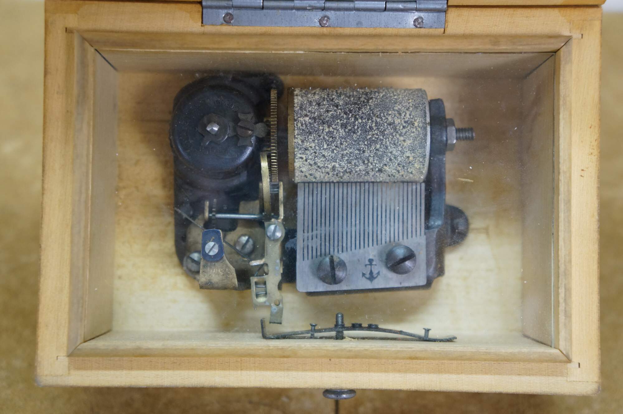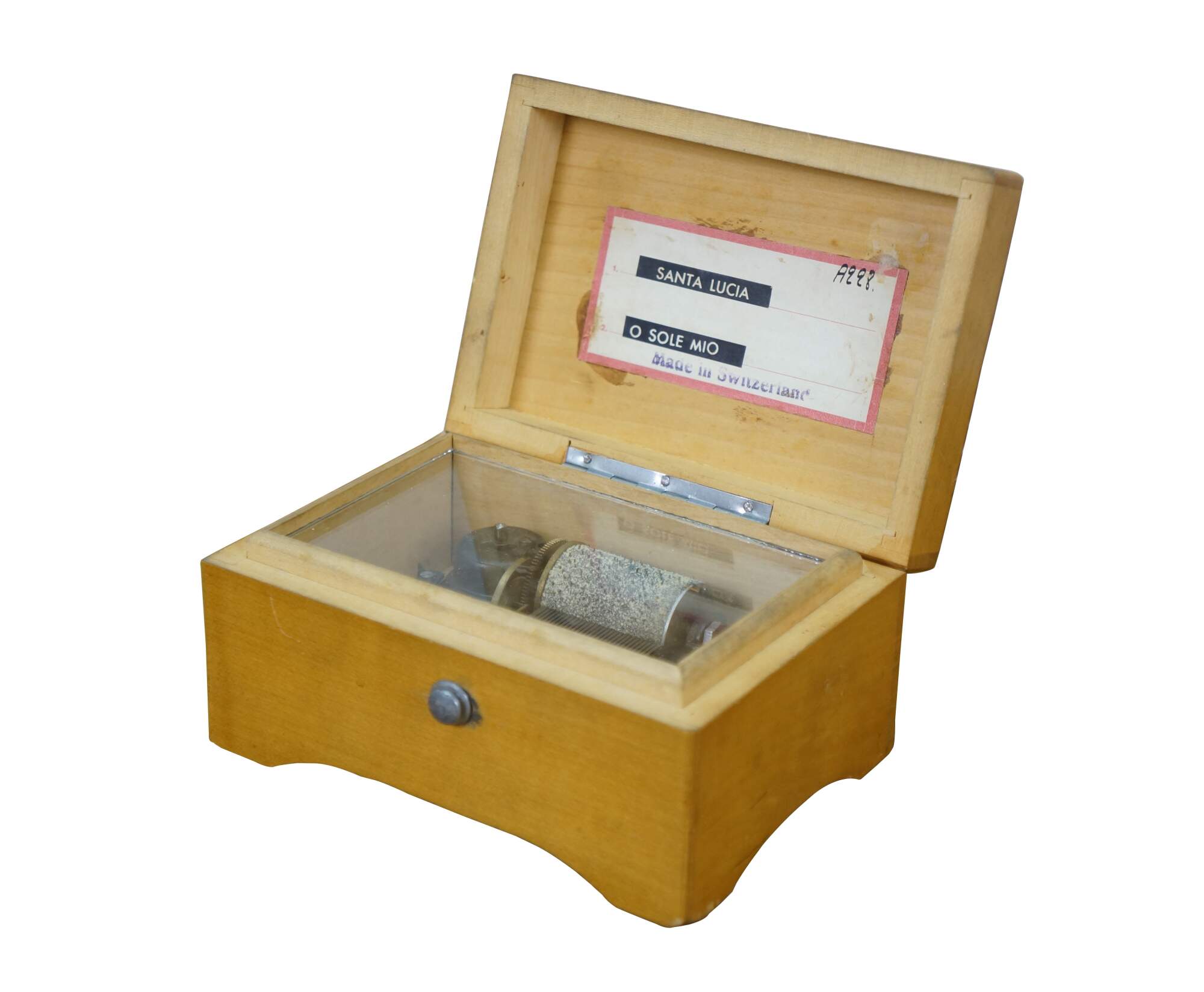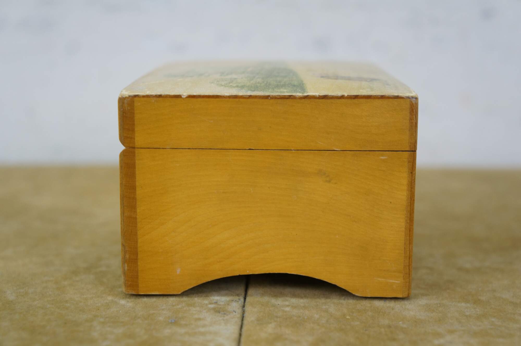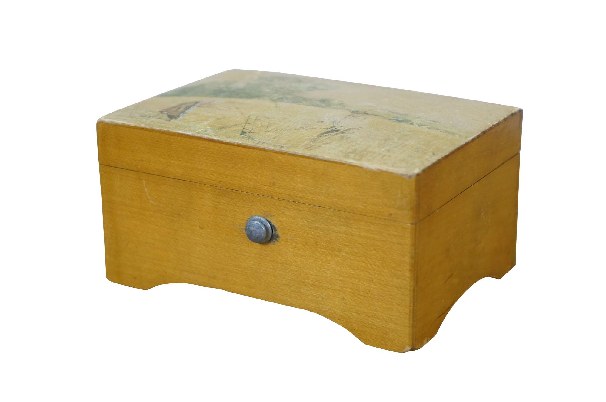 Circa mid 20th century Thorens Co music box - wooden trinket box style with printed image of peasant farmers in a field on the lid. Works displayed under glass inside. Plays two tunes - Santa Lucia and O Sole Mio. Made in Switzerland.