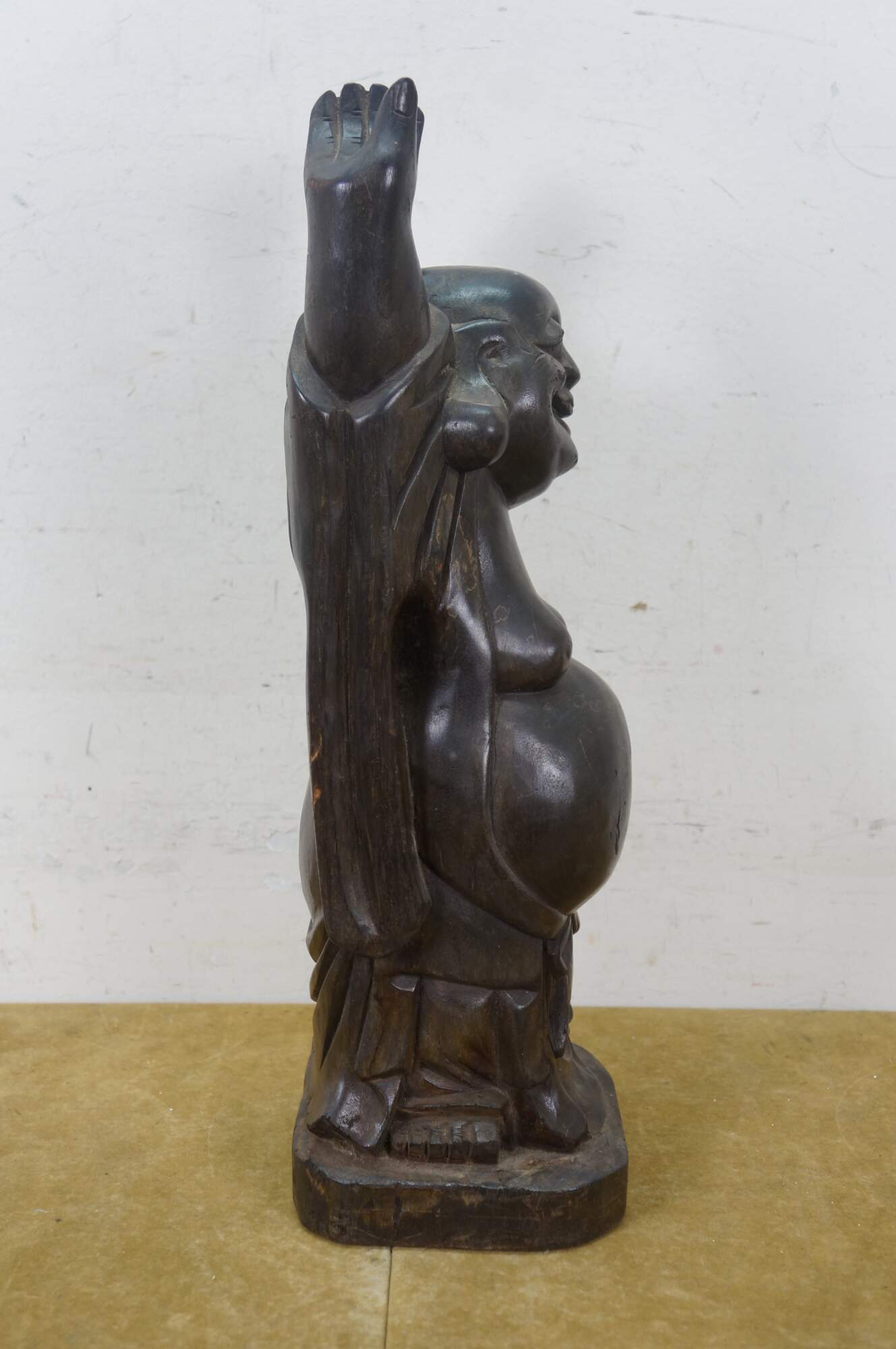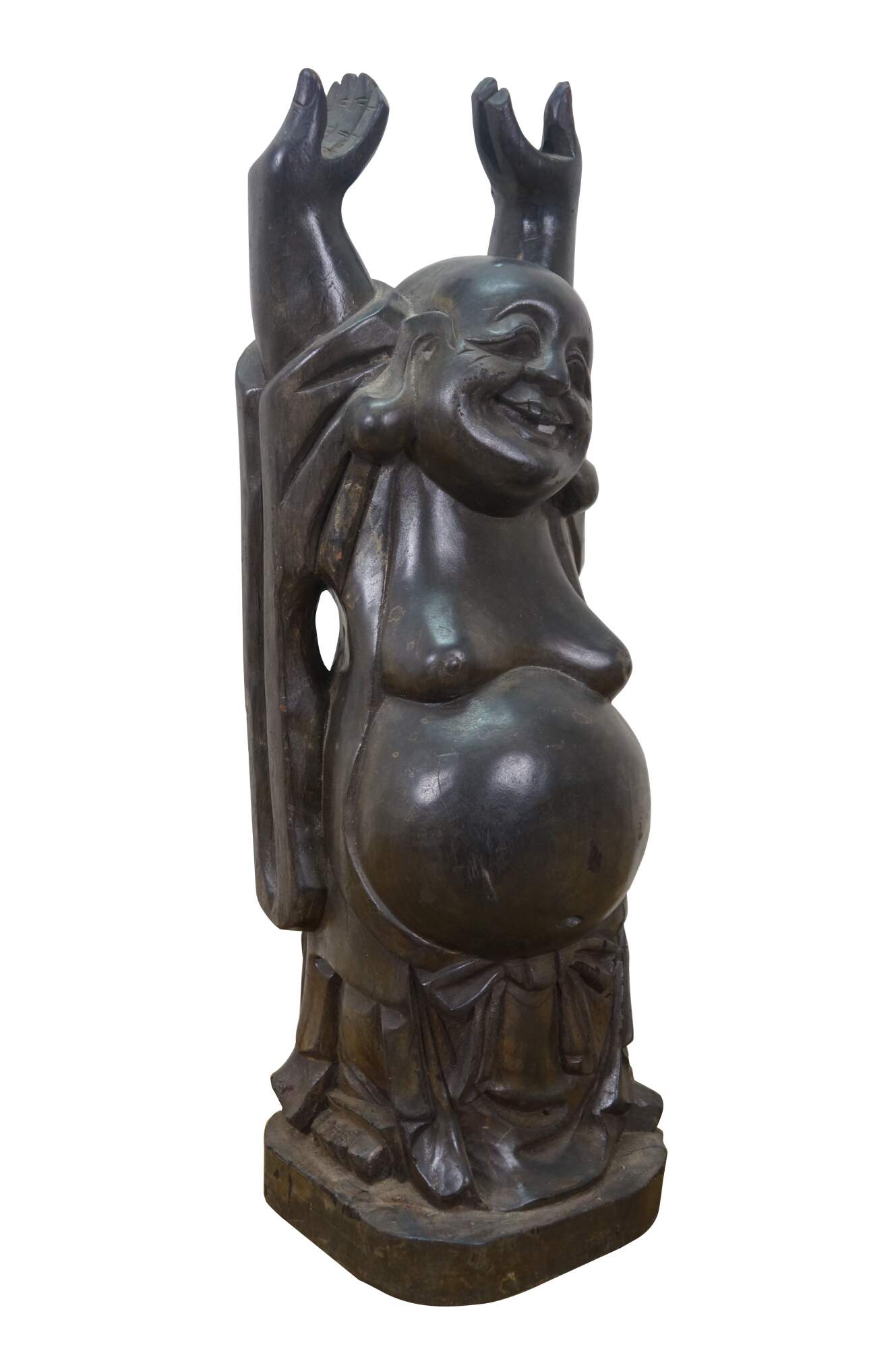 Vintage 20th century Japanese Hotei / Laughing Buddha statue. Standing with arms joyfully raised, this figure is a symbol of happiness, luck, and prosperity. Carved wood with a black finish.