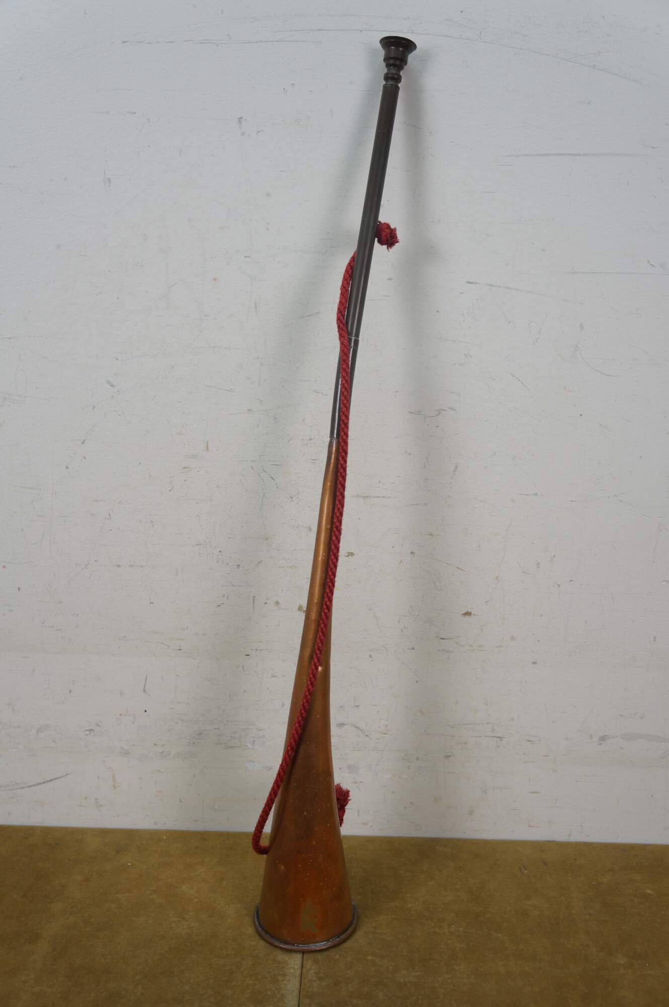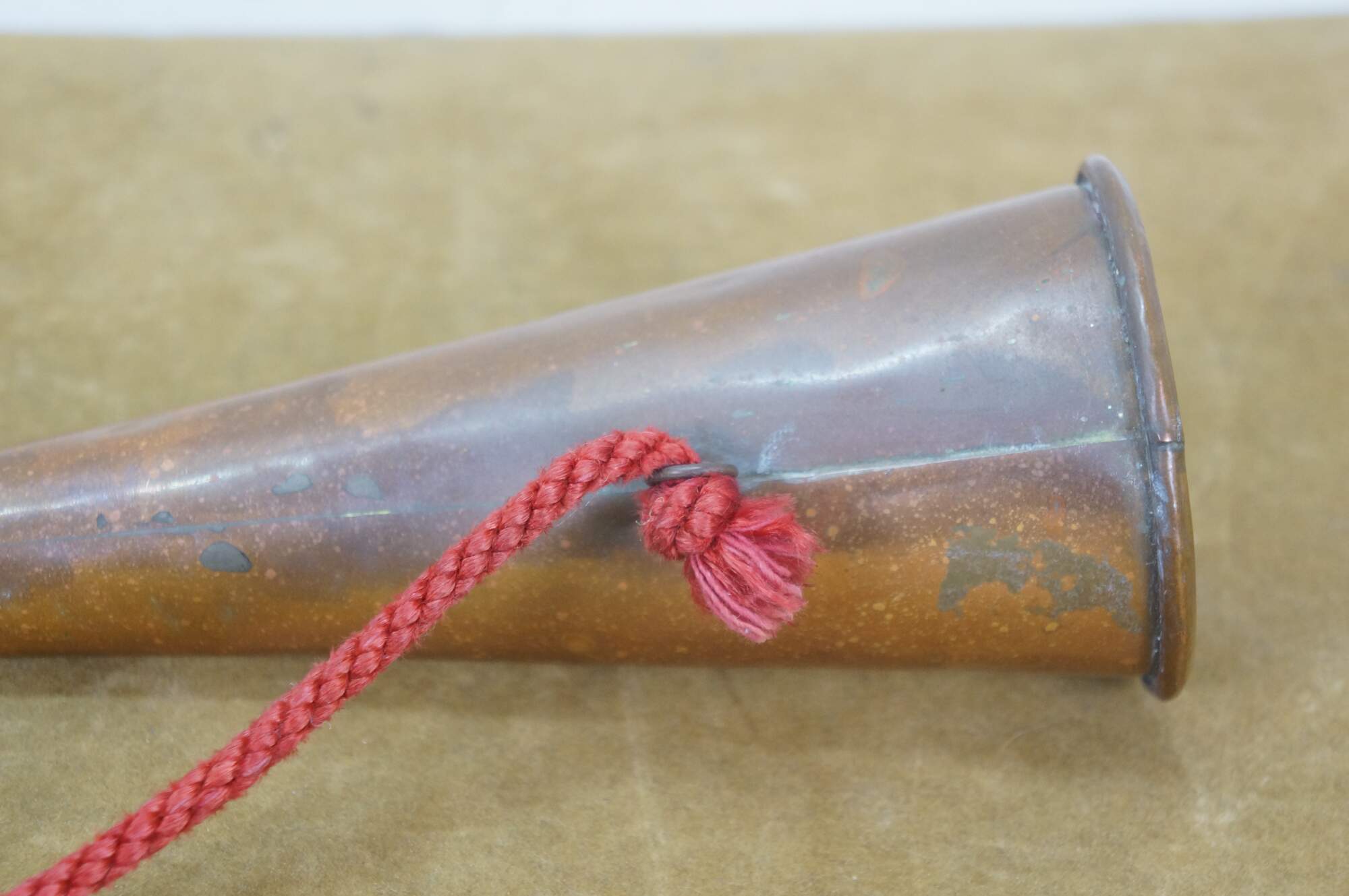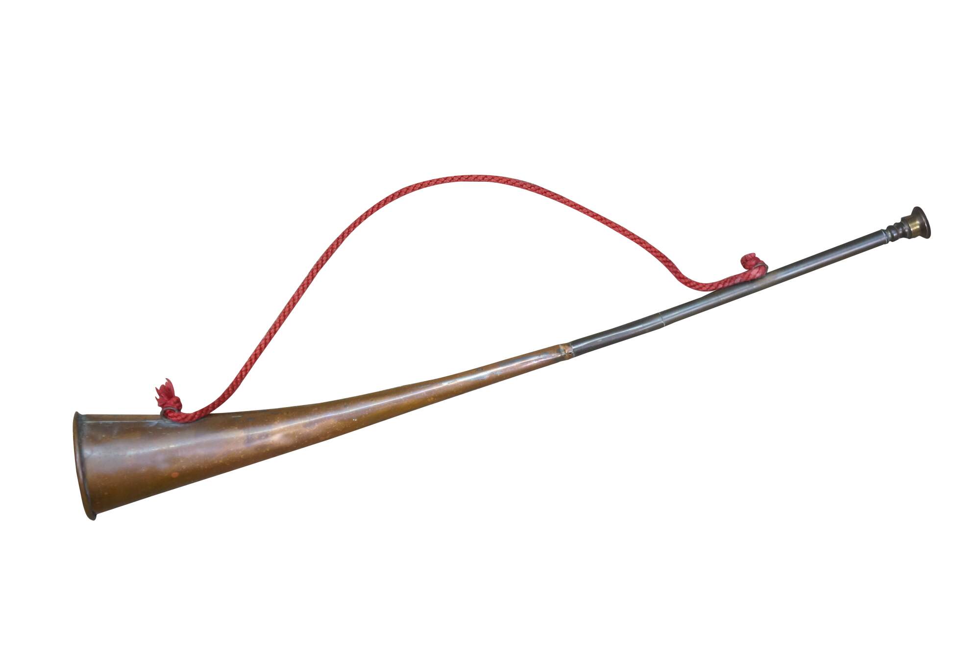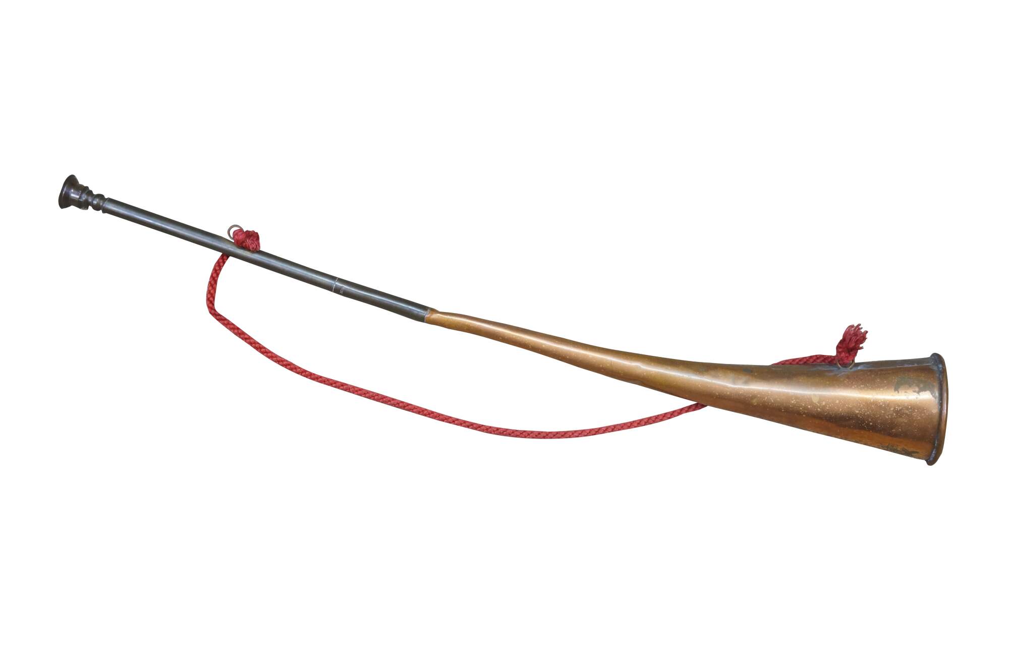 Mid to early 20th century copper coach horn / hunting horn with brass mouthpiece and red cord. Made in England.