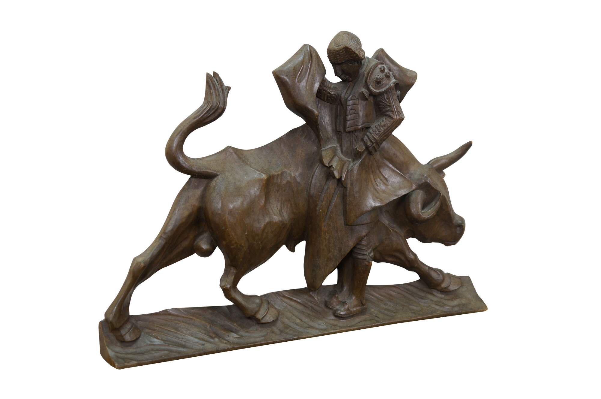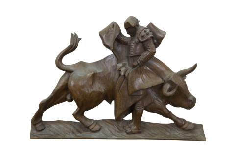 Vintage 20th century hand carved folk art style wall hanging relief depicting a Mexican bull fighter and bull in mid-charge.