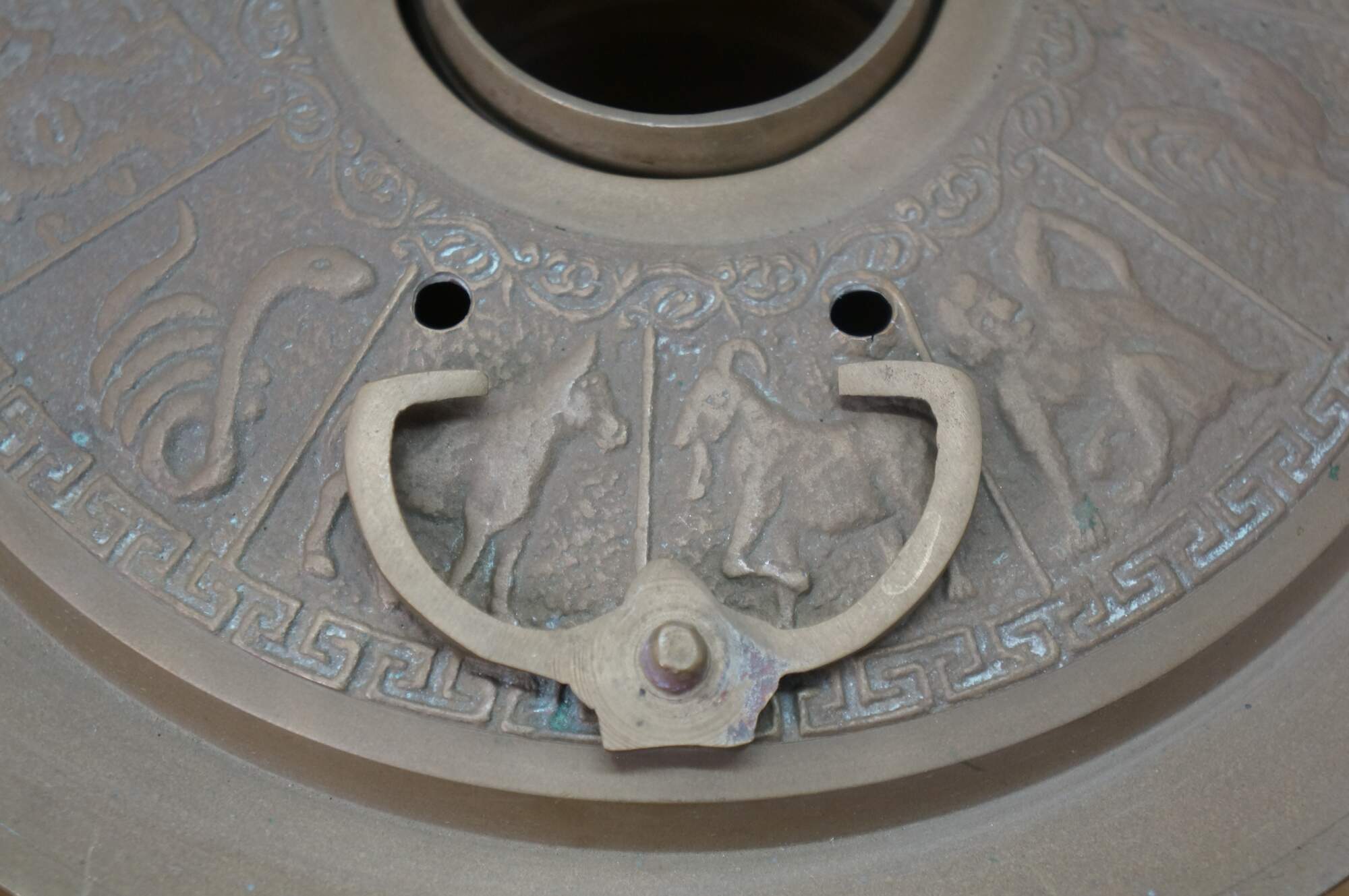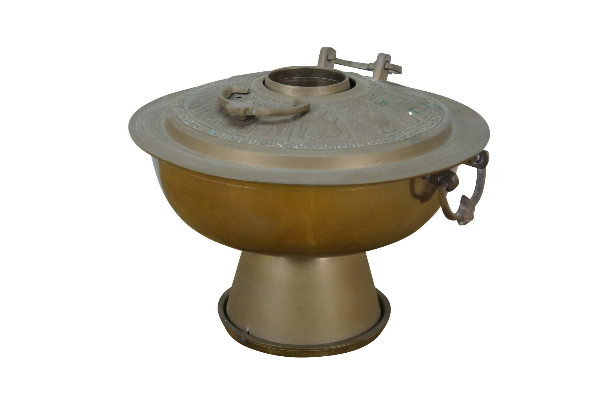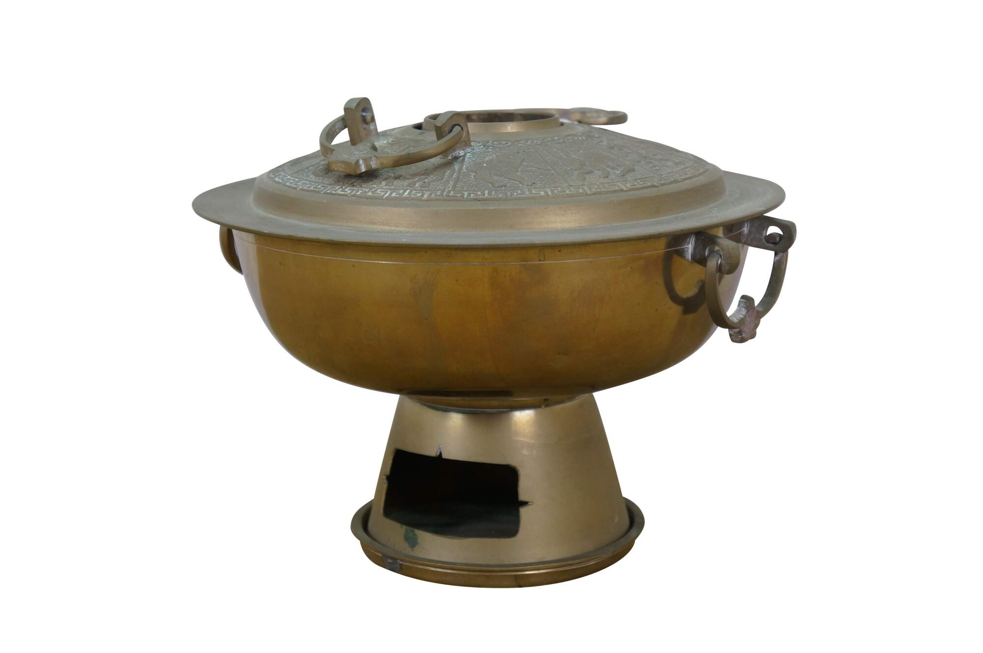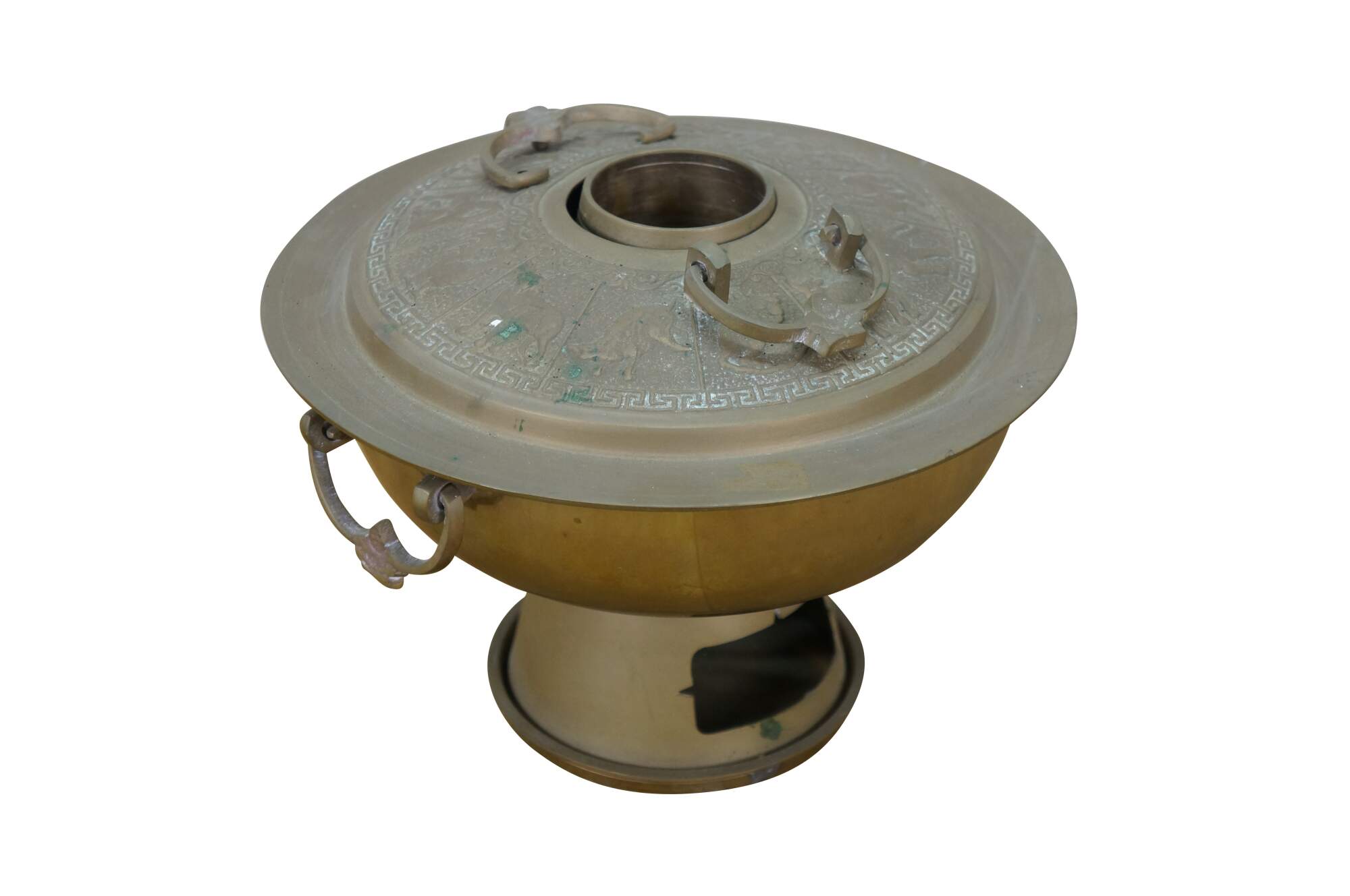 Vintage 20th century Korean brass shin sul ro / sinseollo / hot pot. Round brass pot on an open base with a tube in the center for hot coals, lid, and rotating bail handles. Lid is molded with figures from the korean Zodiac.
