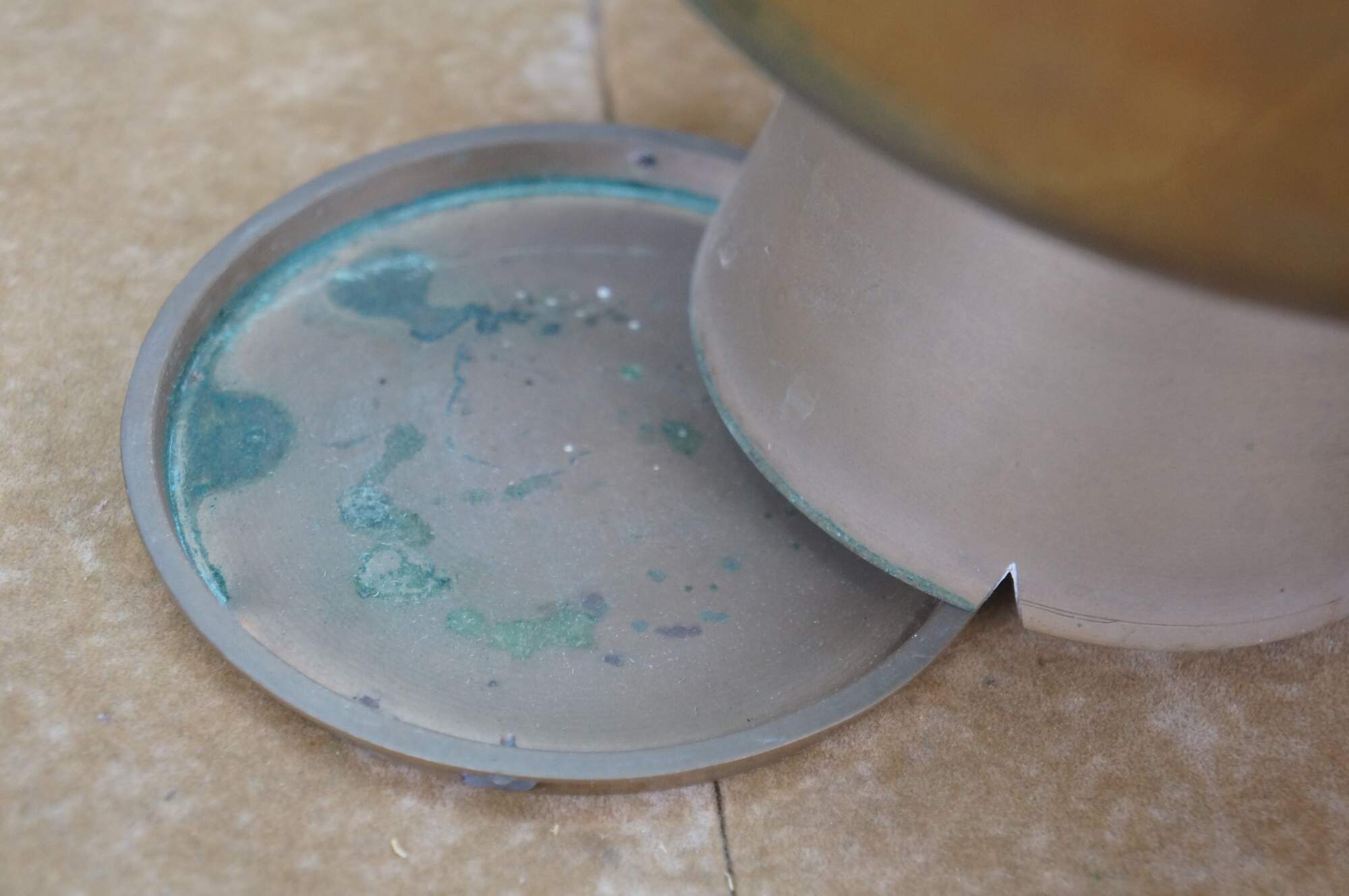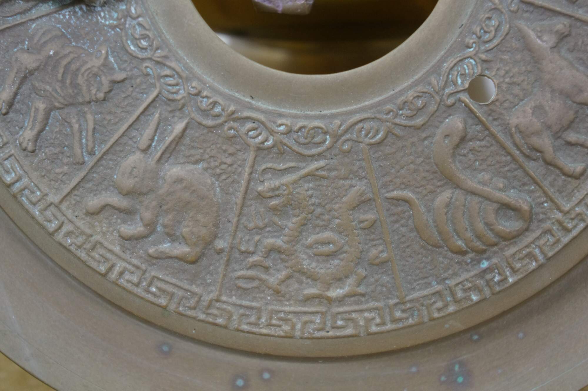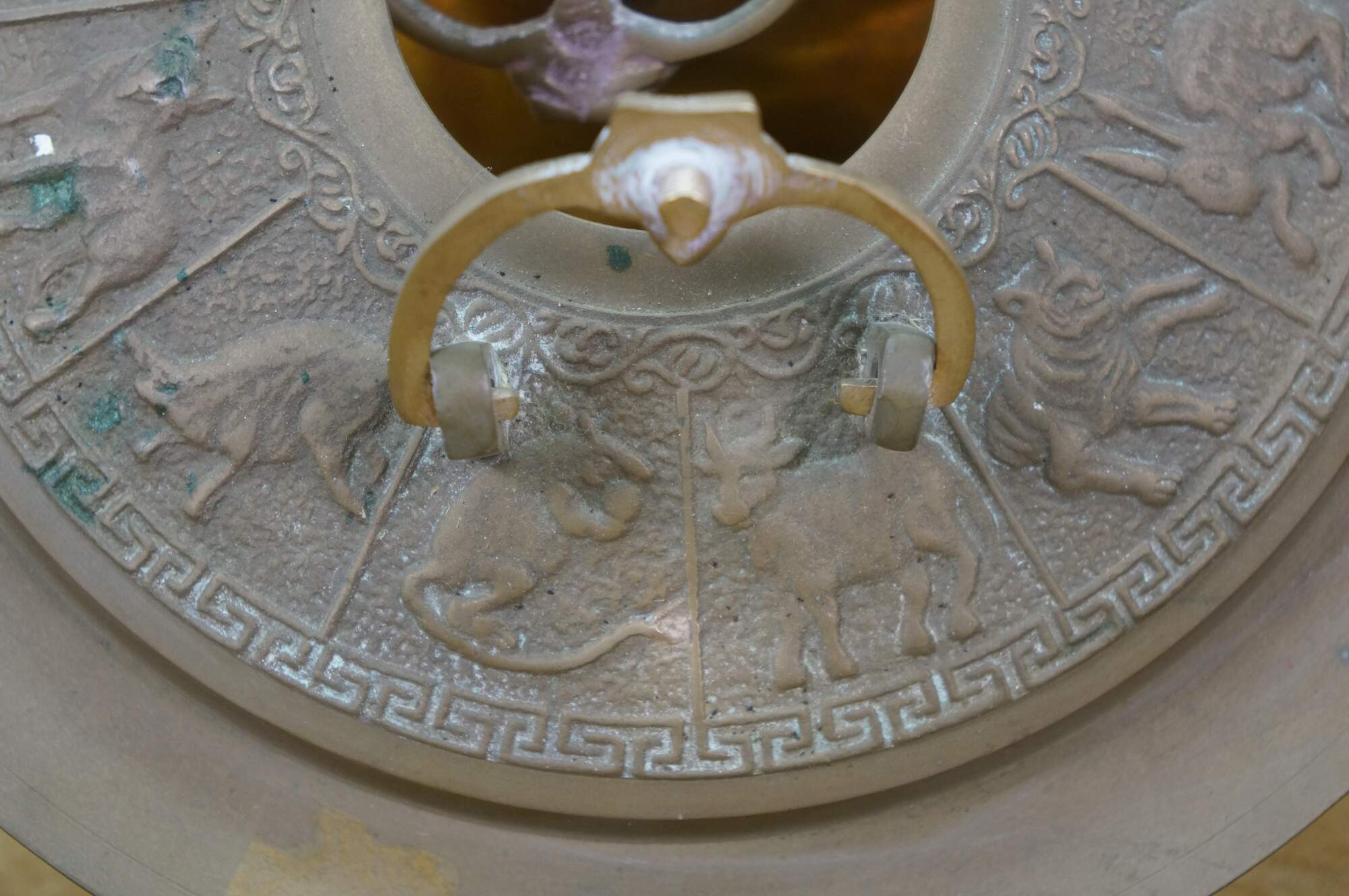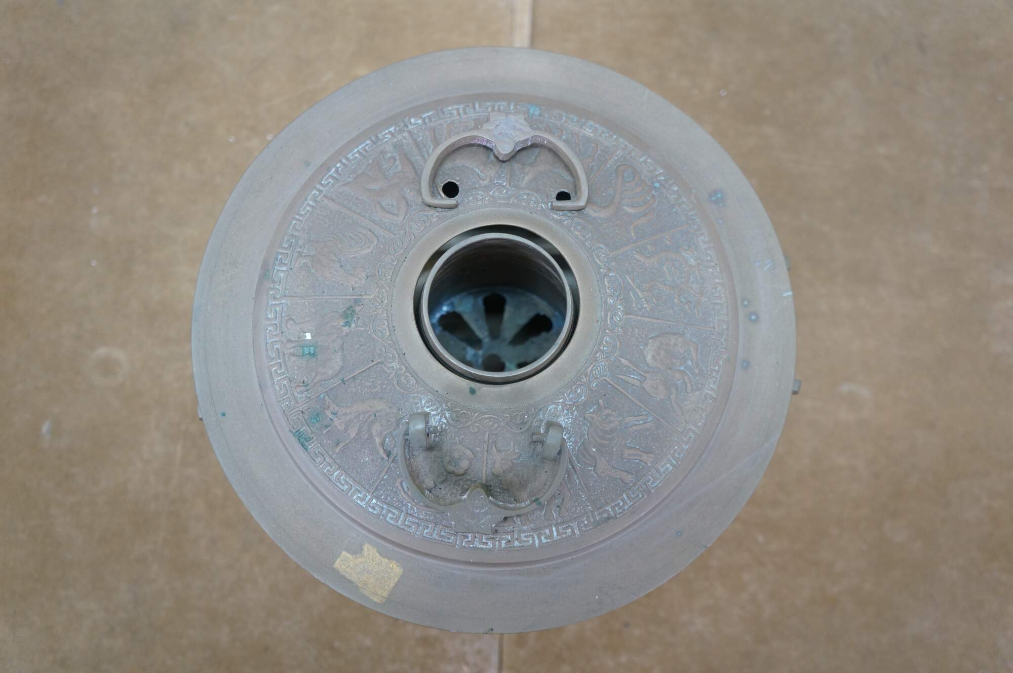 Vintage 20th century Korean brass shin sul ro / sinseollo / hot pot. Round brass pot on an open base with a tube in the center for hot coals, lid, and rotating bail handles. Lid is molded with figures from the korean Zodiac.