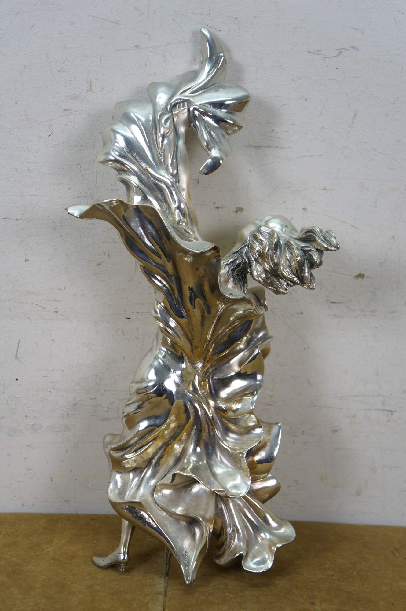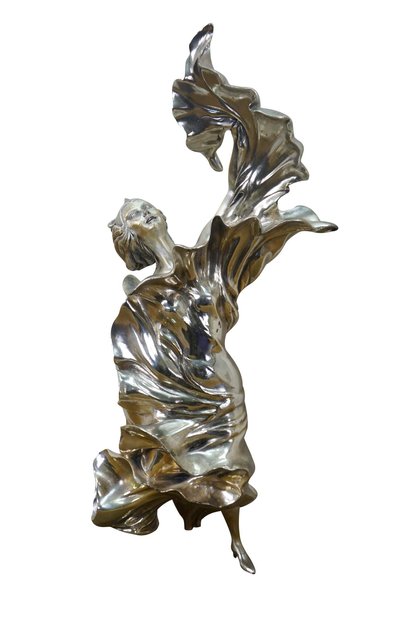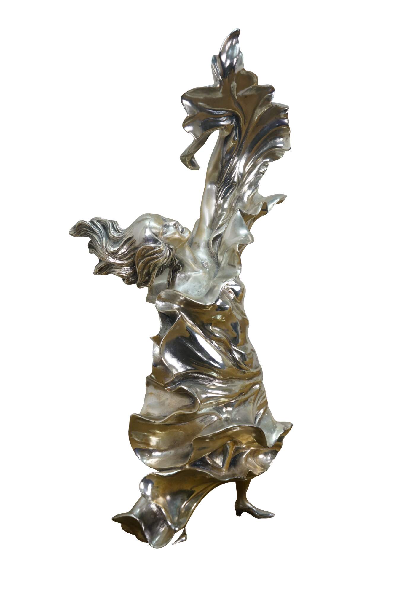 Large vintage Italian Art Nouveau statue / sculpture featuring a woman dancing in billowing fabric. Cast in resin and clad in 925 sterling silver. Marked and signed on base.