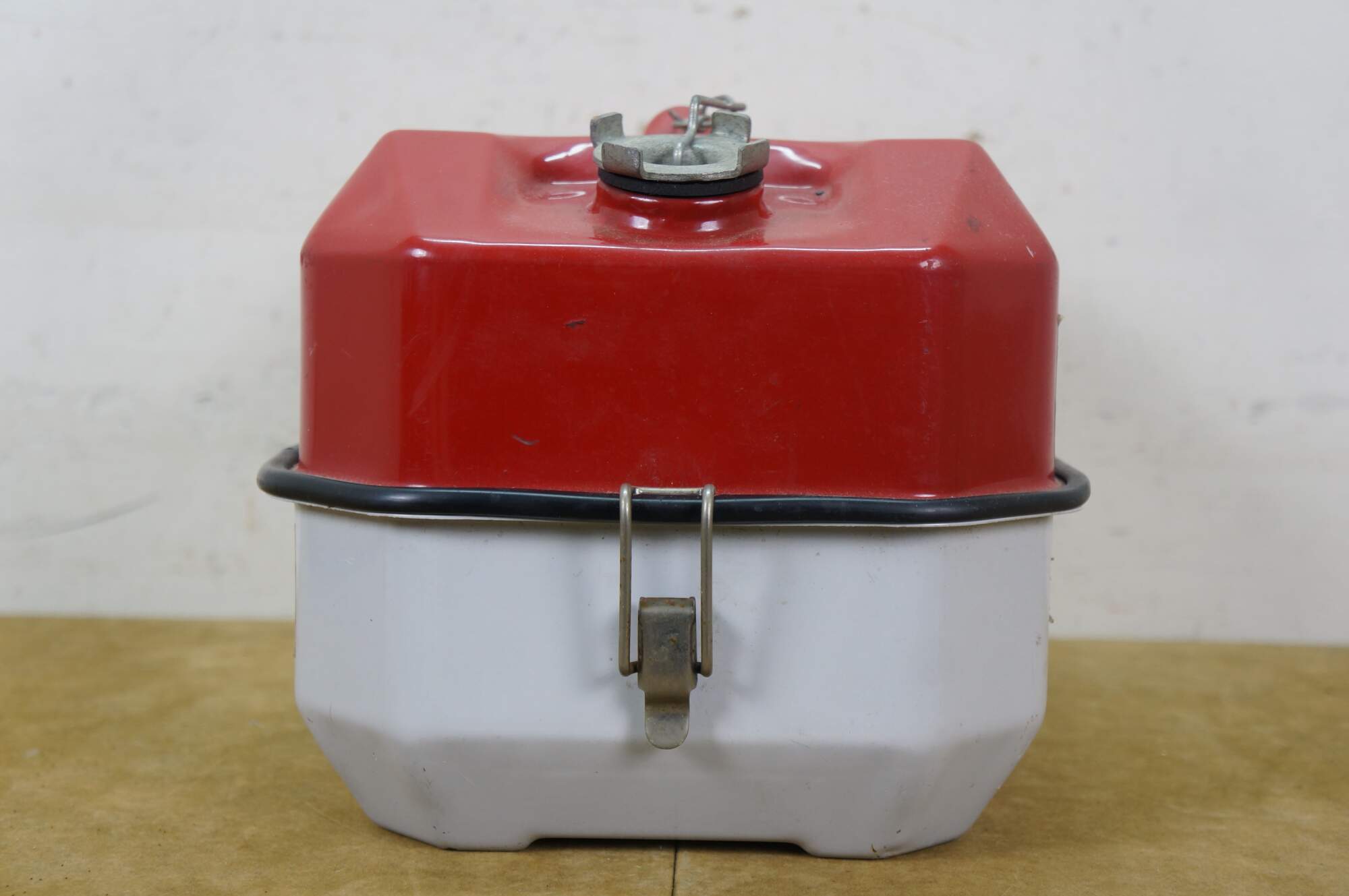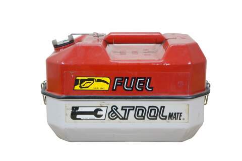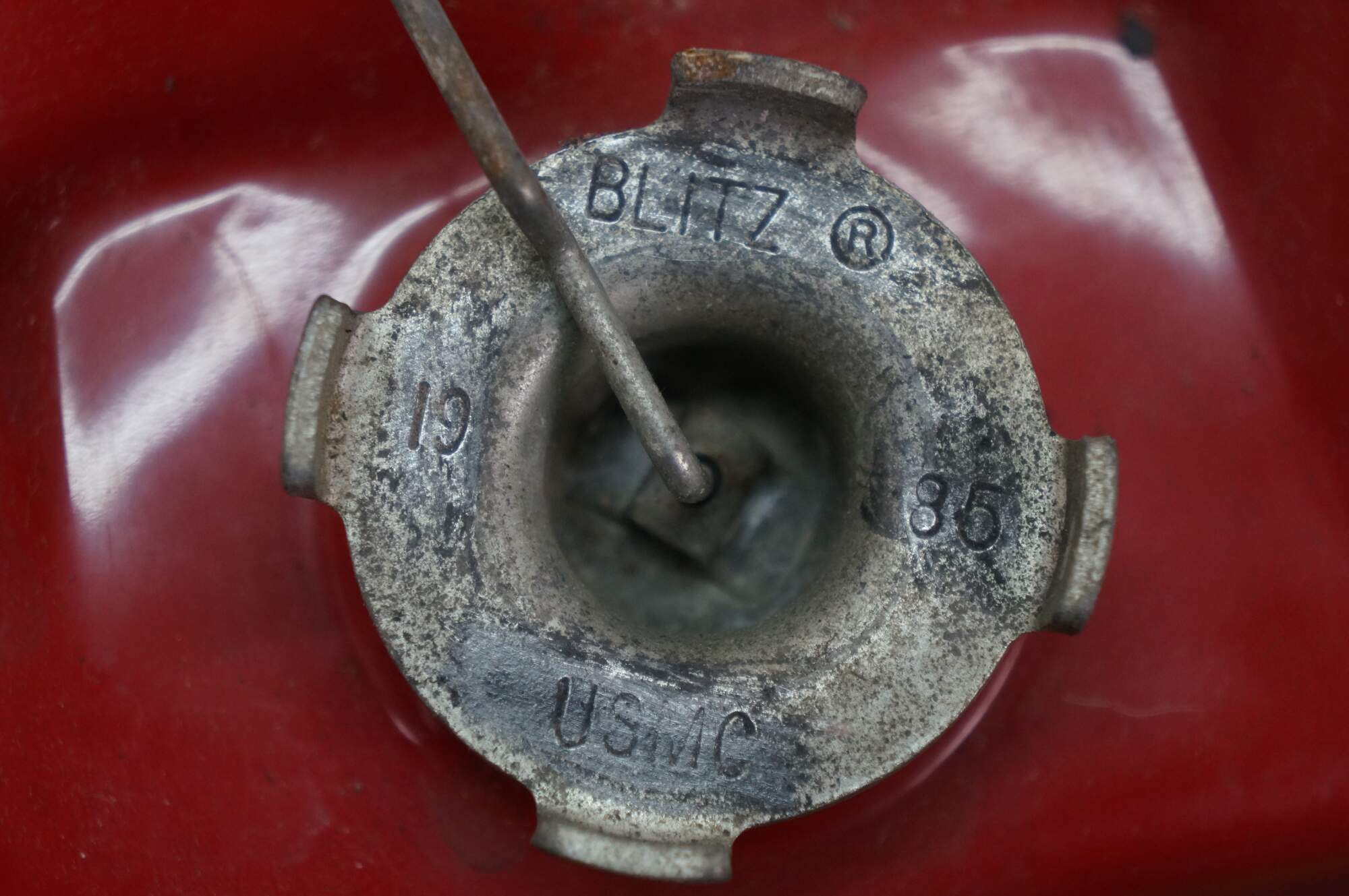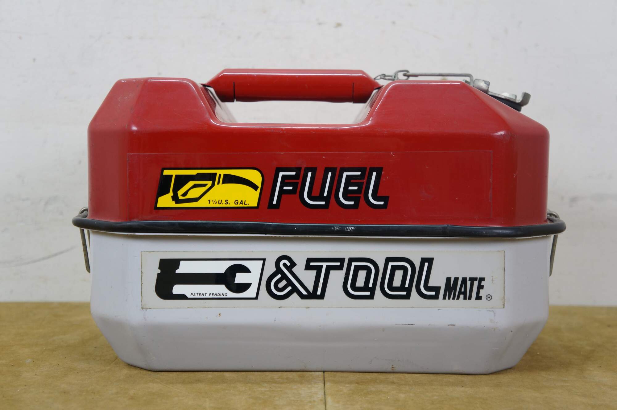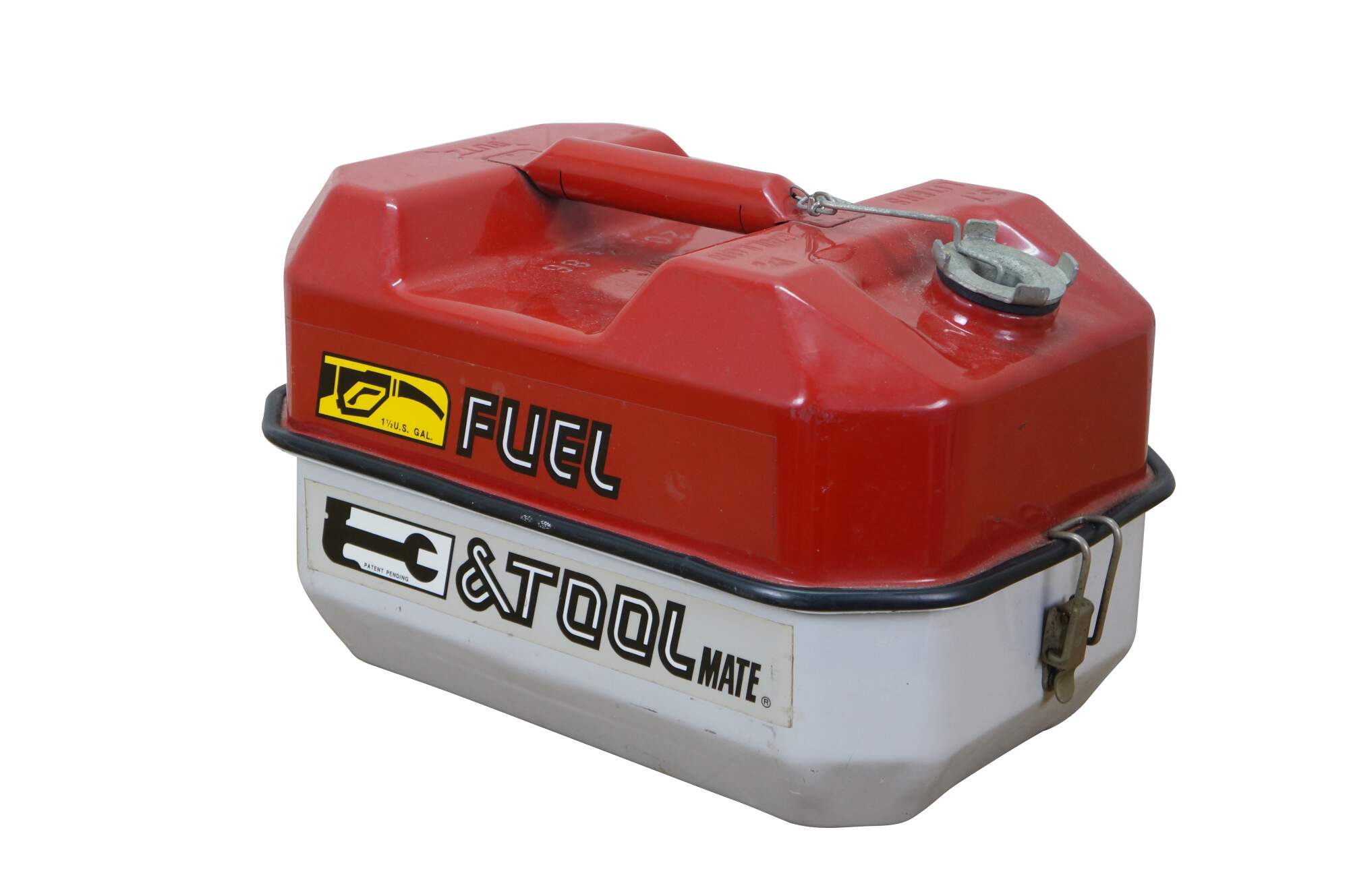 Vintage 1985 Blitz United States Marine Corps Fuel & Tool Mate two part combination gasoline can and tool box. Red upper section is a 1.5 Gallon / 5.7 Liters gasoline container with attached screw top and detachable spout. White tool chest base clamps to the top portion with two clasps. DOT-5L / USMC / 20 1 1/8 86 / Blitz / 1985.