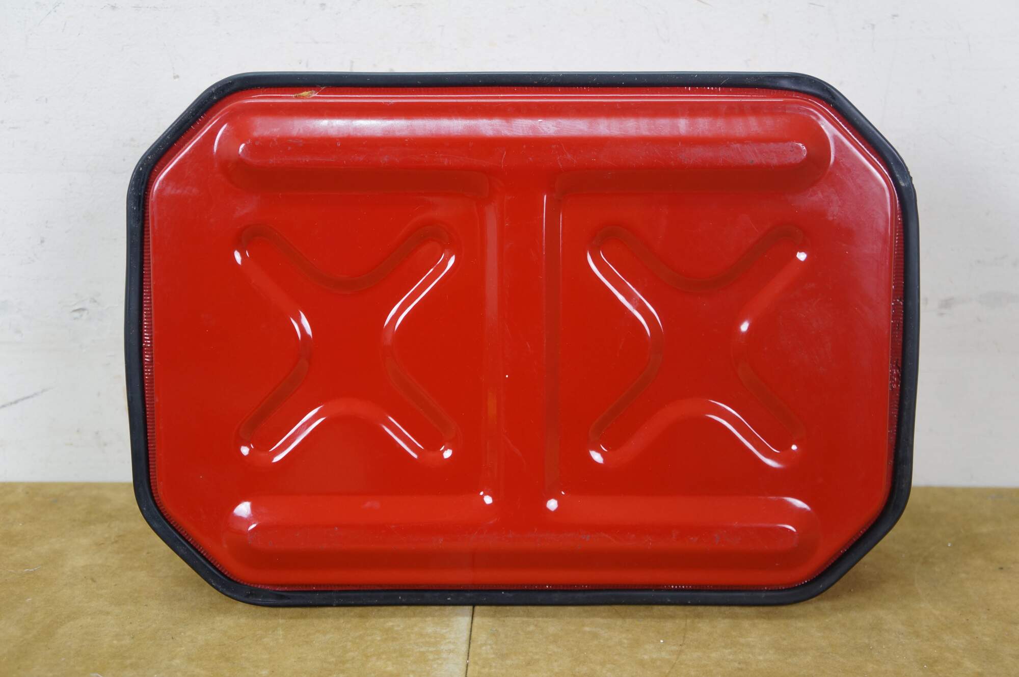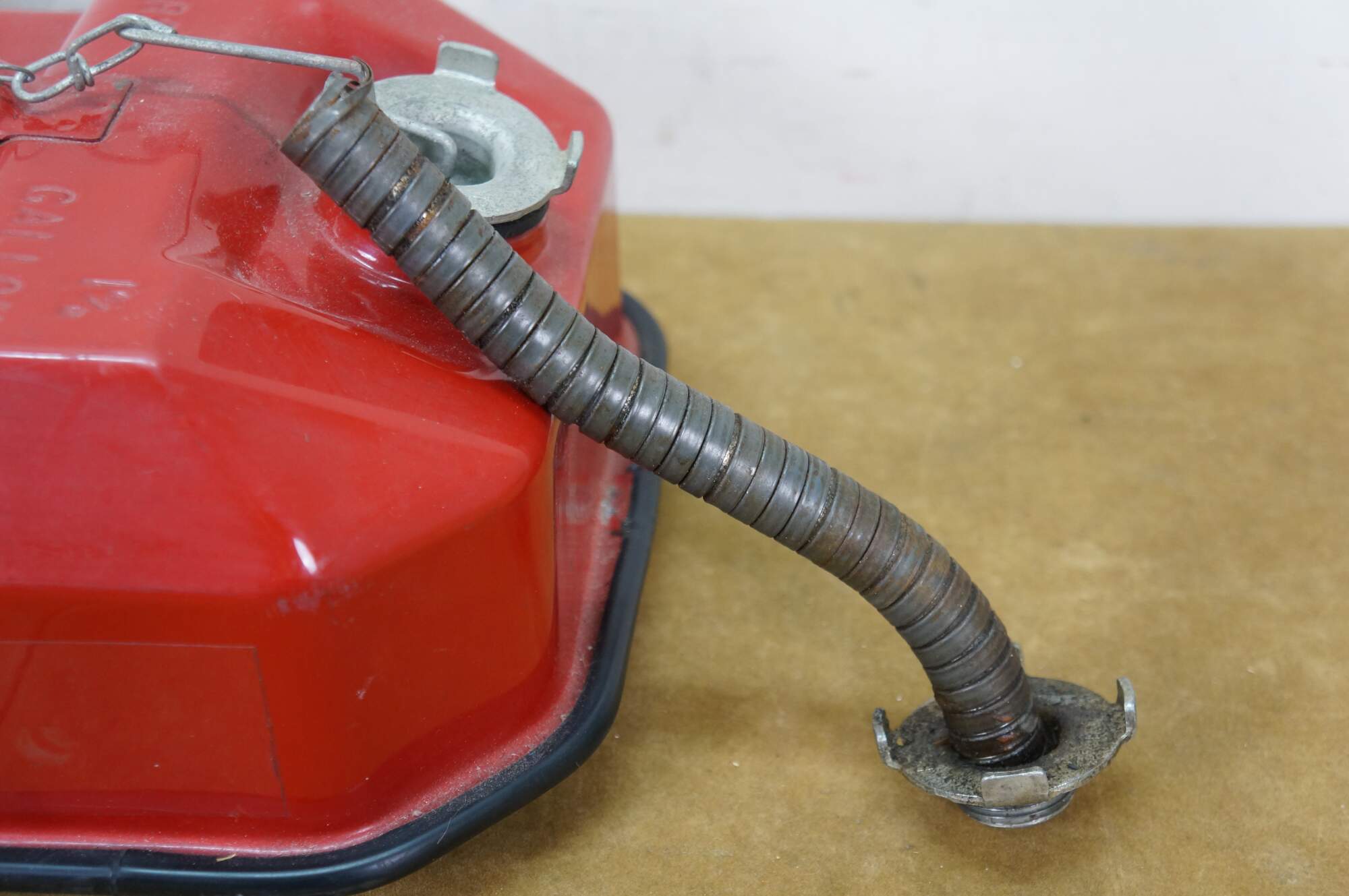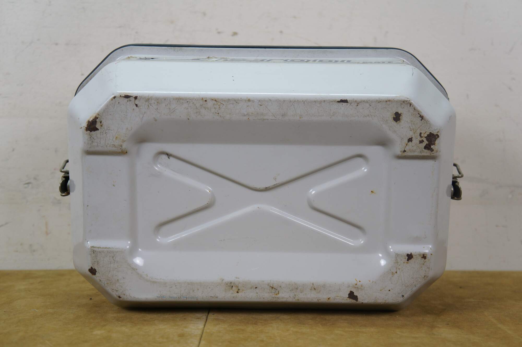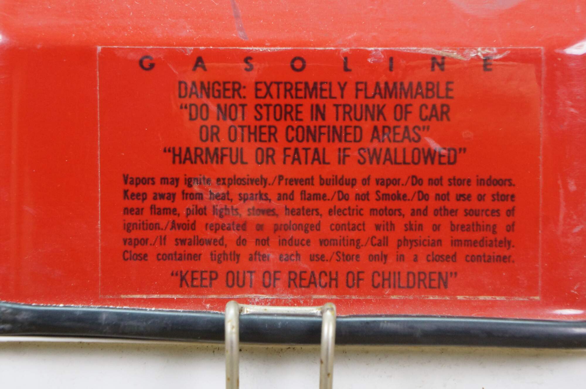 Vintage 1985 Blitz United States Marine Corps Fuel & Tool Mate two part combination gasoline can and tool box. Red upper section is a 1.5 Gallon / 5.7 Liters gasoline container with attached screw top and detachable spout. White tool chest base clamps to the top portion with two clasps. DOT-5L / USMC / 20 1 1/8 86 / Blitz / 1985.