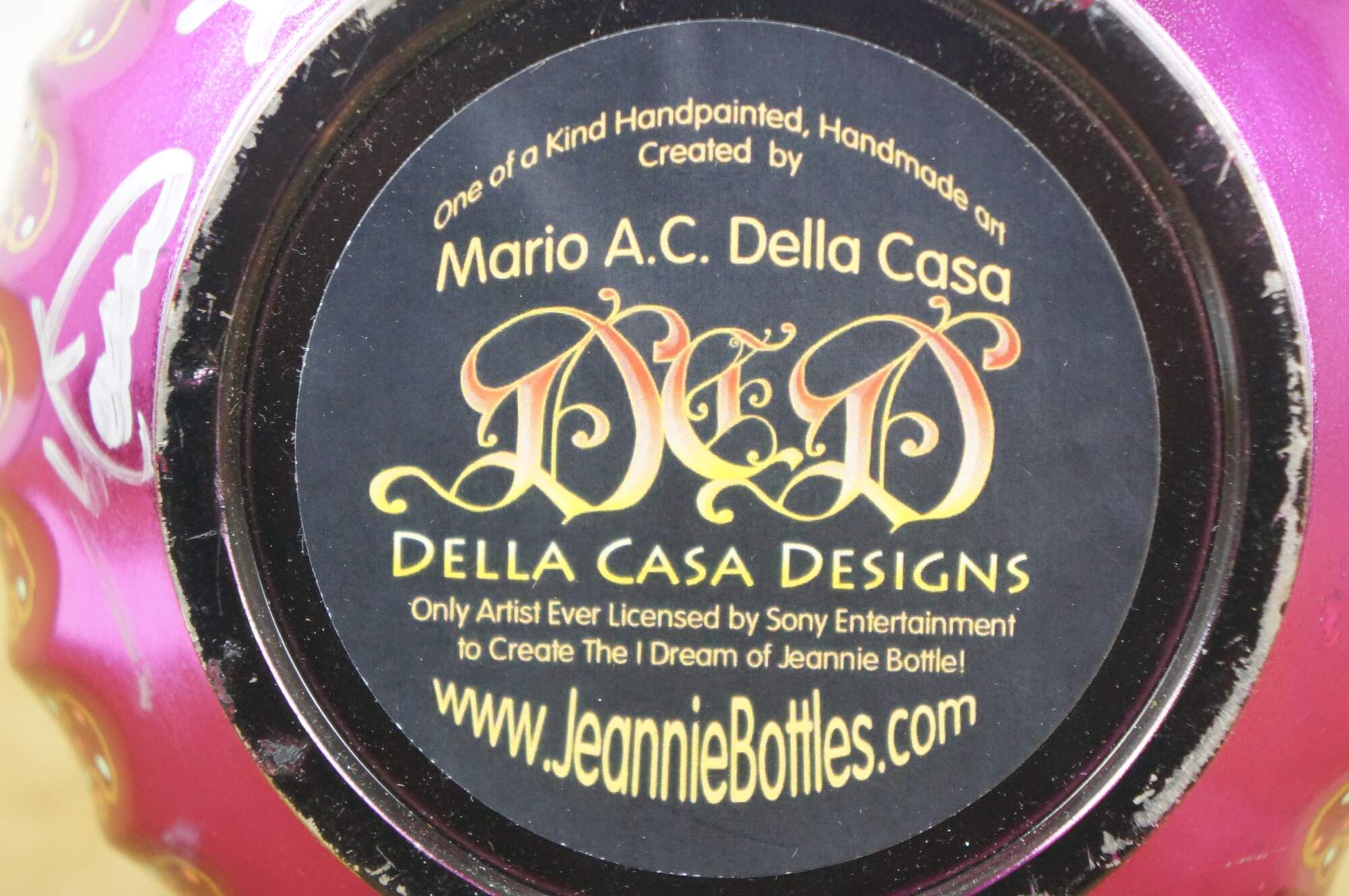 Very rare cast autographed "I Dream of Jeannie" Jeannie (genie) decanter bottle. Mirrored mulberry / purple / pink Middle Eastern inspired bottle hand painted with gold, white, coral and turquoise mimicking the prop used on the show from the Second Season onward, hand crafted and signed by Mario A.C. Della Casa of Della Casa Designs. Autographed at Dragon Con 2010 by Barbara Eden (Jeannie), Larry Hagman (Tony Nelson), and Bill Daily (Capt. Roger Healy). Includes photograph taken by original owner of the three actors at their Dragon Con panel.