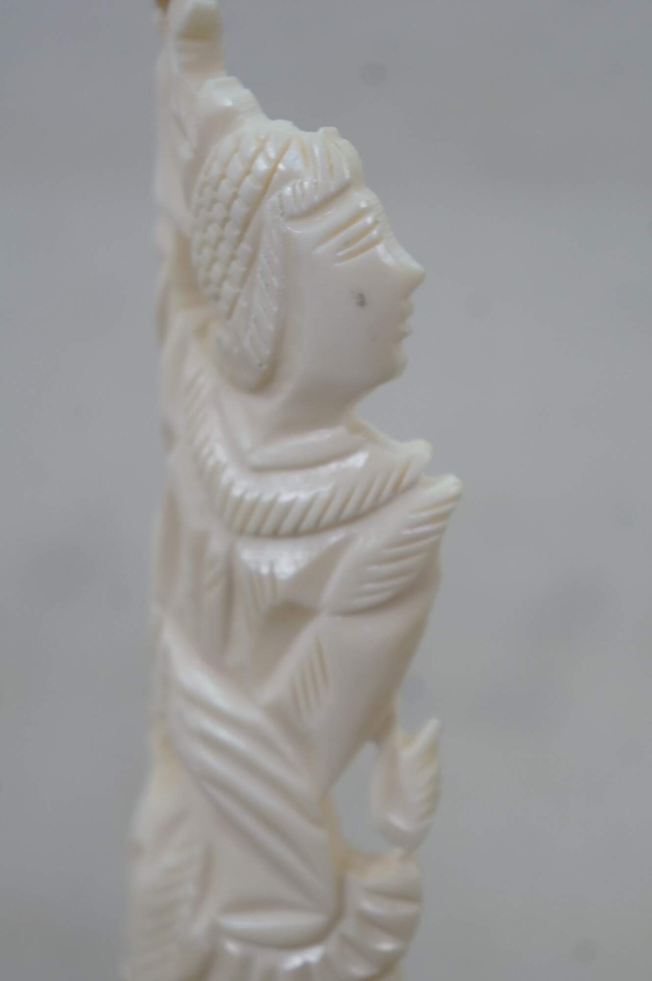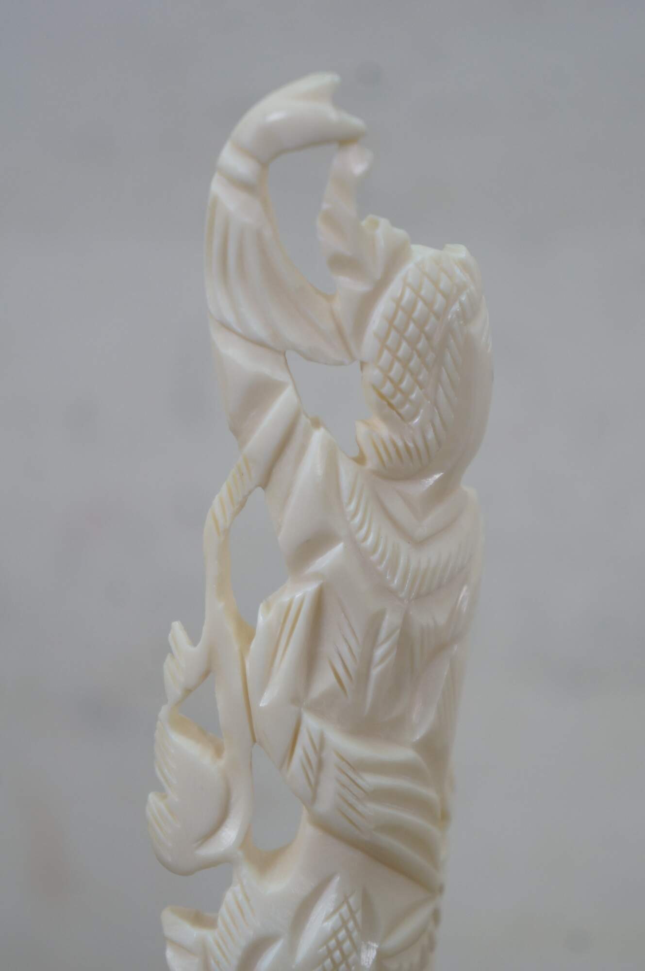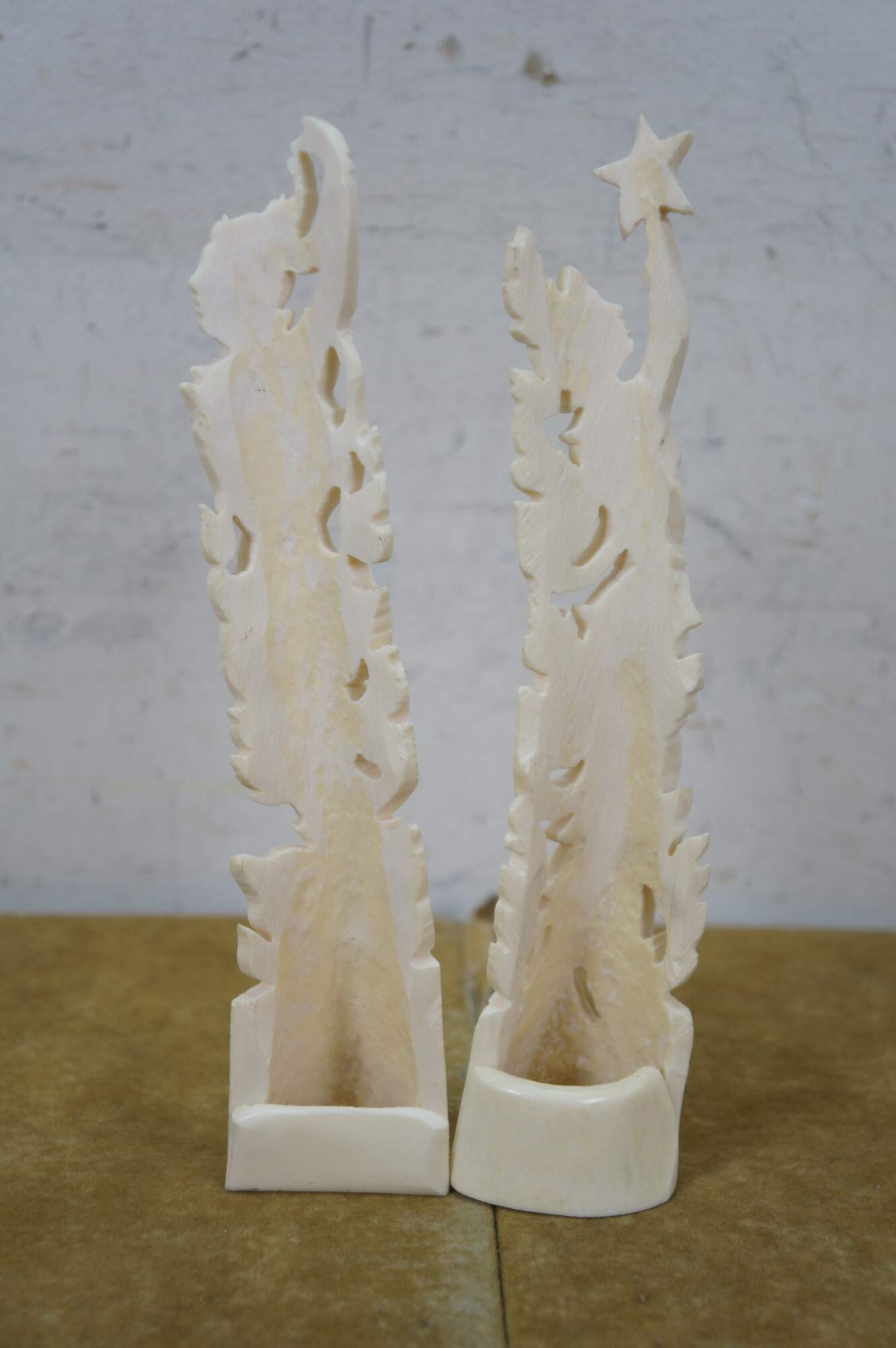 Mid to late 20th century pair of Indonesian dancing god / goddess "totem" sculptures / figurines / tree toppers. Hand carved from the bones of a cow.