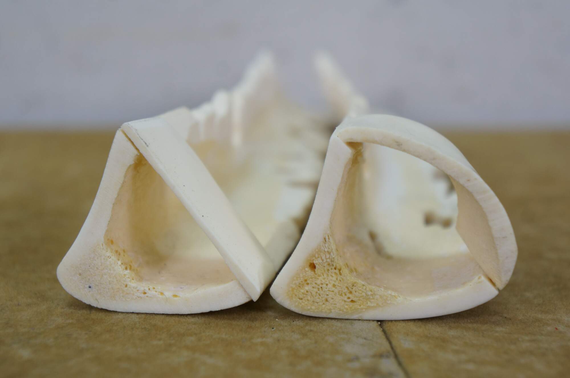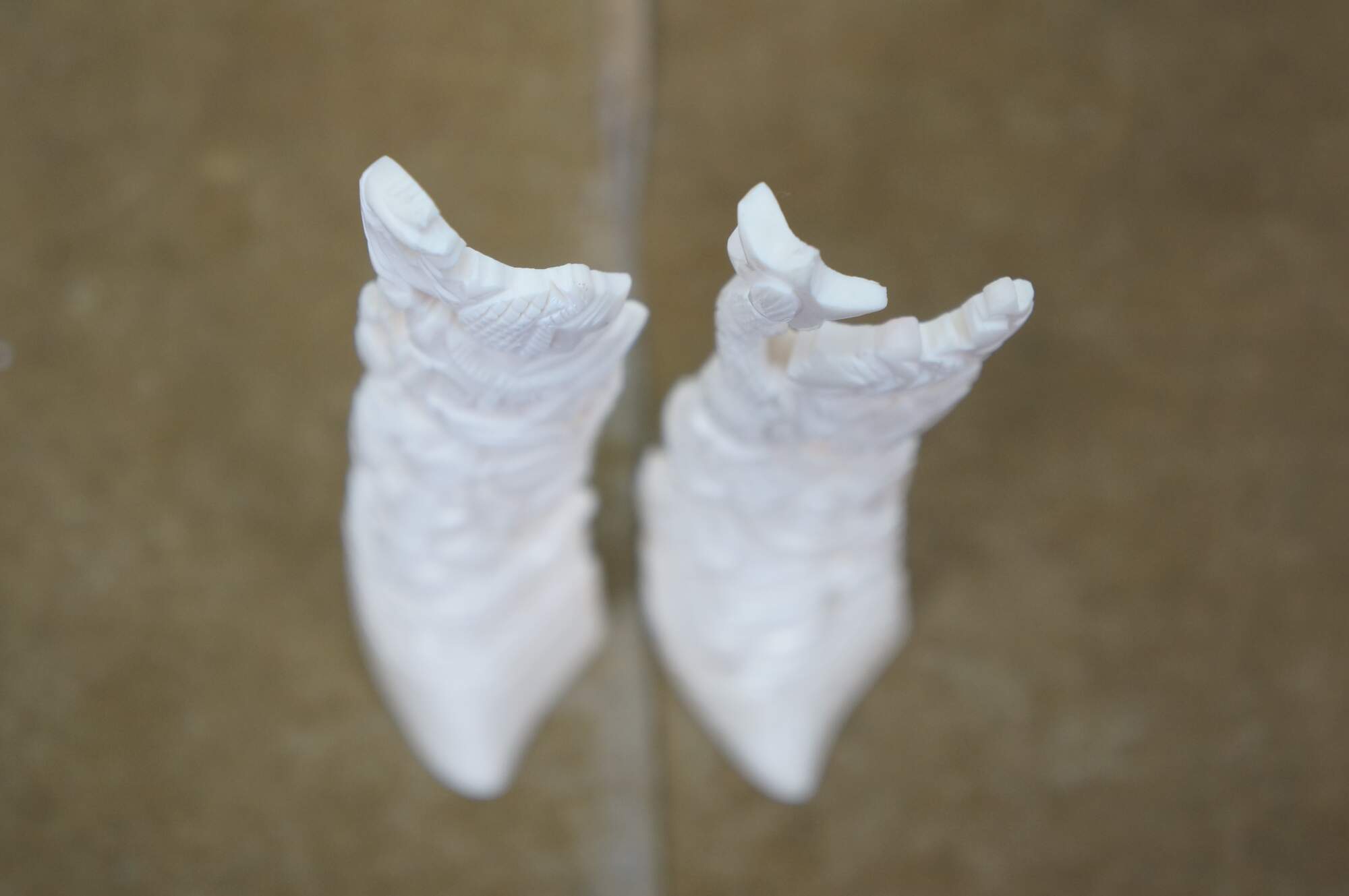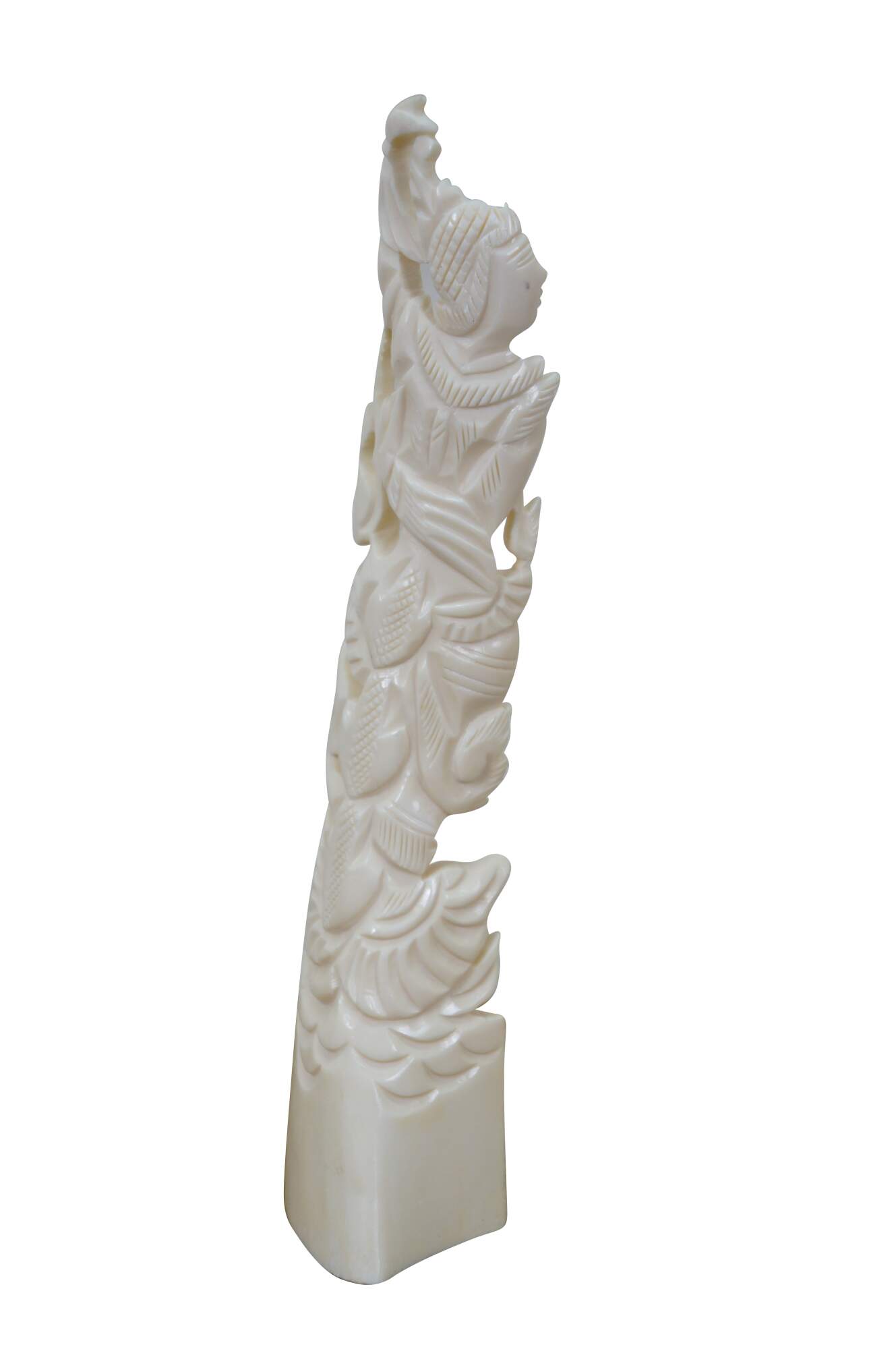Mid to late 20th century pair of Indonesian dancing god / goddess "totem" sculptures / figurines / tree toppers. Hand carved from the bones of a cow.