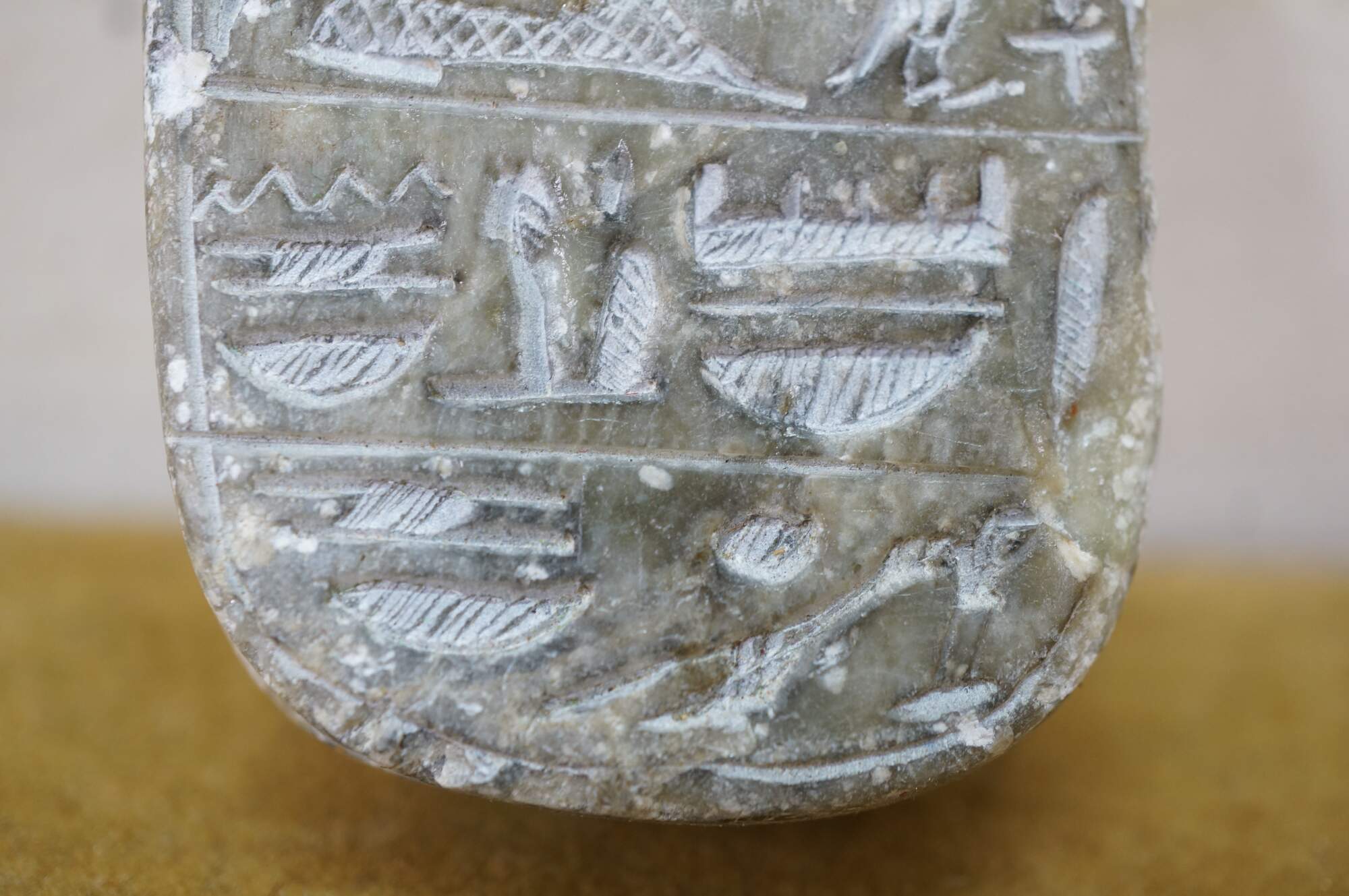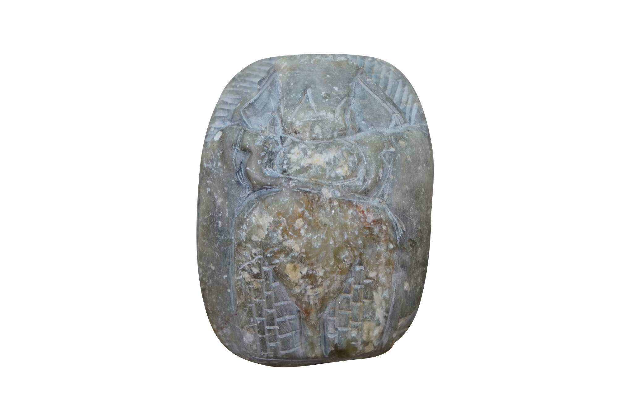Vintage carved quartz stone Egyptian amulet in the shape of a scarab beetle with a flat back inscribed with hieroglyphs.
