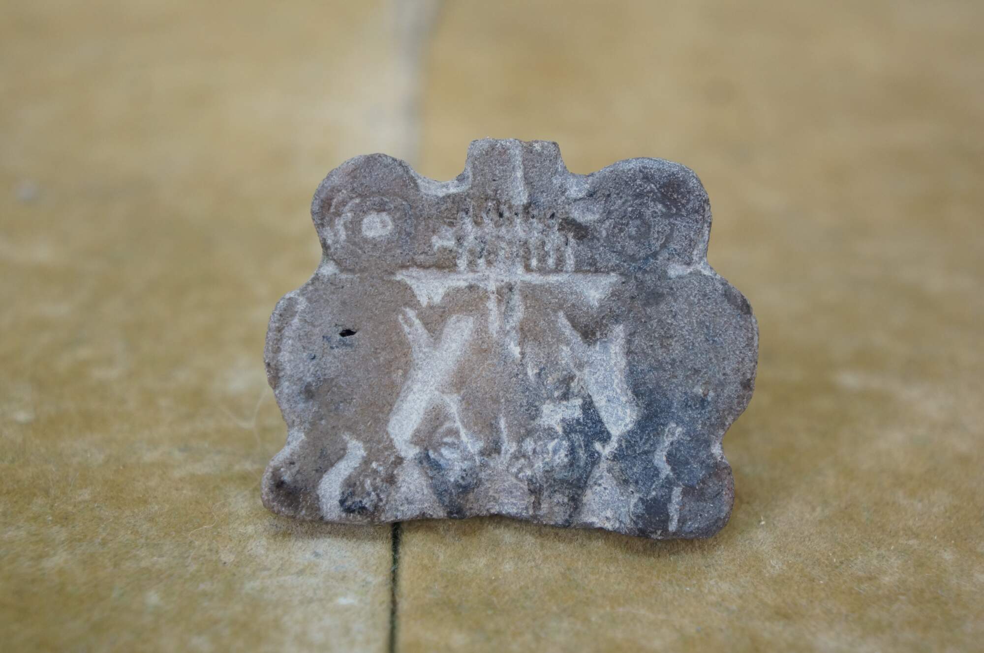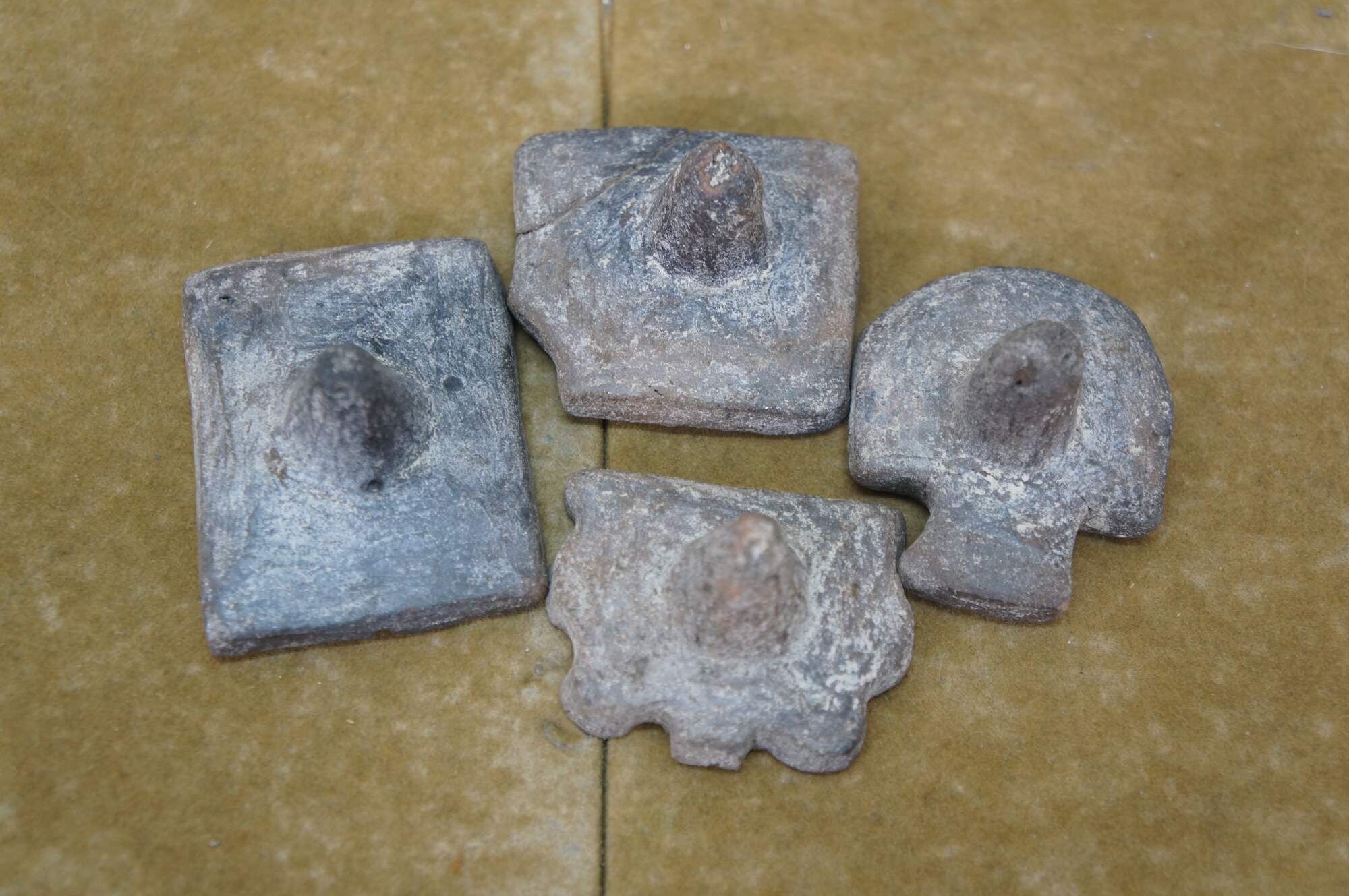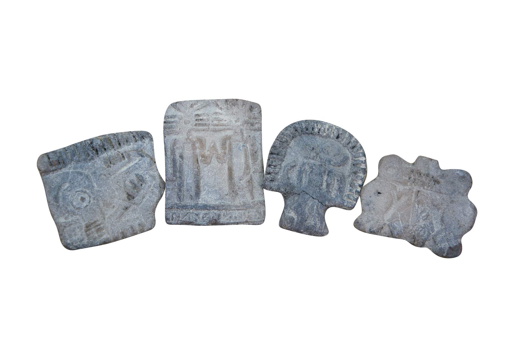 Set of four Pre-Columbian carved stone / terracotta pictoral seals or stamps. Several shapes showing a variety of Aztec / Mayan folk art figures, with handle on reverse.