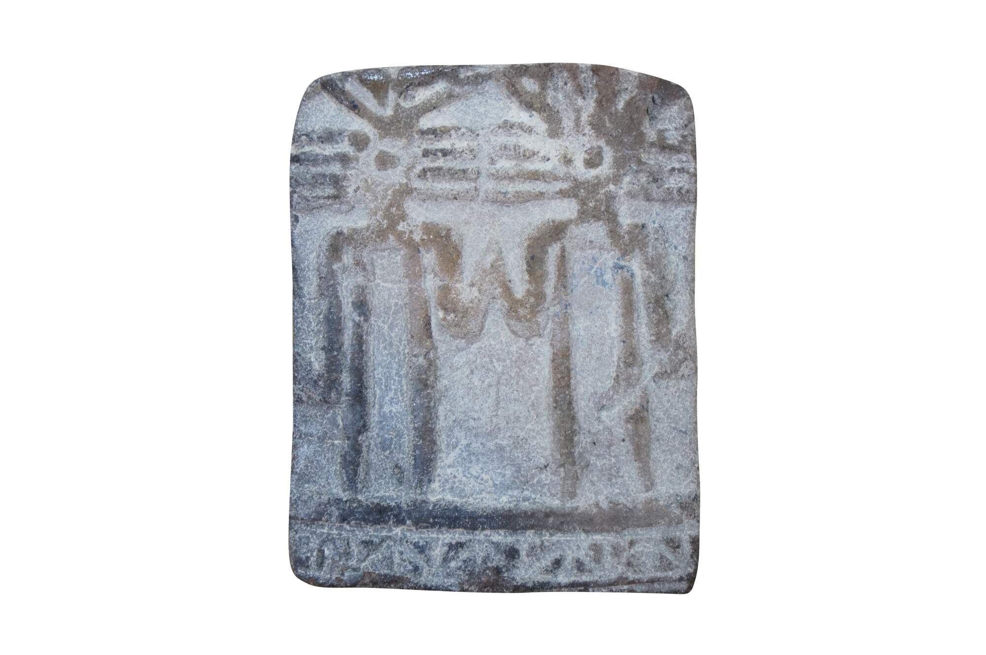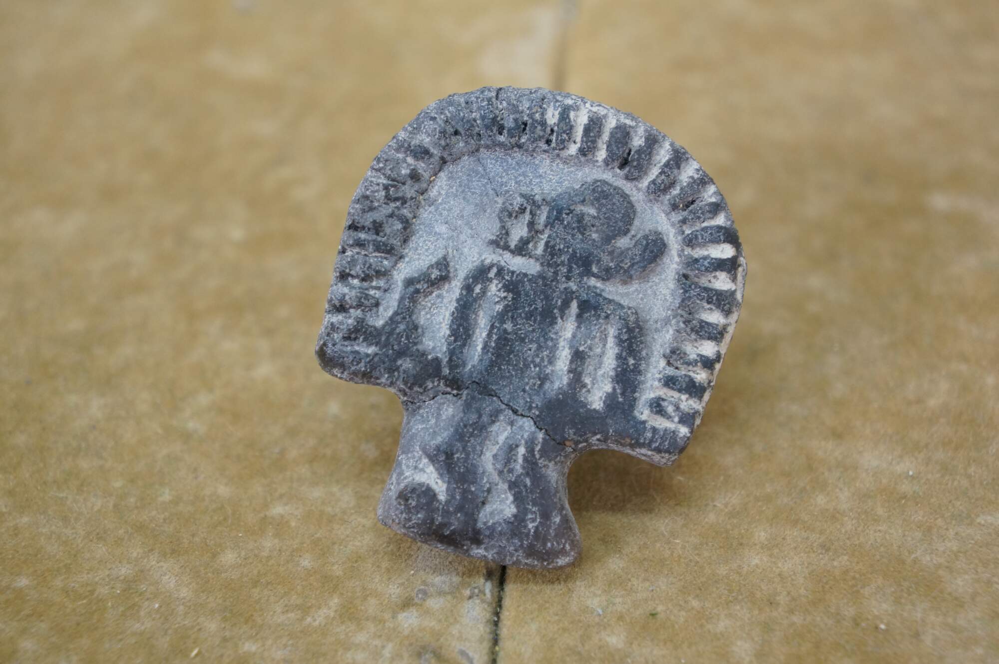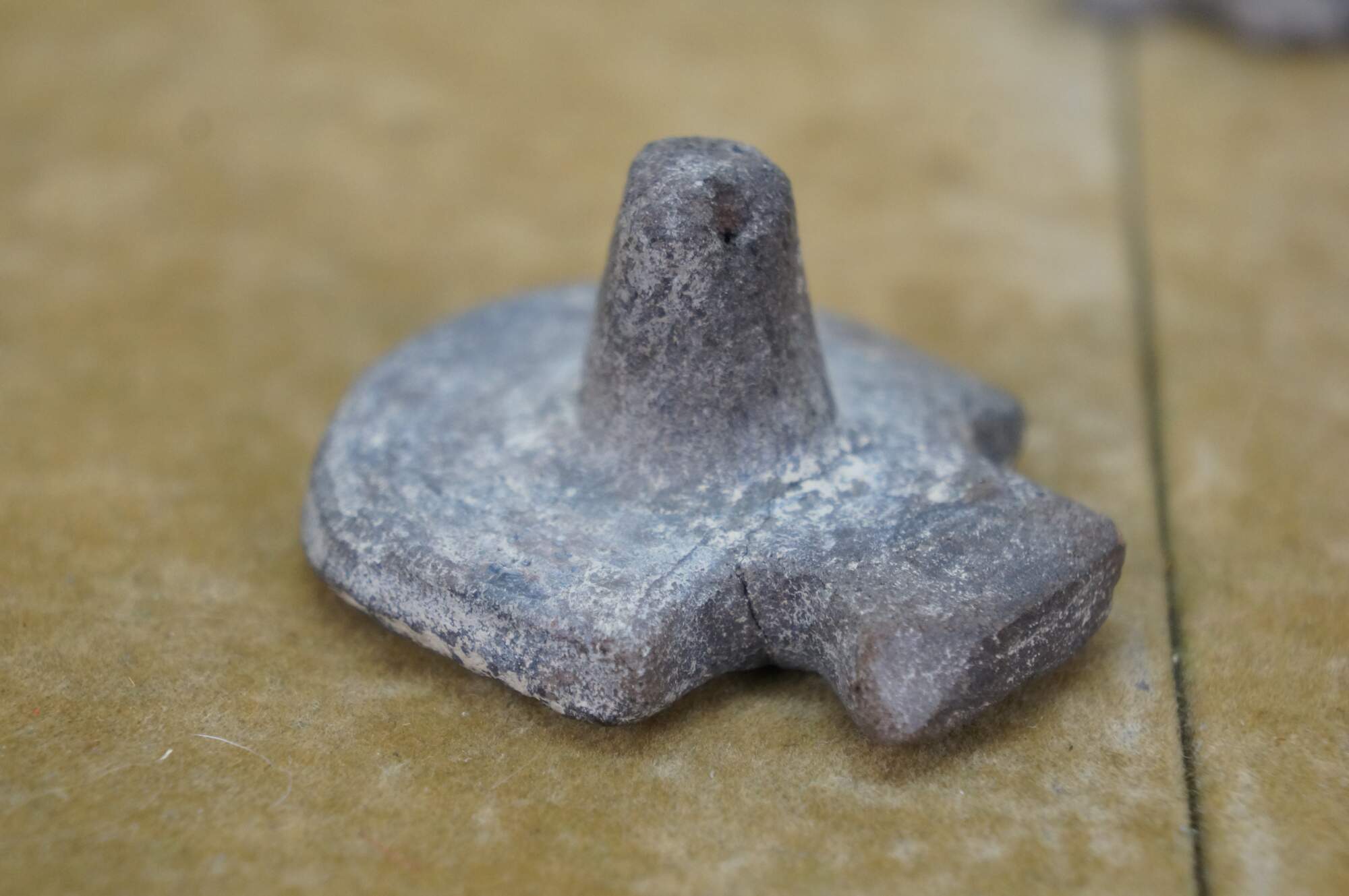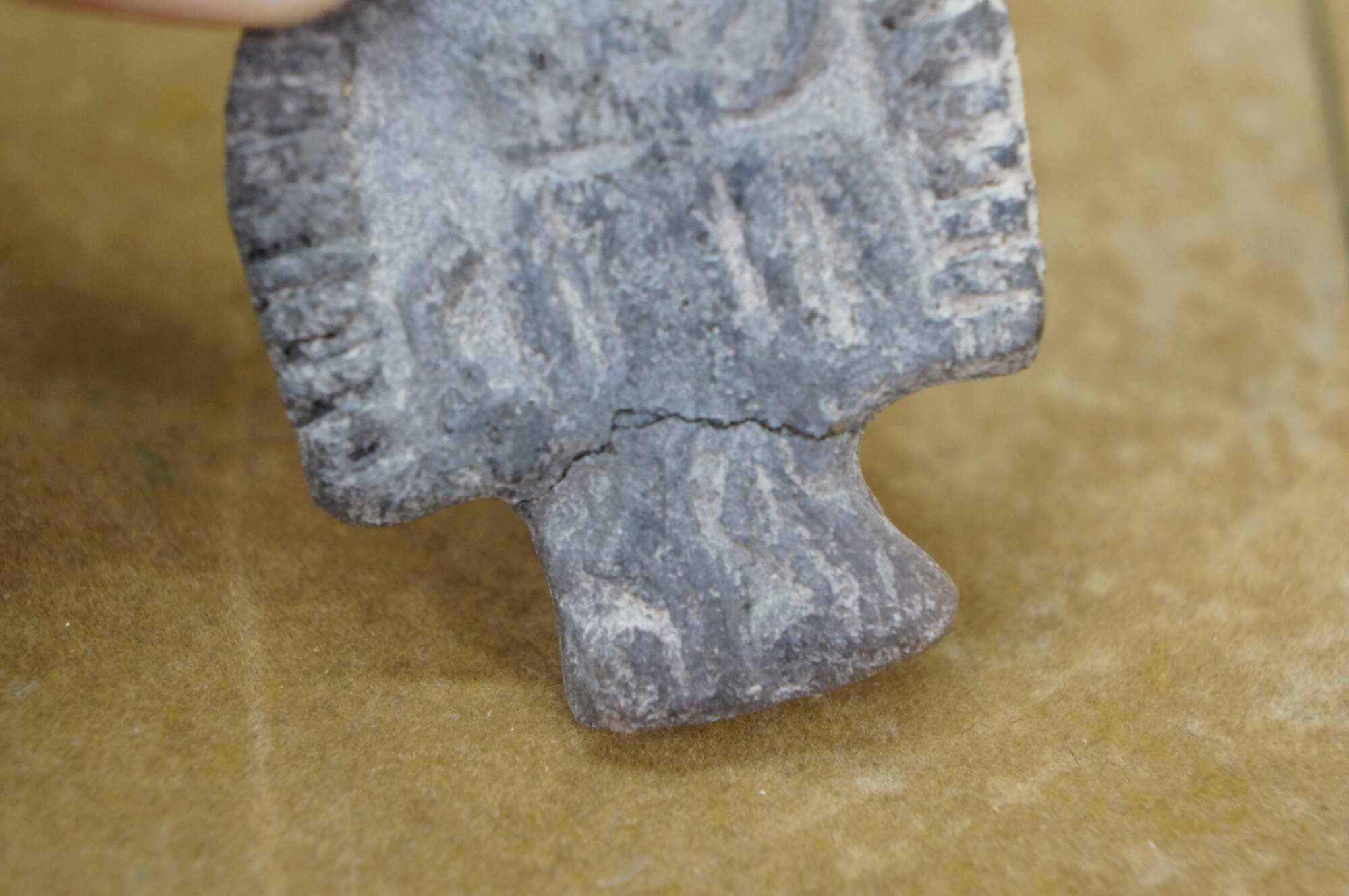 Set of four Pre-Columbian carved stone / terracotta pictoral seals or stamps. Several shapes showing a variety of Aztec / Mayan folk art figures, with handle on reverse.