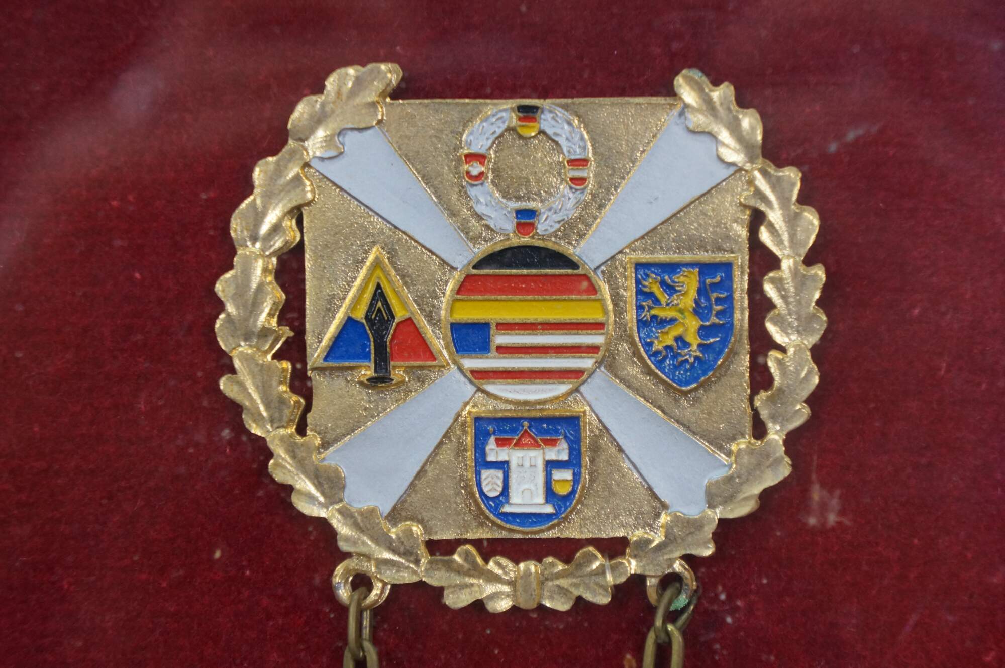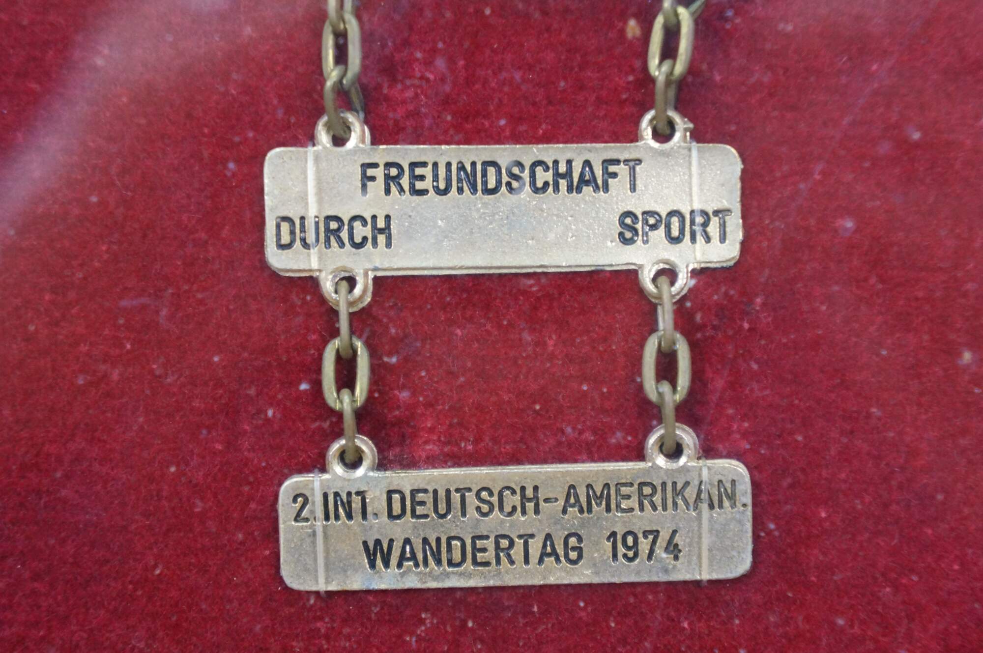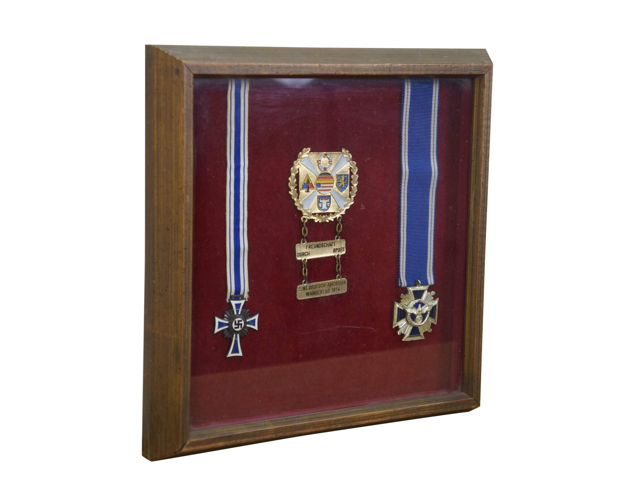 Set of three framed German medals. Right: Bronze Cross of Honour of the German Mother (German: Ehrenkreuz der Deutschen Mutter), referred to colloquially as the Mutterehrenkreuz (Mother's Cross of Honour) or simply Mutterkreuz (Mother's Cross) - a state decoration conferredbetween 1939-1945 by the government of Nazi Germany to honour a German-citizen mother for exceptional merit to the German nation. Center: Gold tone badge commemorating the 2. Int. Deutsch-Amerikan Wandertag 1974 (2nd International German-American Hiking Day 1974) - motto reads Freundschaft Durch Sport (Friendship Through Sport). Left: NSDAP Silver Second Class / 15 Years of Service Award, issued in 1939. Beveled wood shadowbox, red velvet interior, glass front. Framed in 1974.