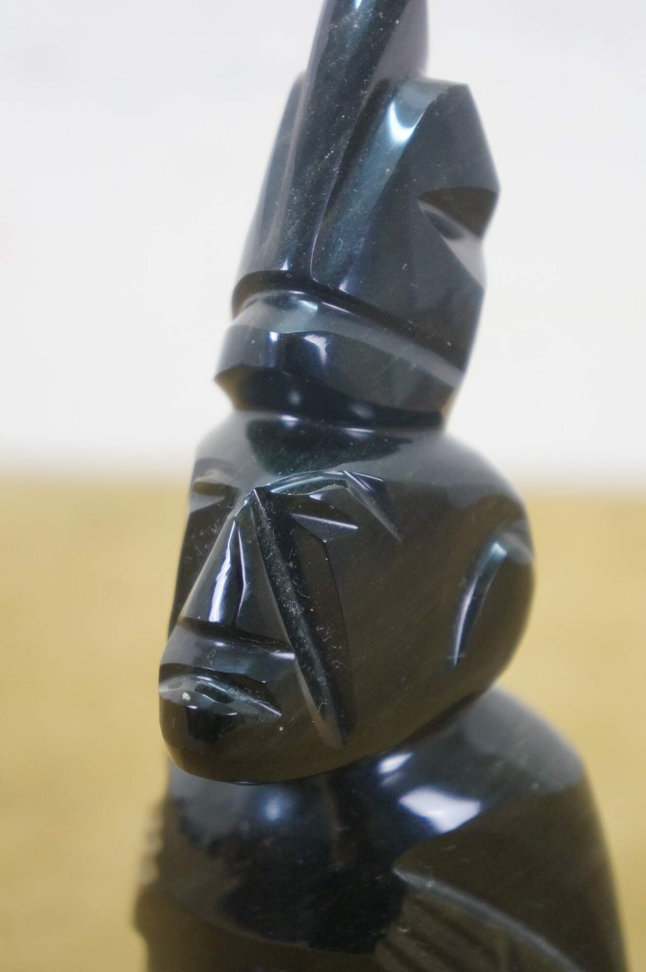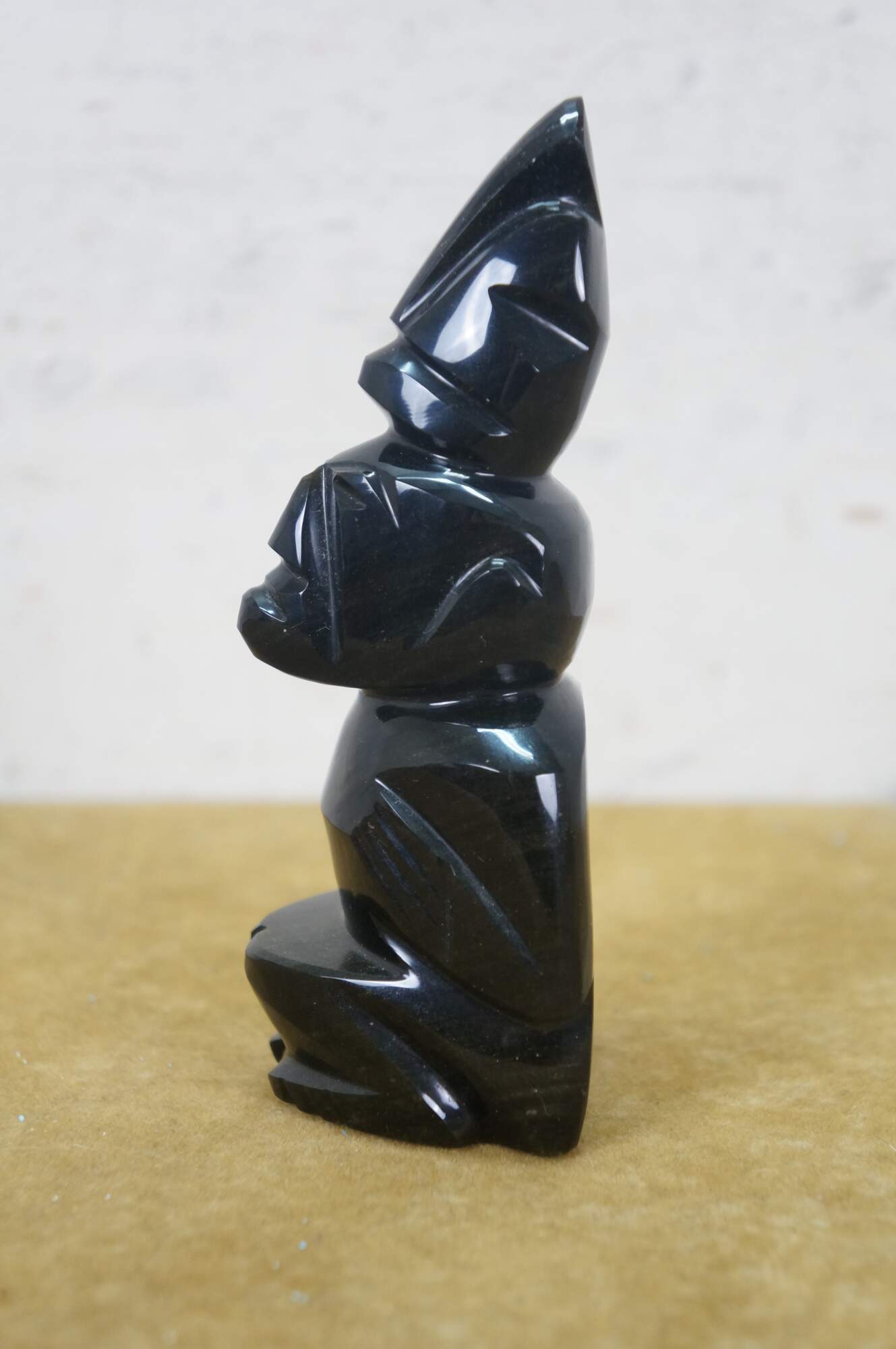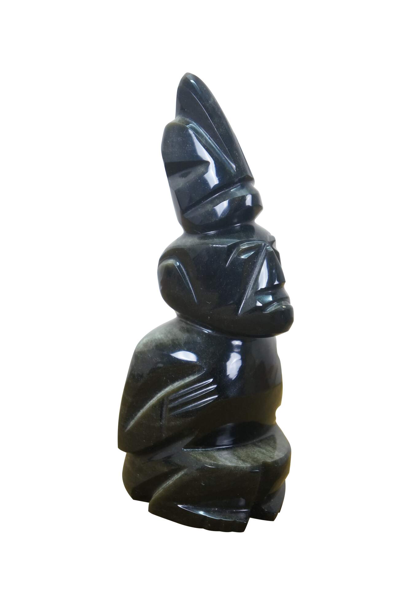 Late 20th century hand carved black obsidian figurine in the shape of a Mayan / Aztec seated figure with headdress.