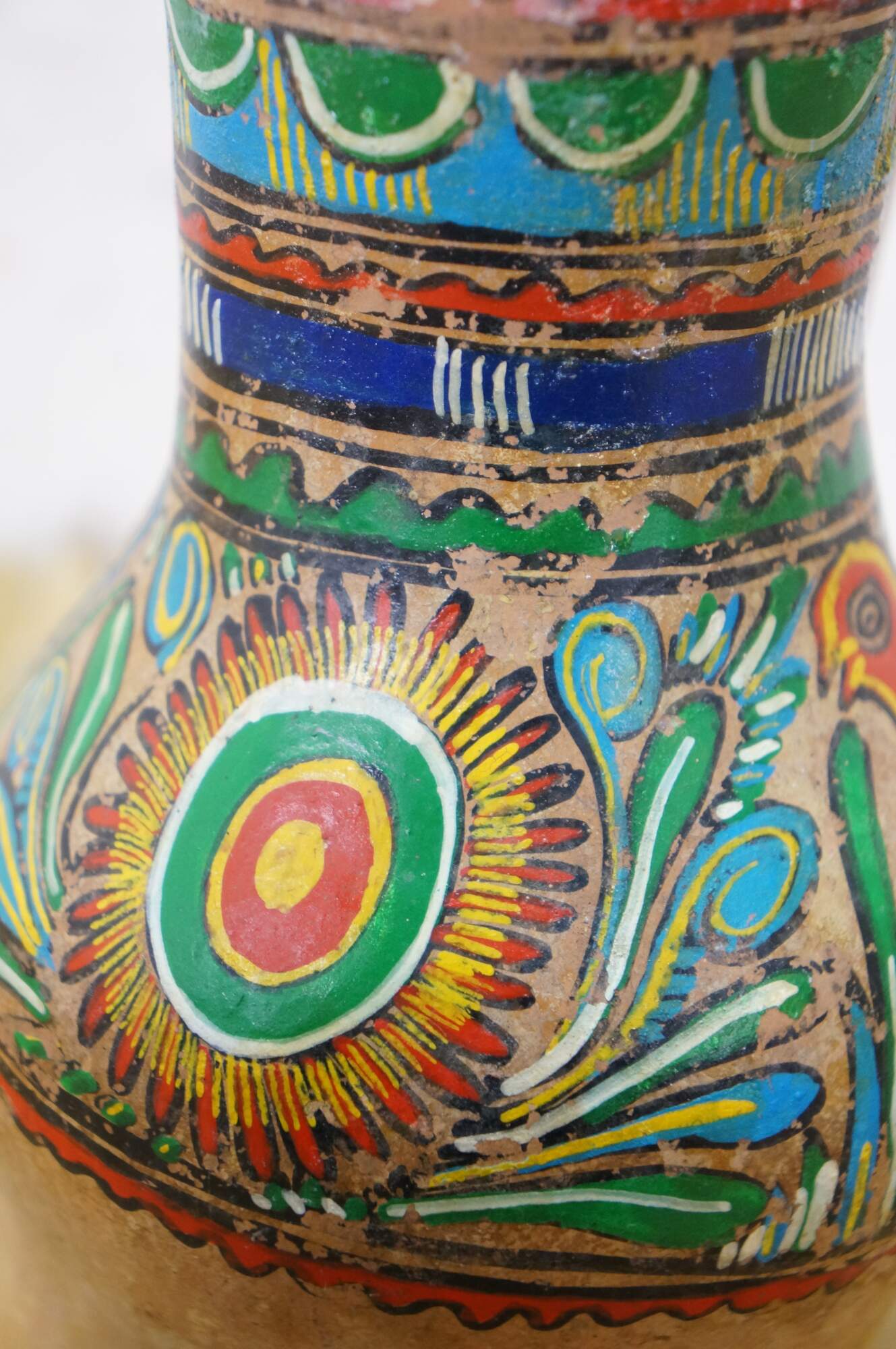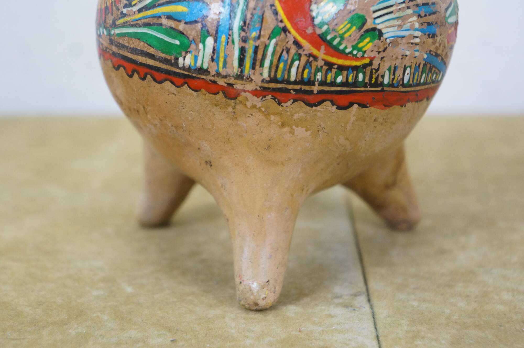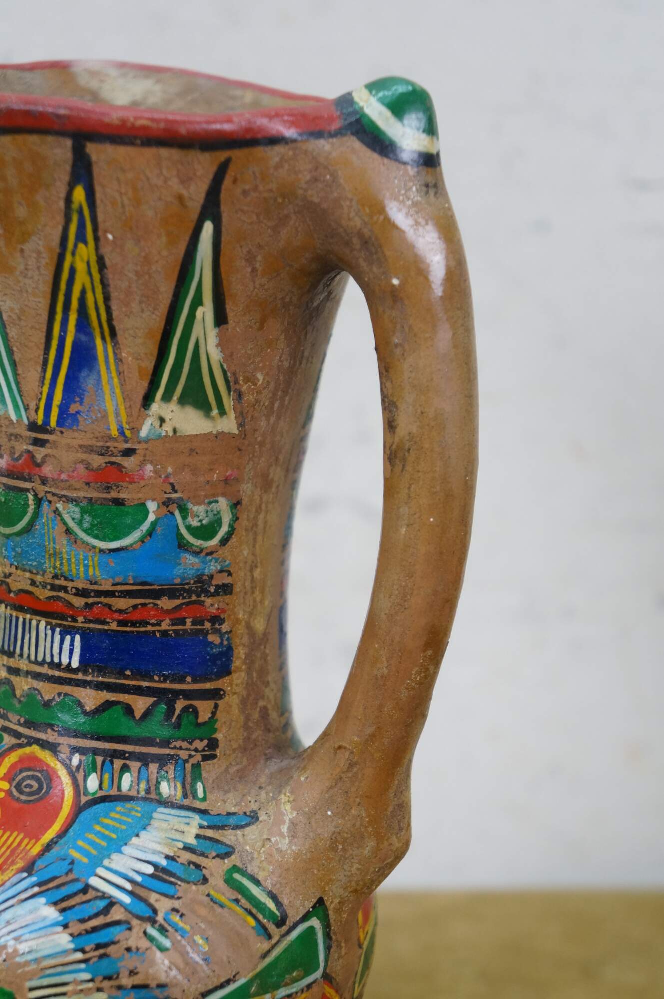 Vintage 20th century Mexican folk art style pulque agave pitcher / water jug. Brown terracotta earthenware pottery with tripod footed base and long handle, hand painted with polychrome birds and geometric patterns.