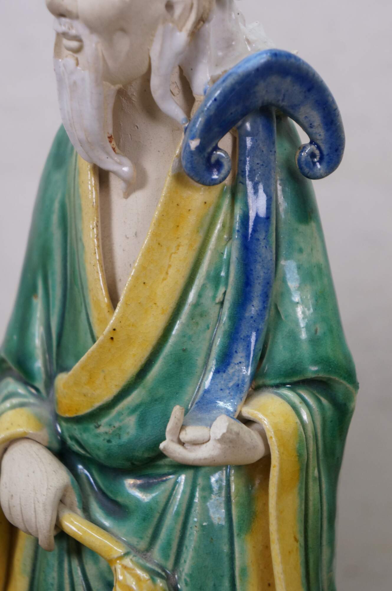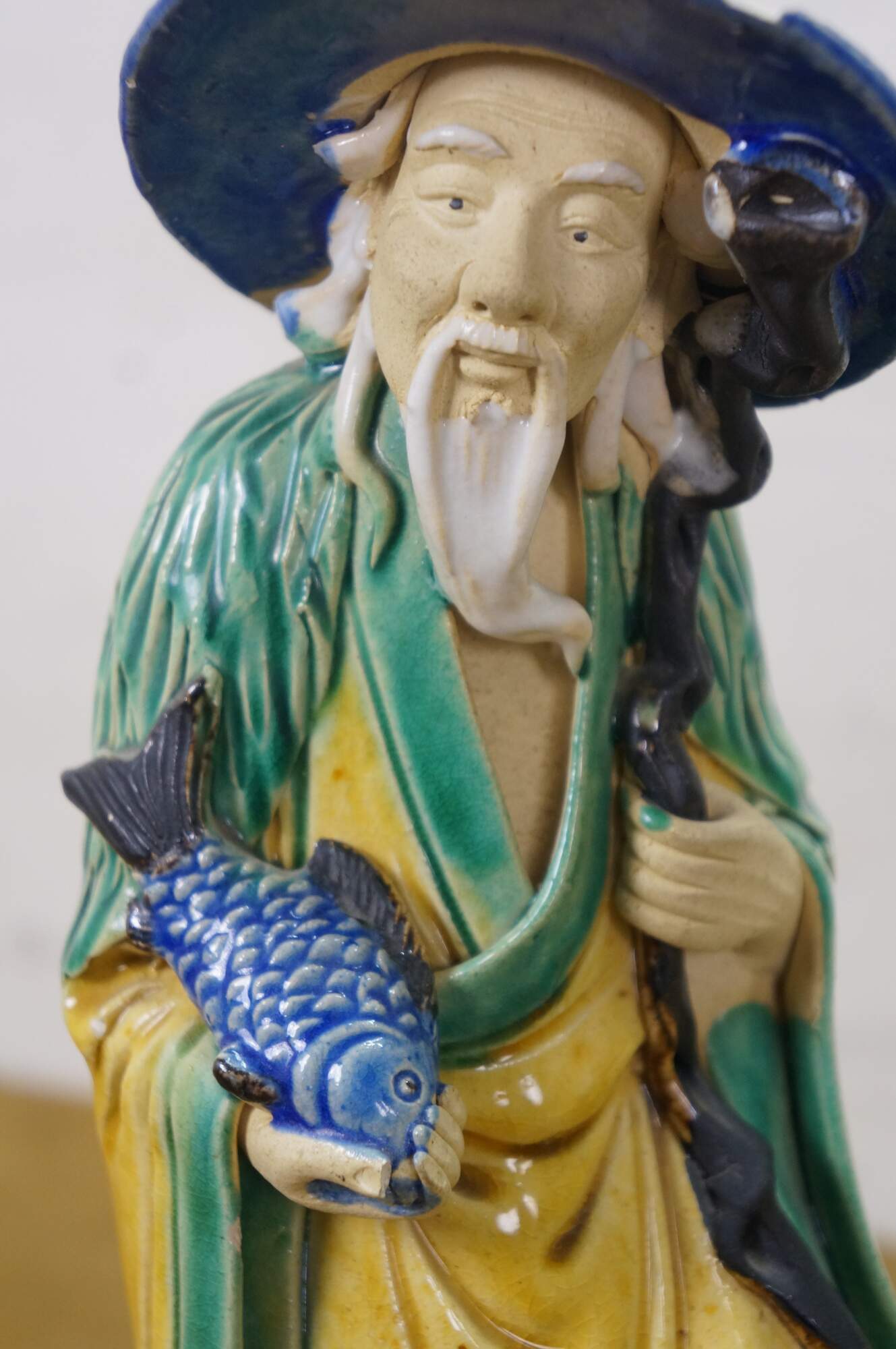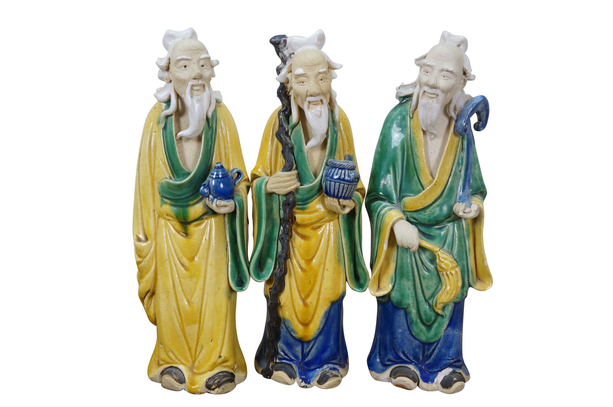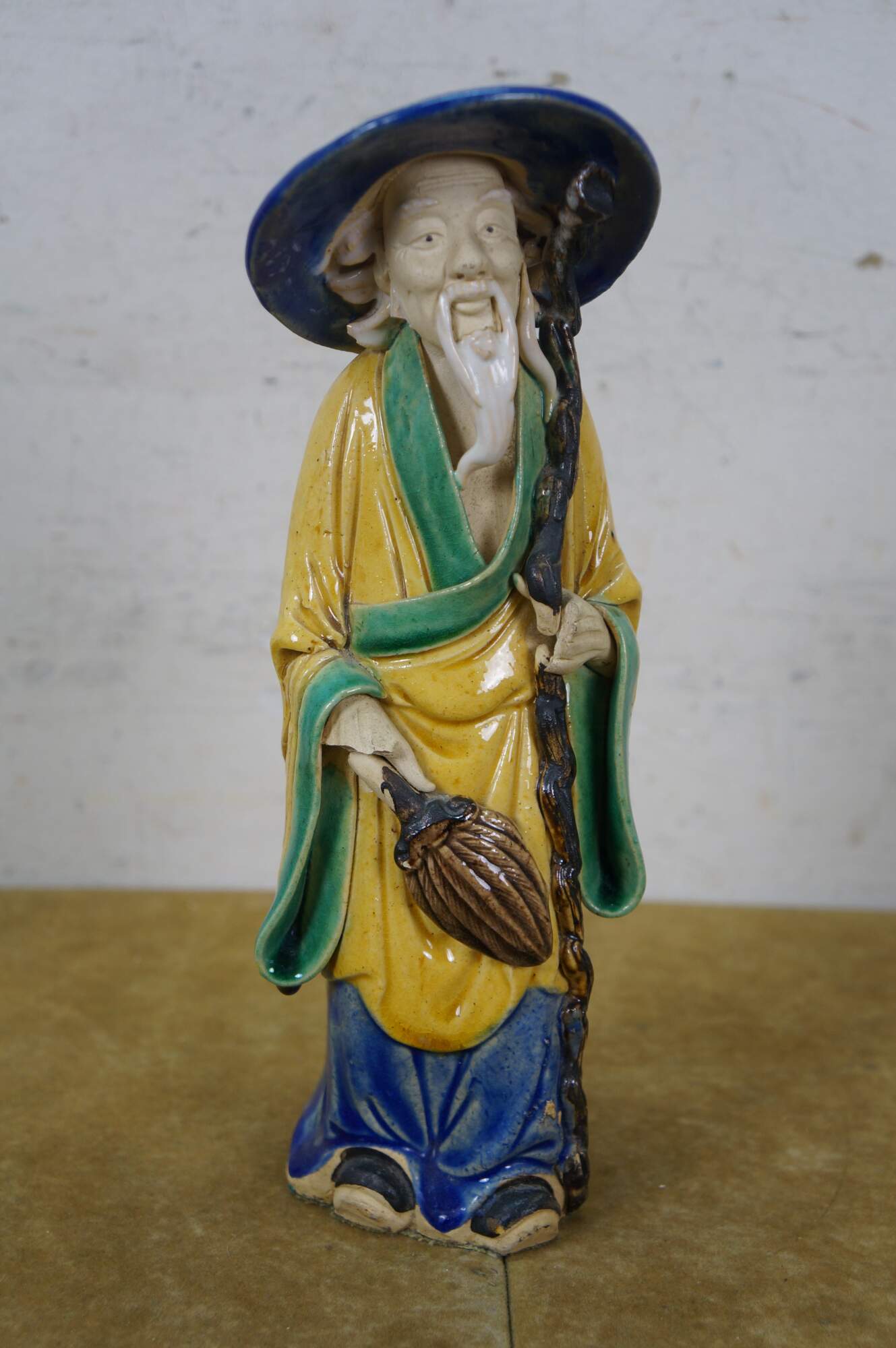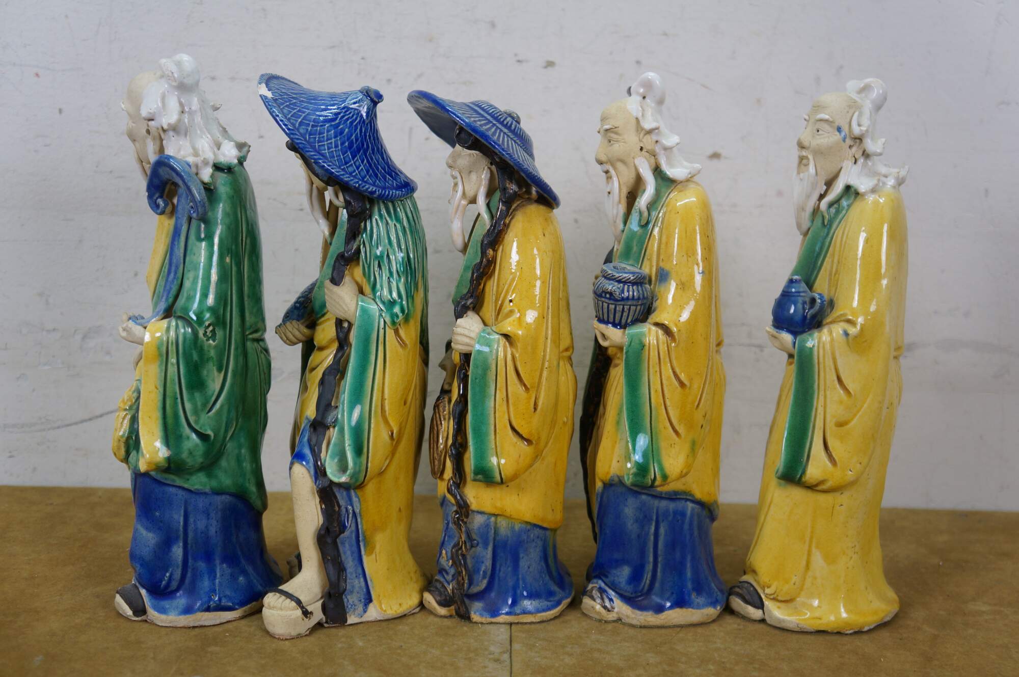 Set of 5 vintage 20th century Chinese ceramic "mud man" figurines. Wise looking men with long white hair, dressed in yellow, green, and blue glazed robes and hats, holding a variety of objects including staffs, a fan, pottery, and a fish.