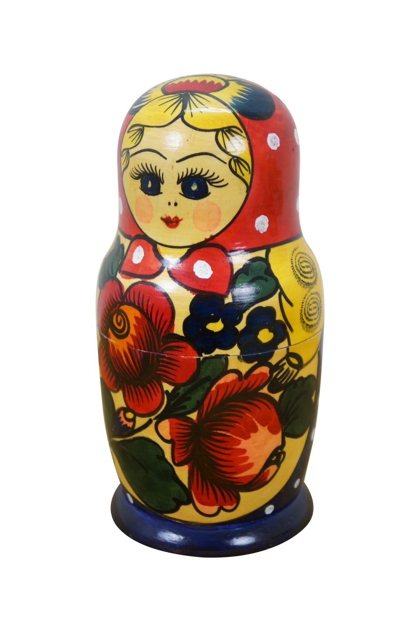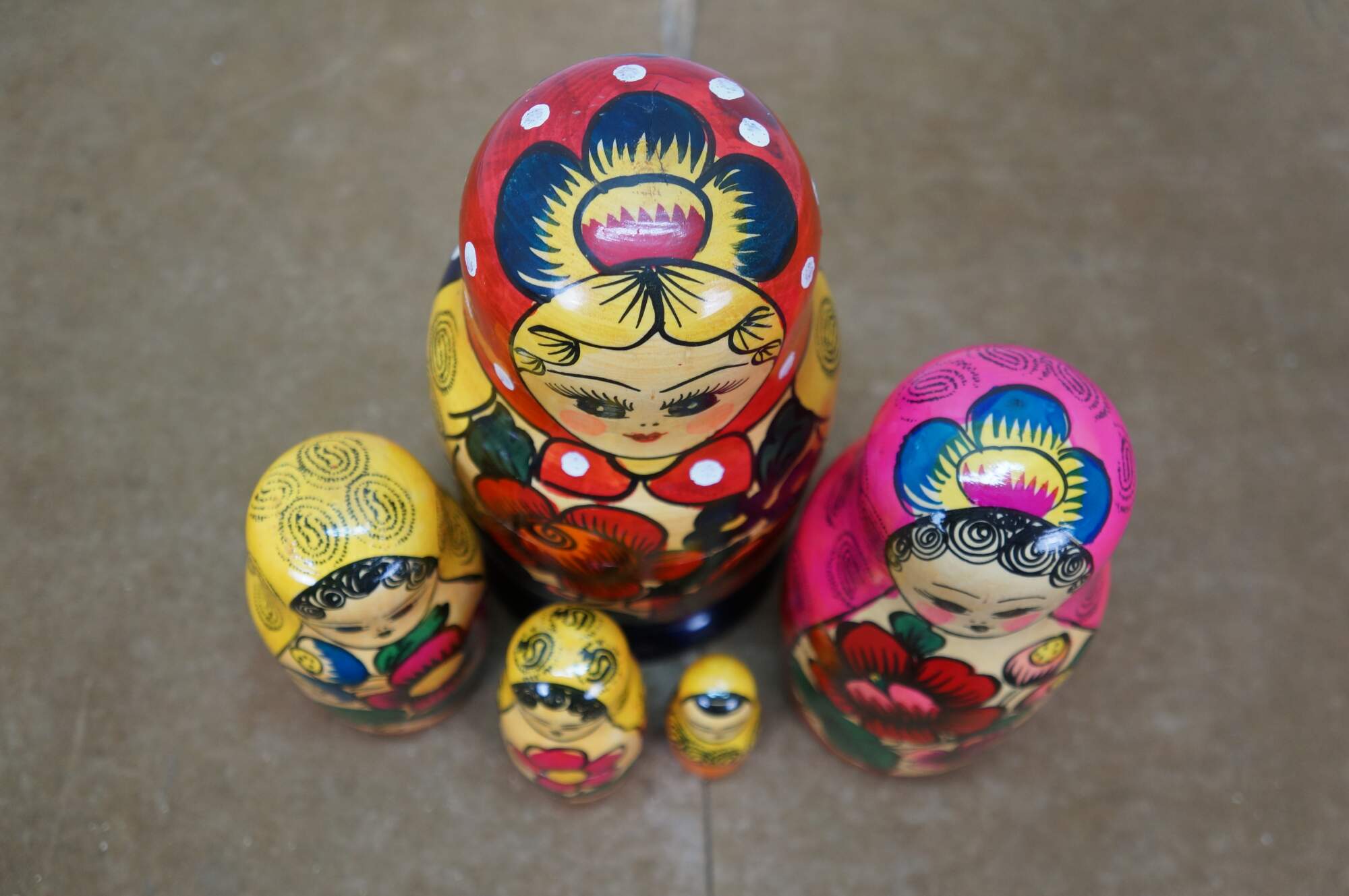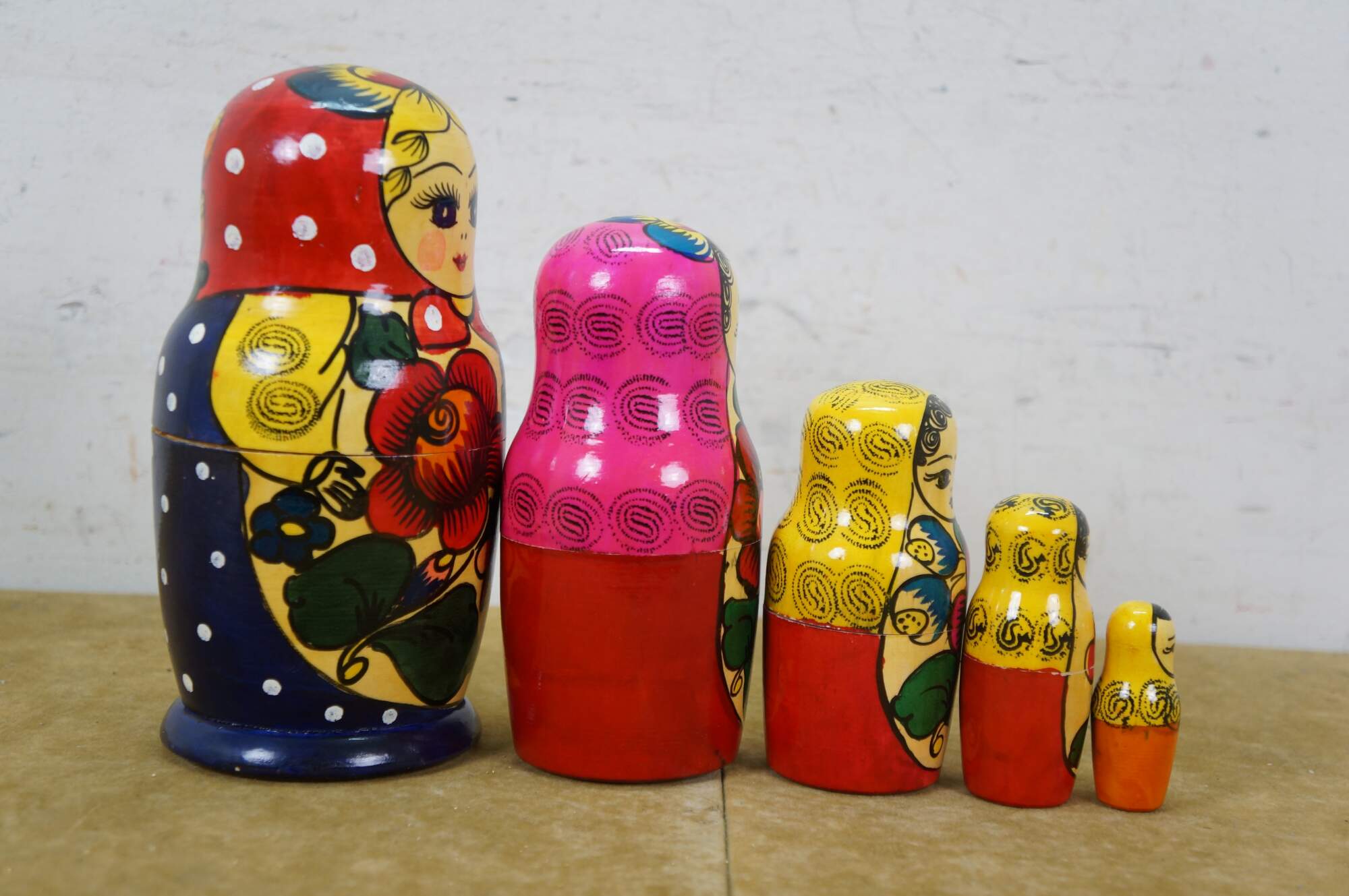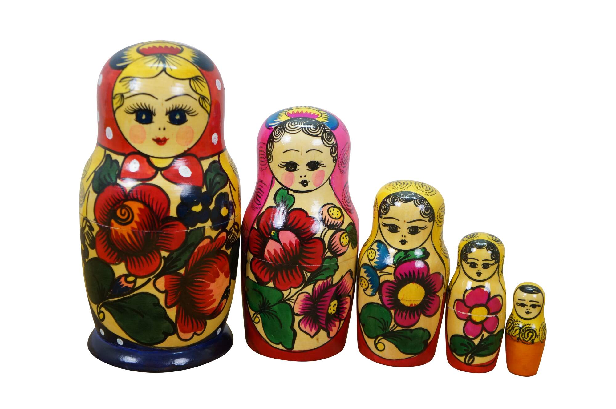 Mid to late 20th century Russian wooden matryoshka / nesting doll with five graduated folk art styled figures.