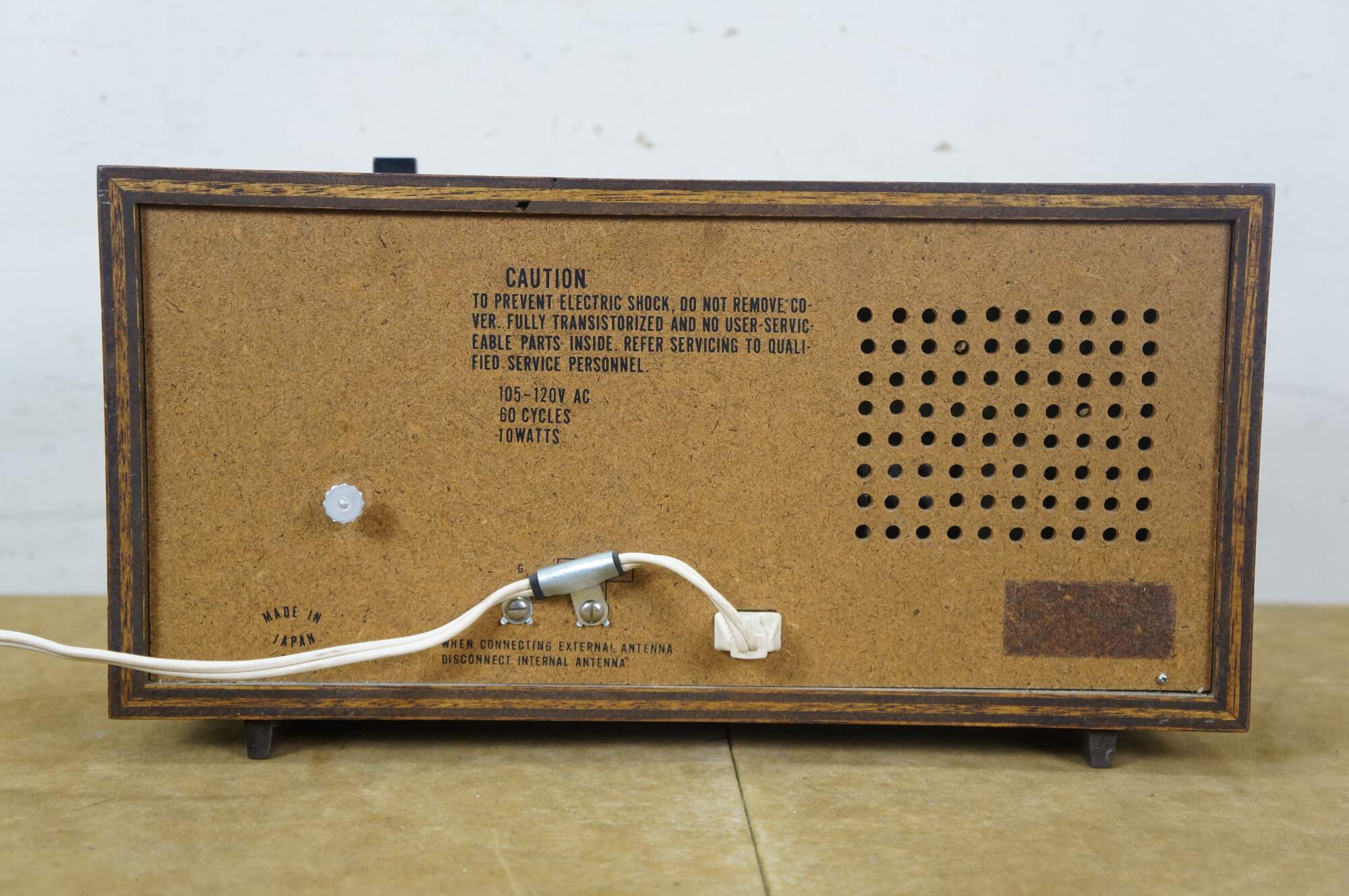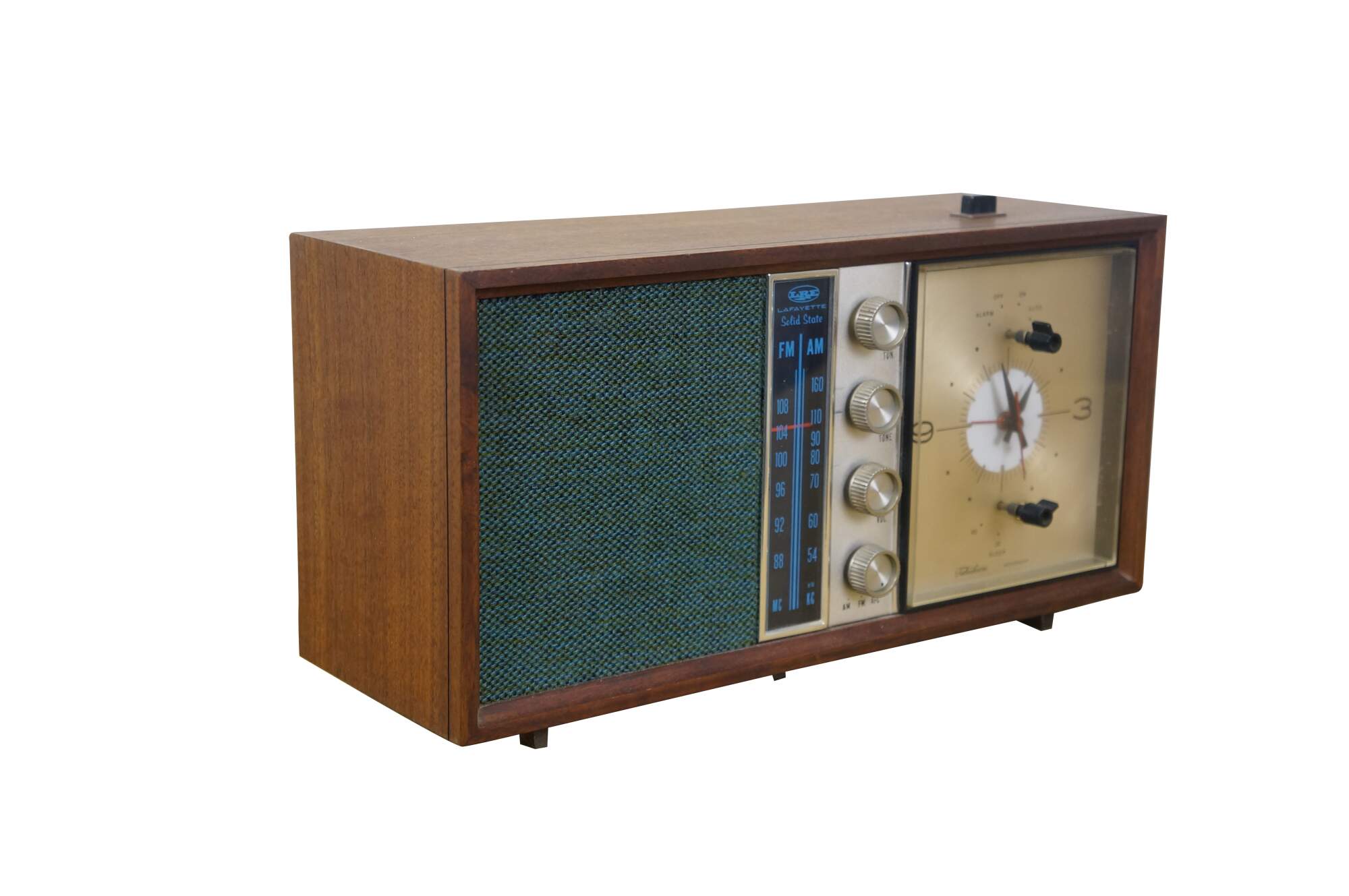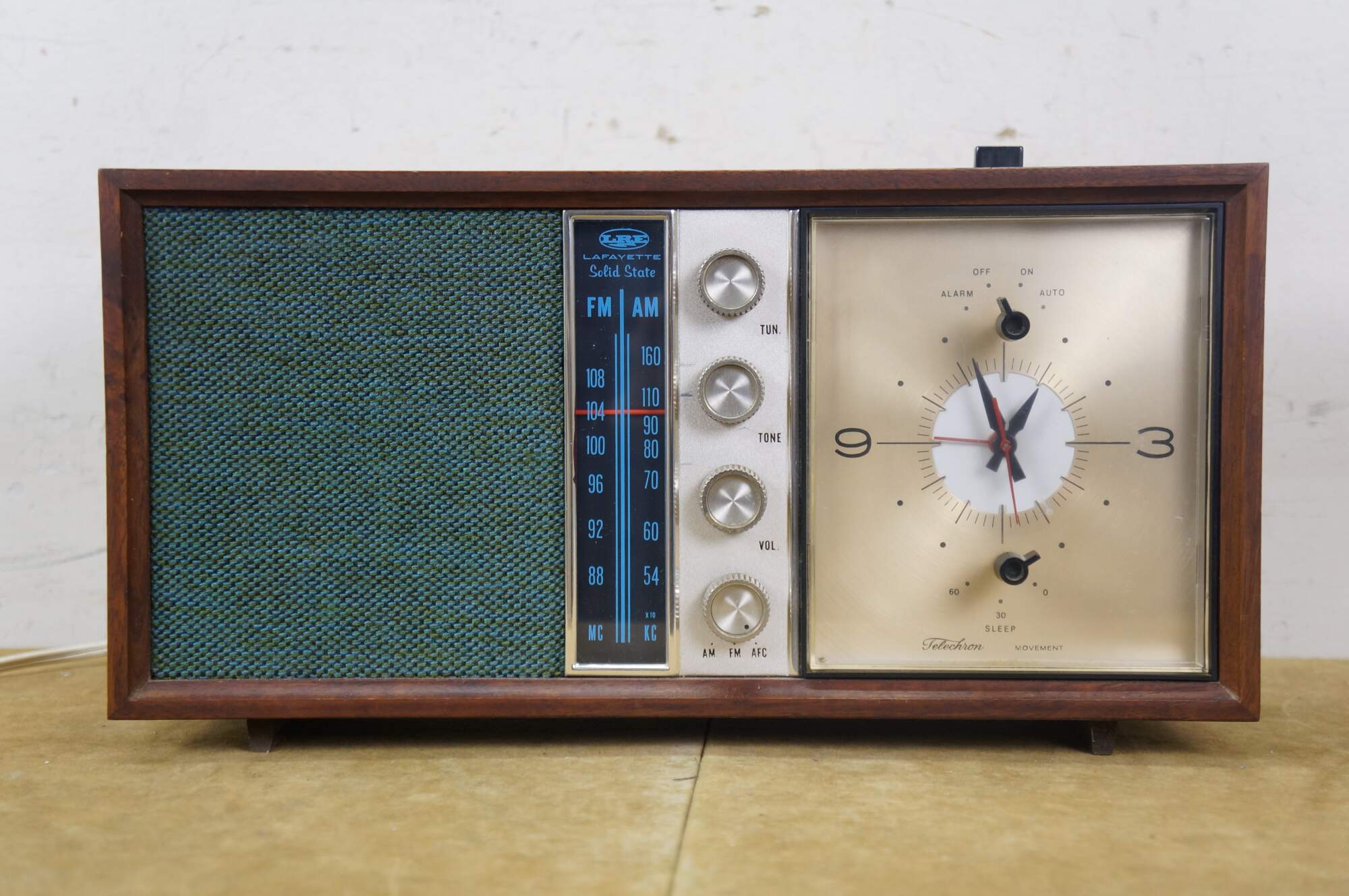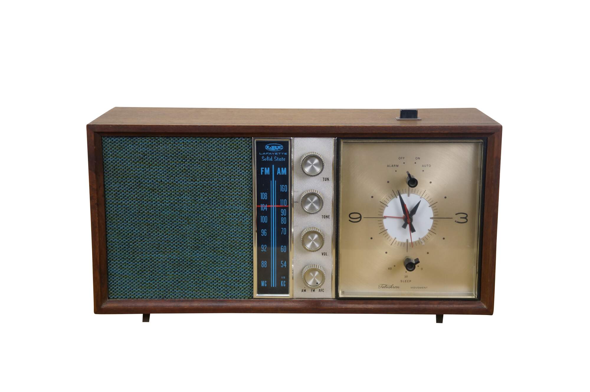 Mid 20th century LRE Lafayette Solid State AM/FM electric alarm clock radio with Telechron movement. 105-120V AC - 60 Cycles - 10 Watts. Made in Japan - 716.