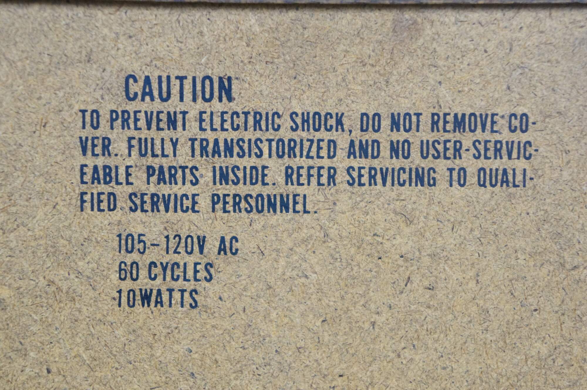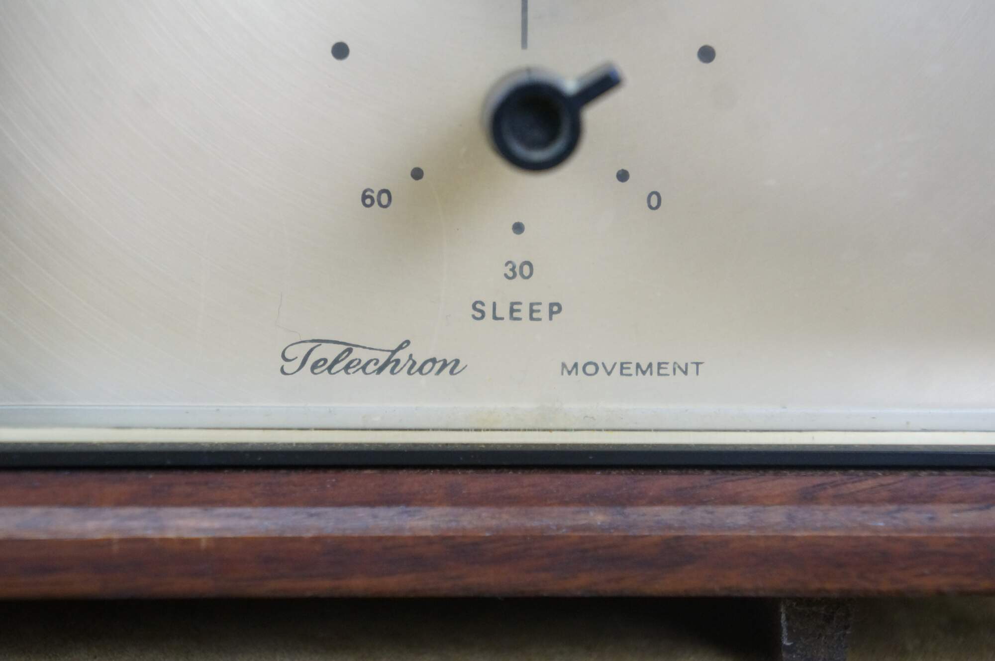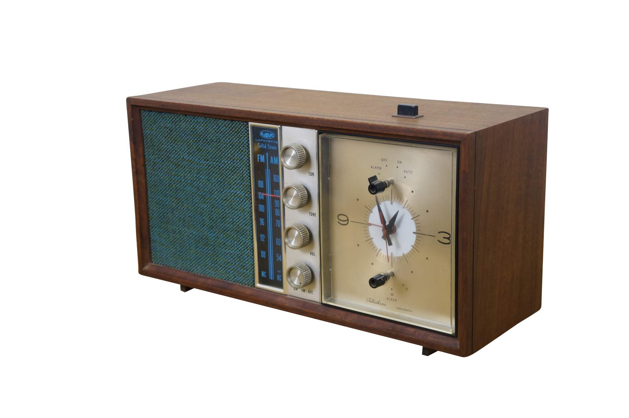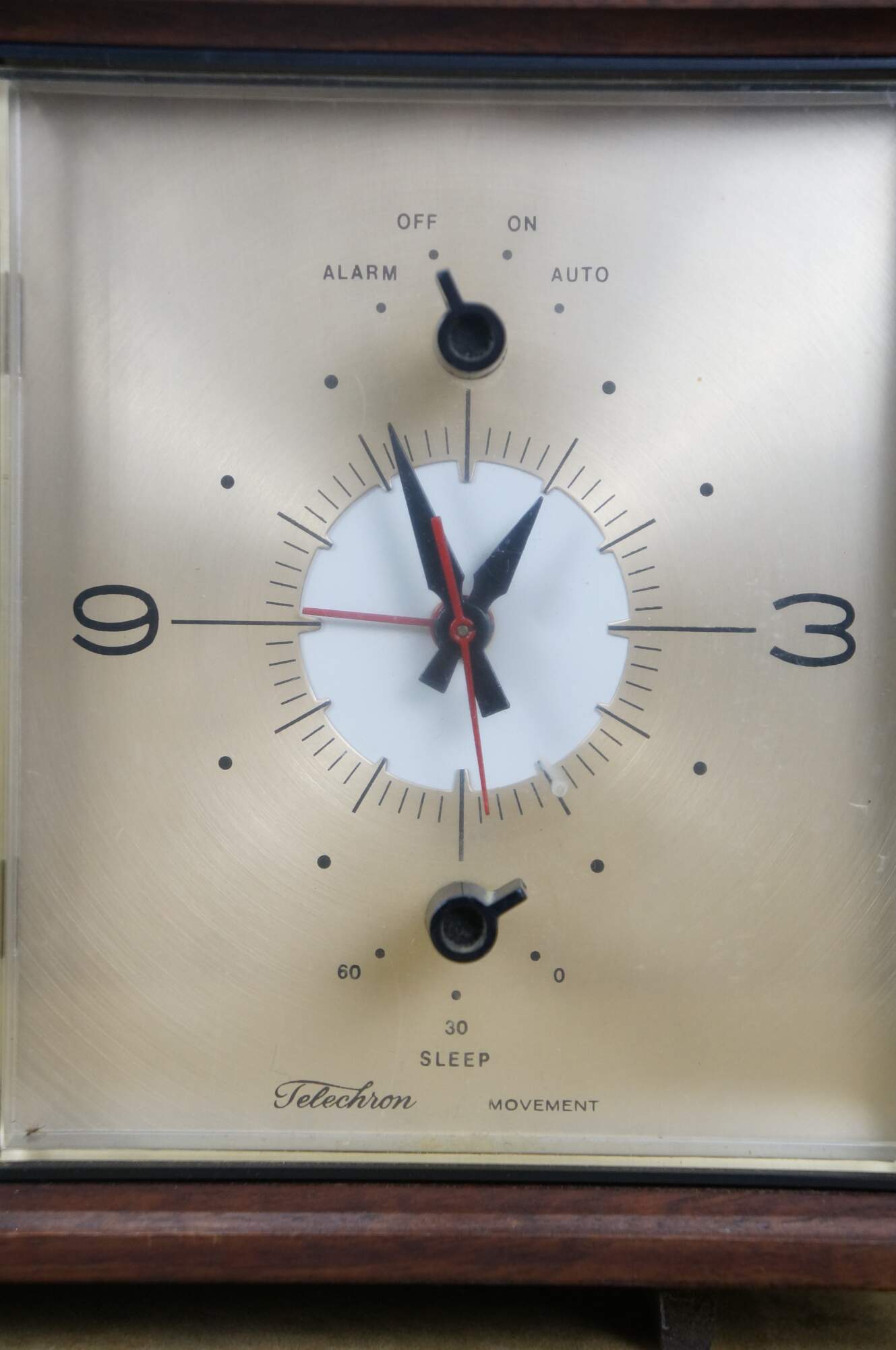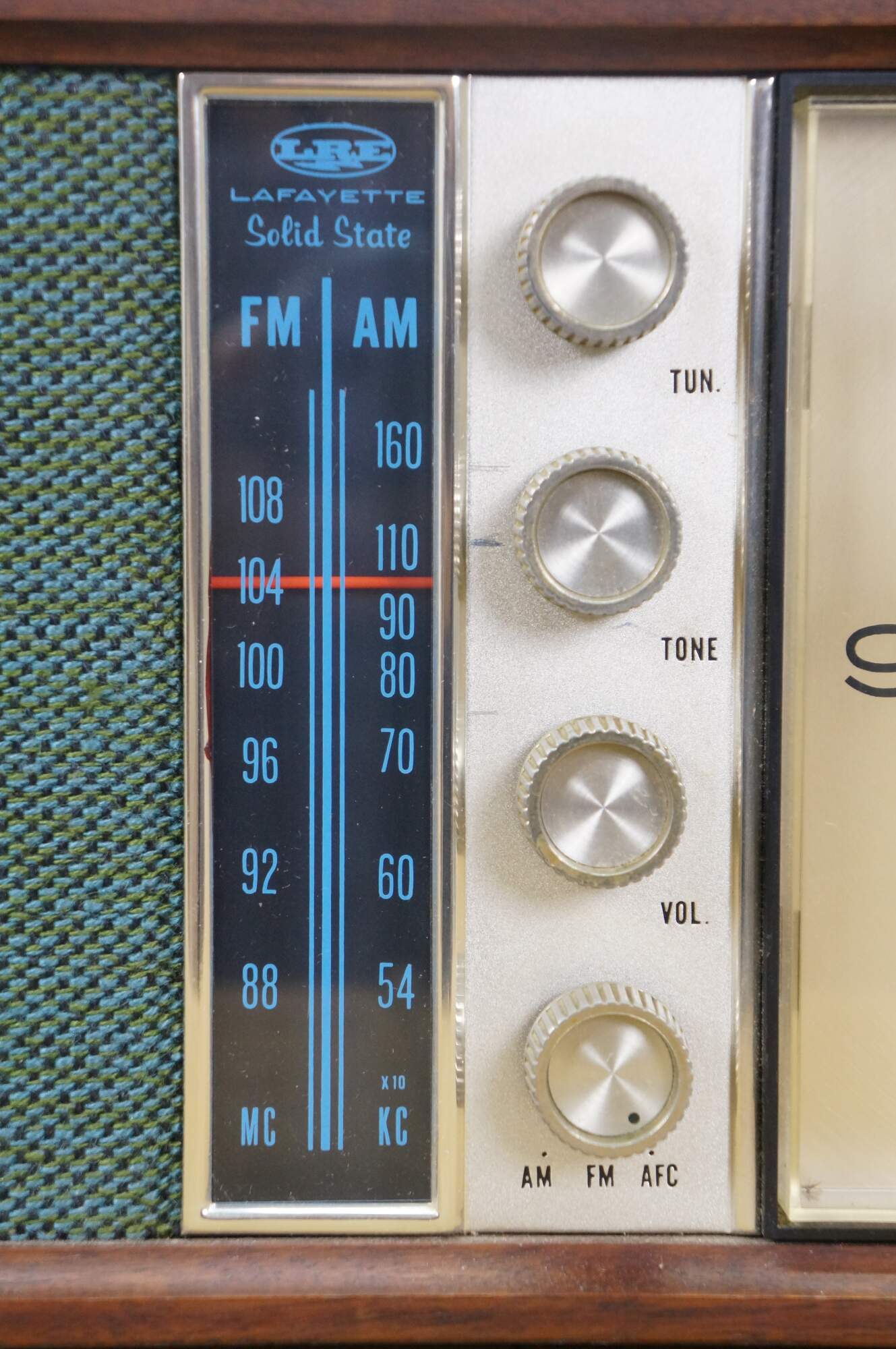 Mid 20th century LRE Lafayette Solid State AM/FM electric alarm clock radio with Telechron movement. 105-120V AC - 60 Cycles - 10 Watts. Made in Japan - 716.
