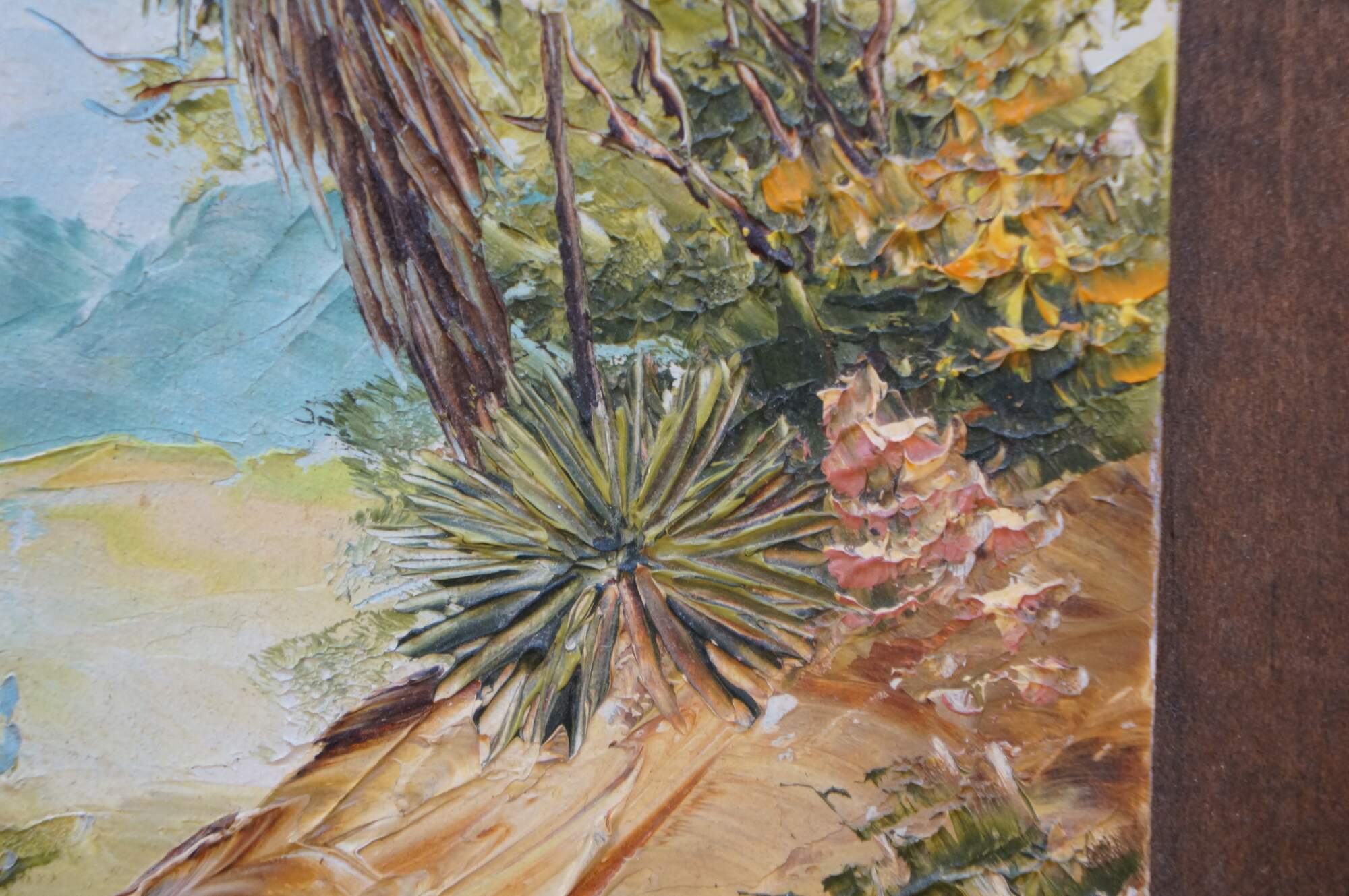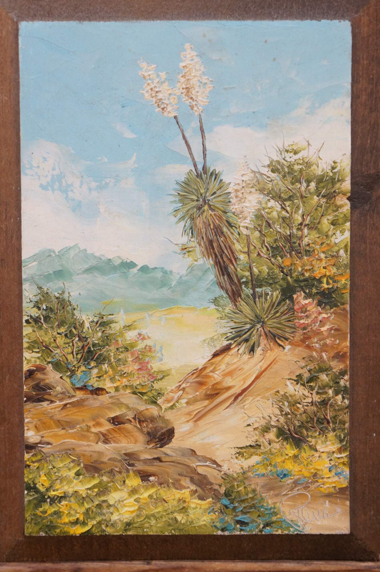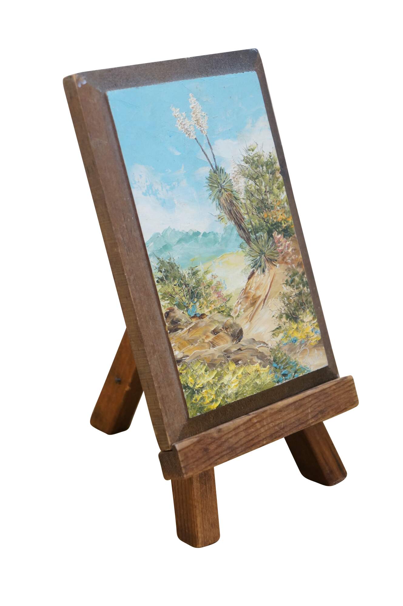 Late 20th century miniature desktop masterpiece landscape oil painting on board and easel showing a view of desert plants and mountains. Signed Reva, lower right.