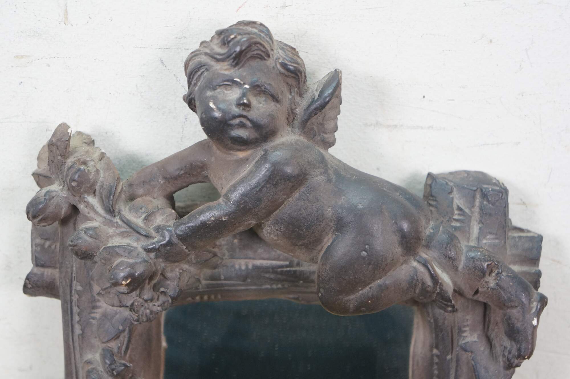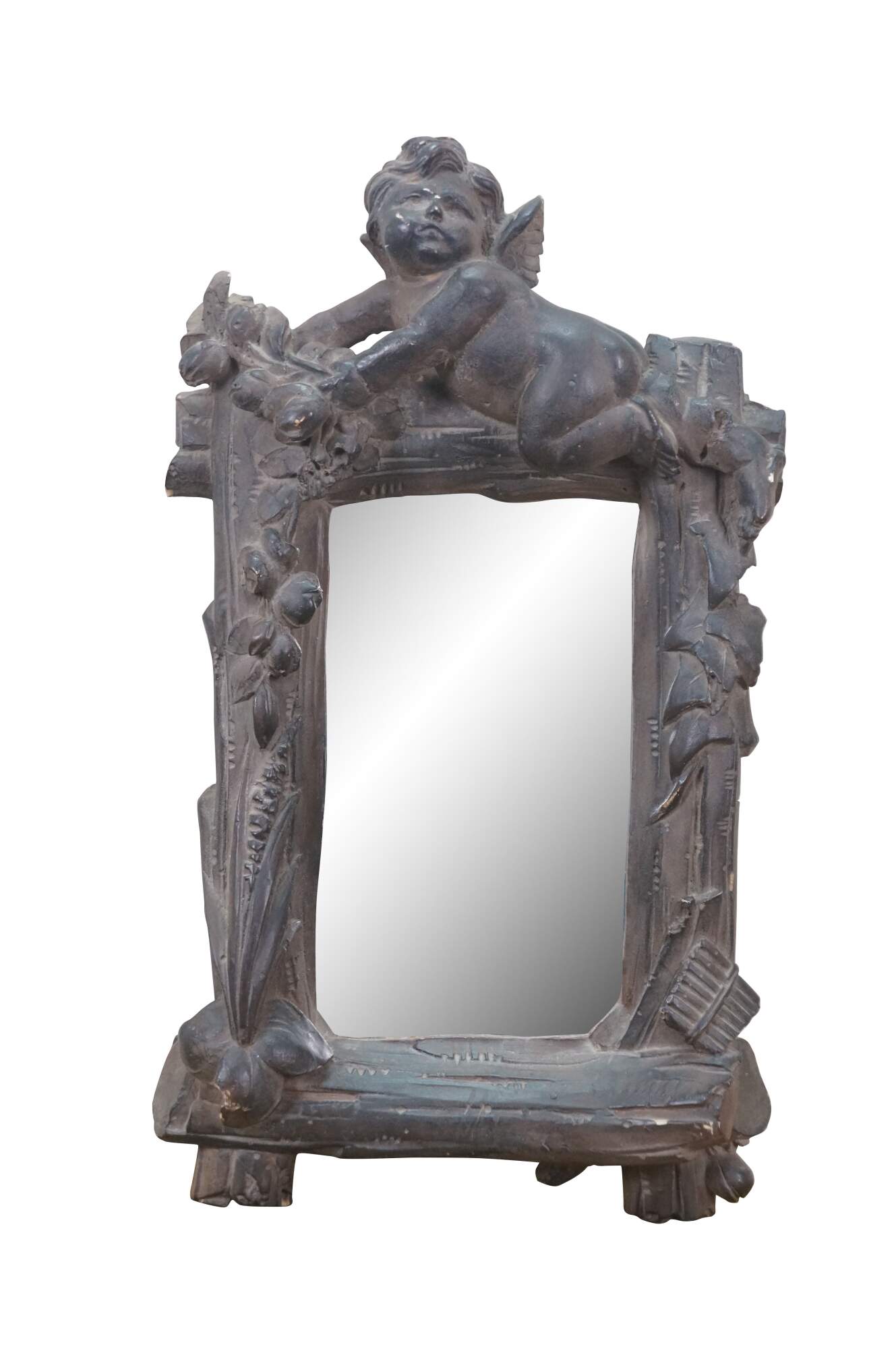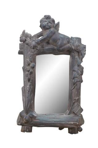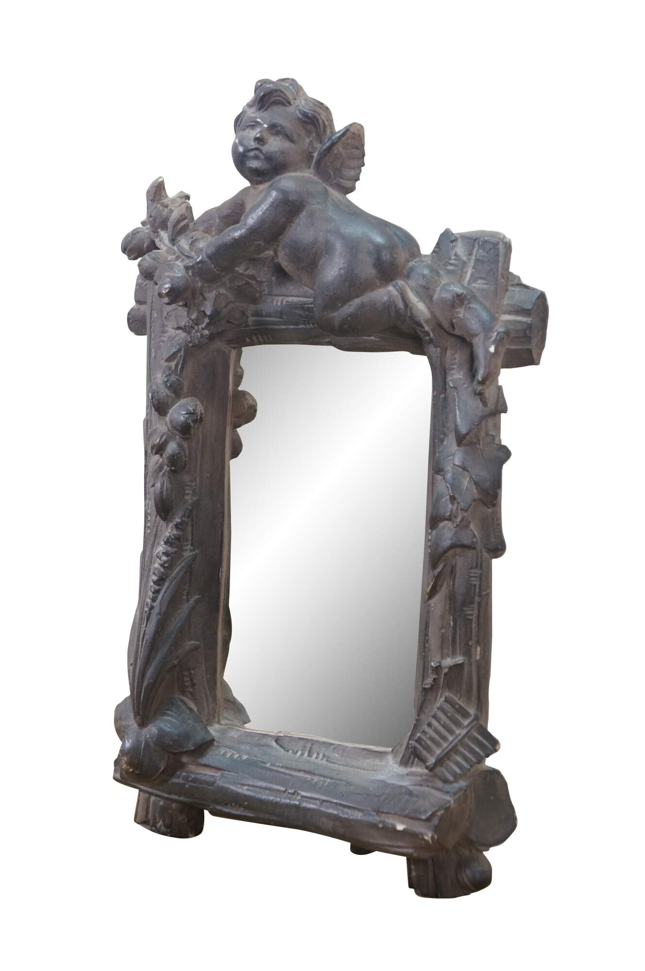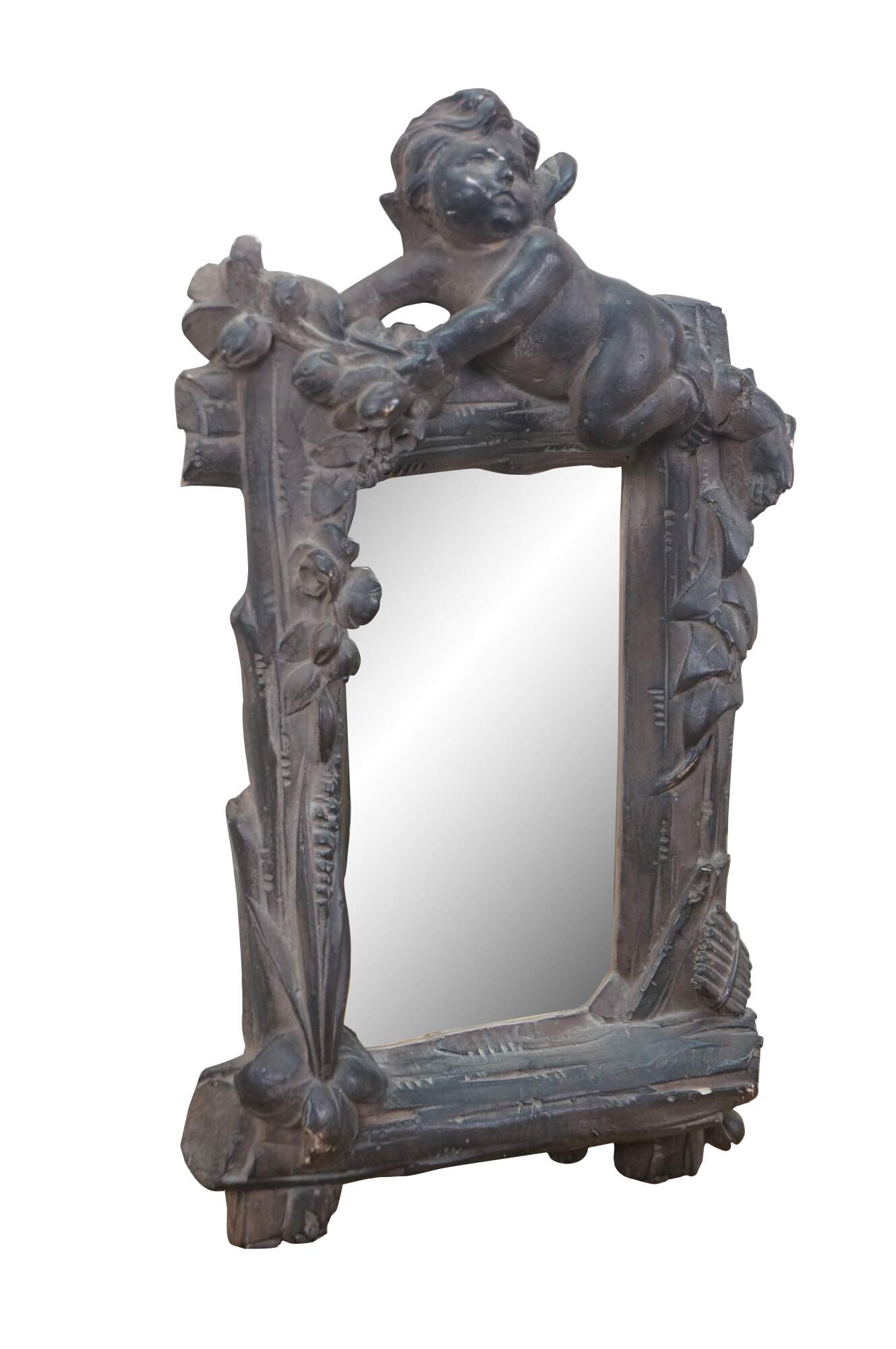 Mid to late 20th century chalkware wall mirror by Gargoyles Studio, NYC. Rectangular frame molded in the shape of wooden logs, trimmed with flowers, pan pipes and a naked putti / cherub on top.