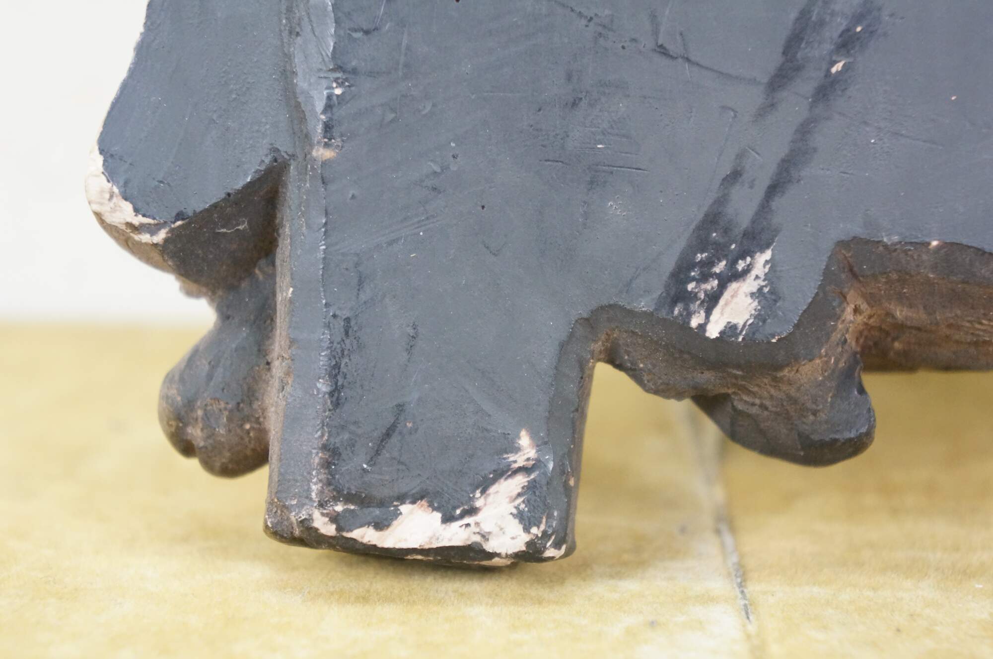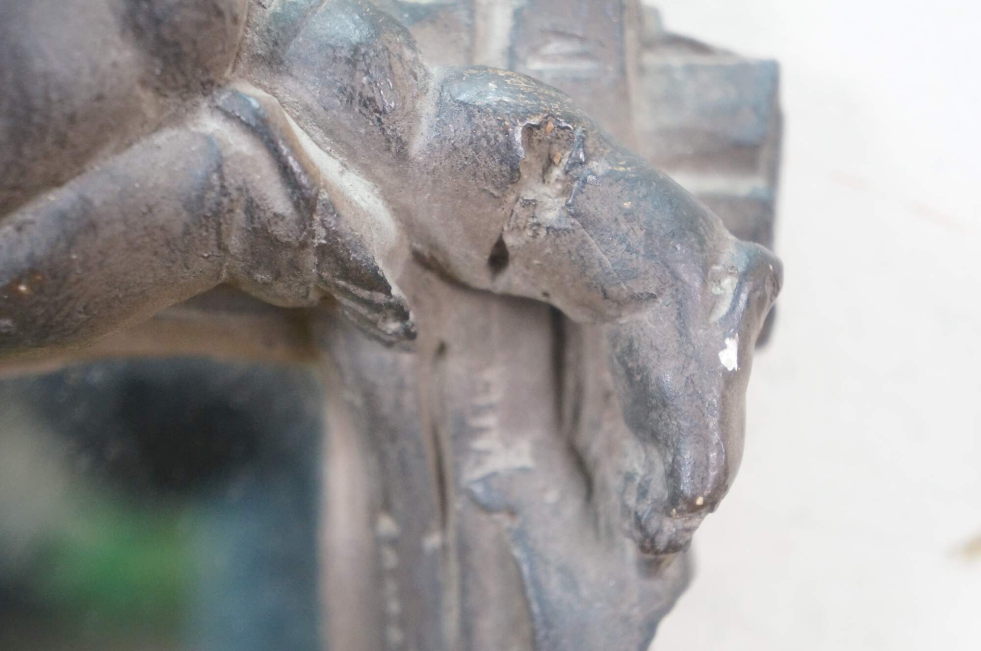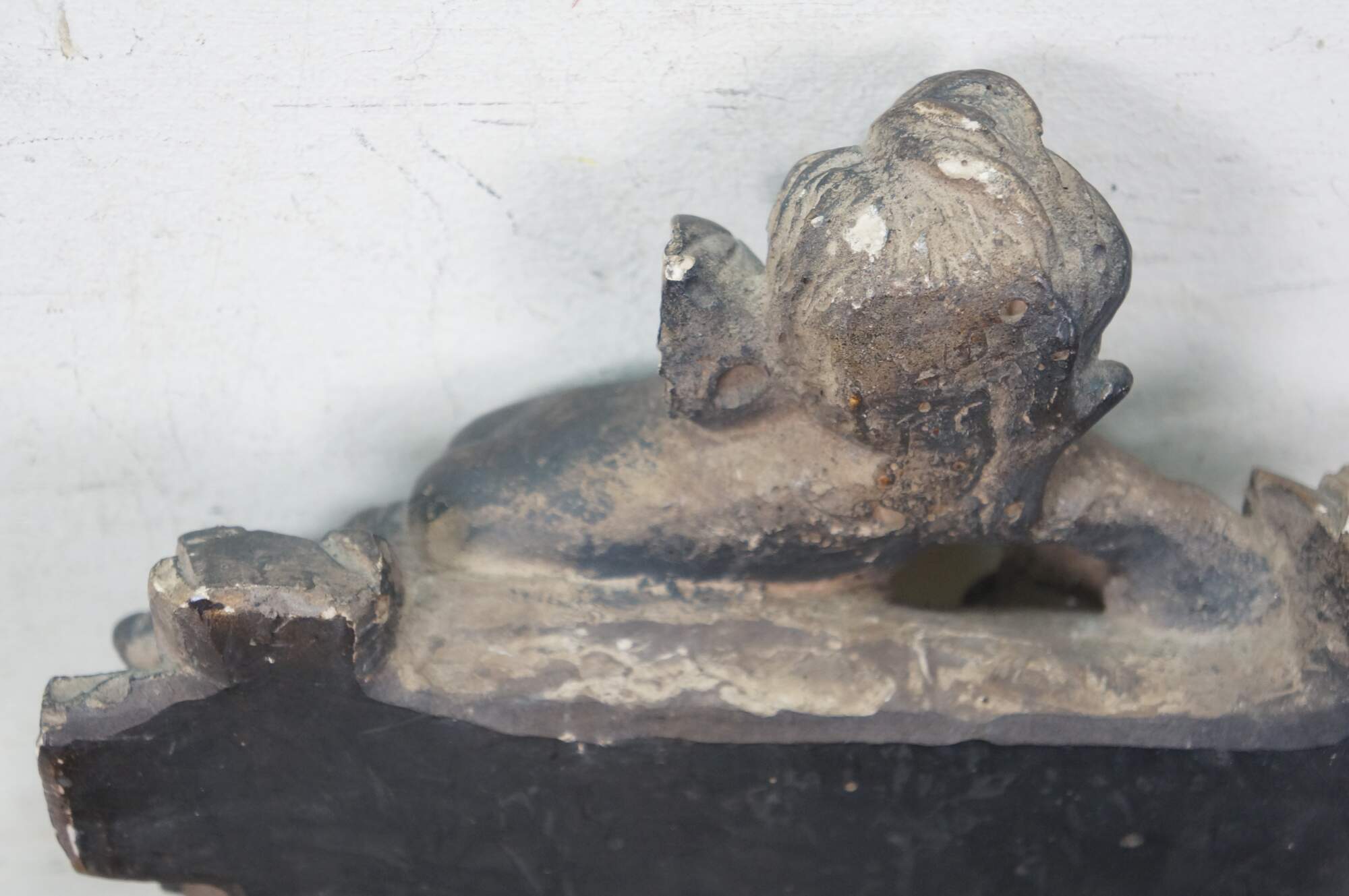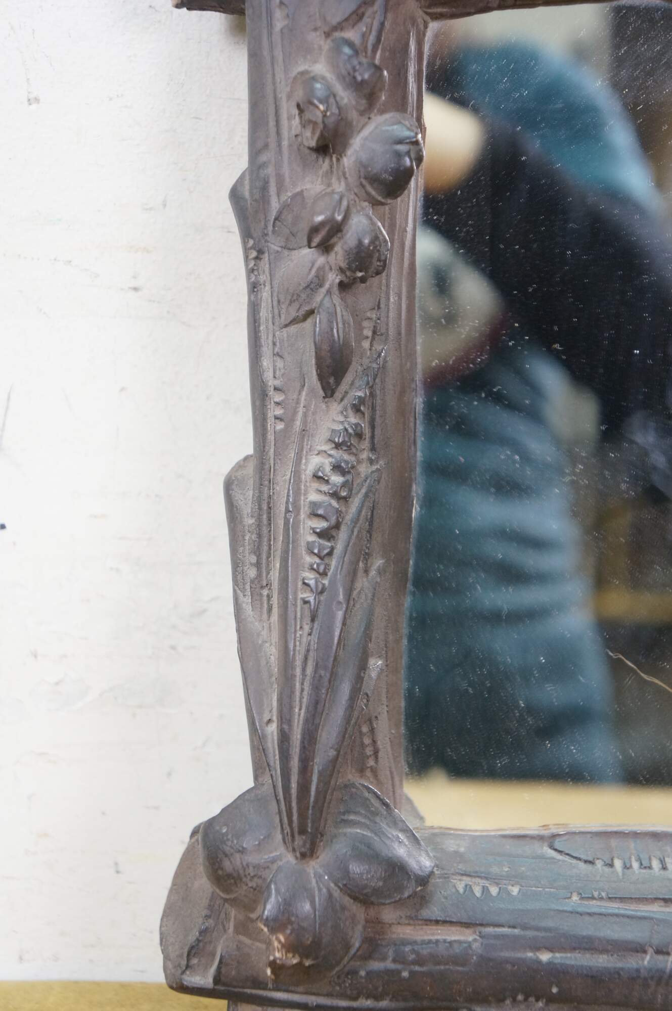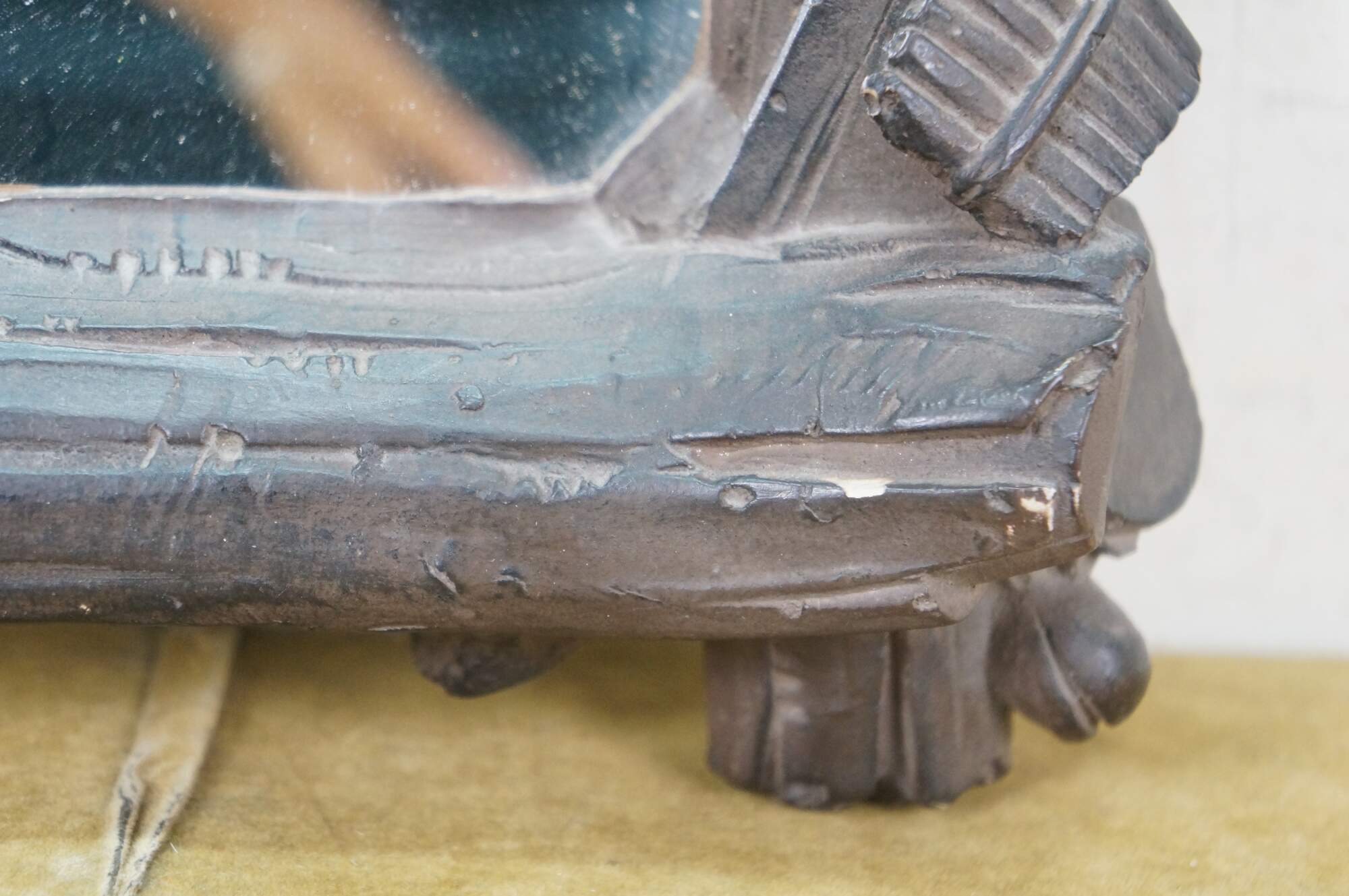 Mid to late 20th century chalkware wall mirror by Gargoyles Studio, NYC. Rectangular frame molded in the shape of wooden logs, trimmed with flowers, pan pipes and a naked putti / cherub on top.