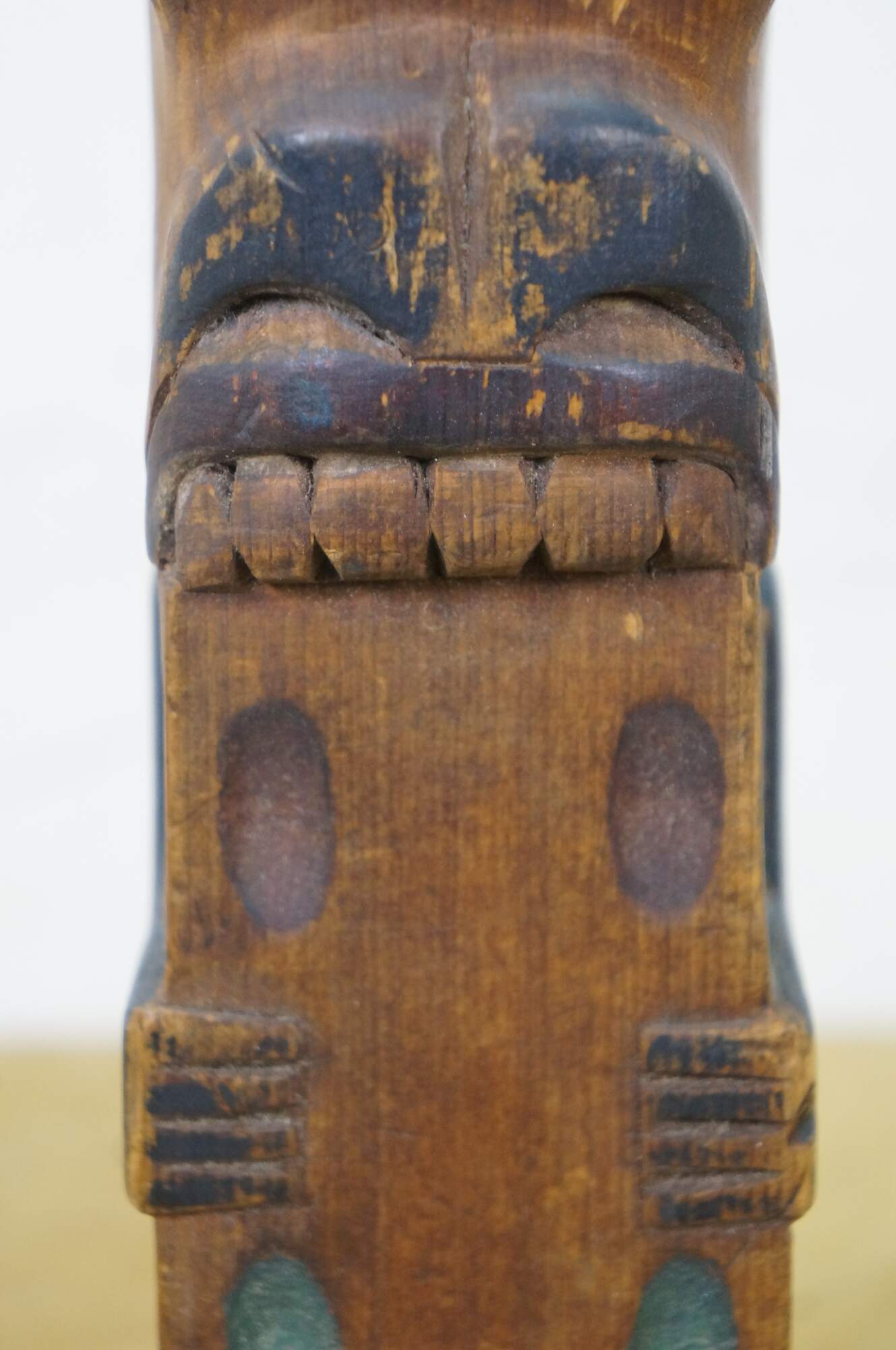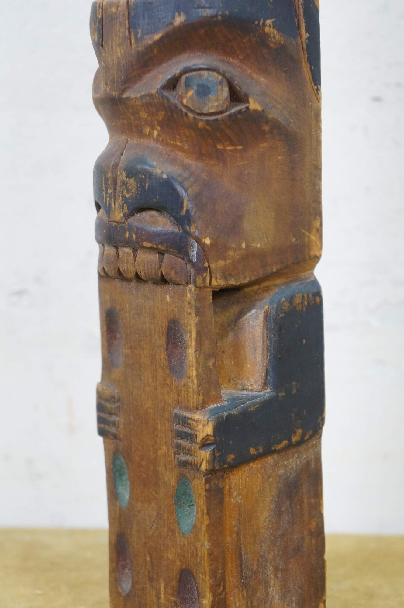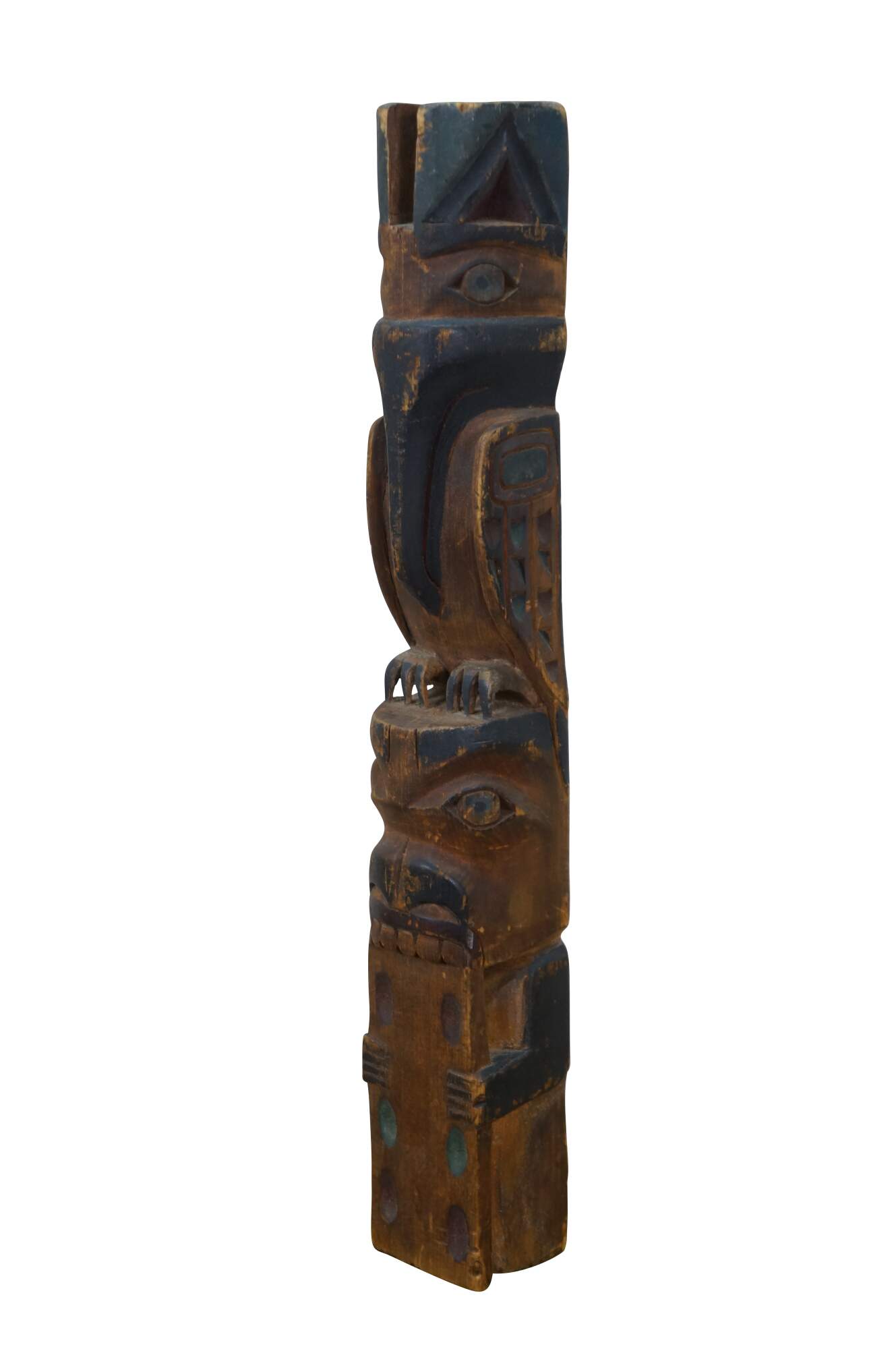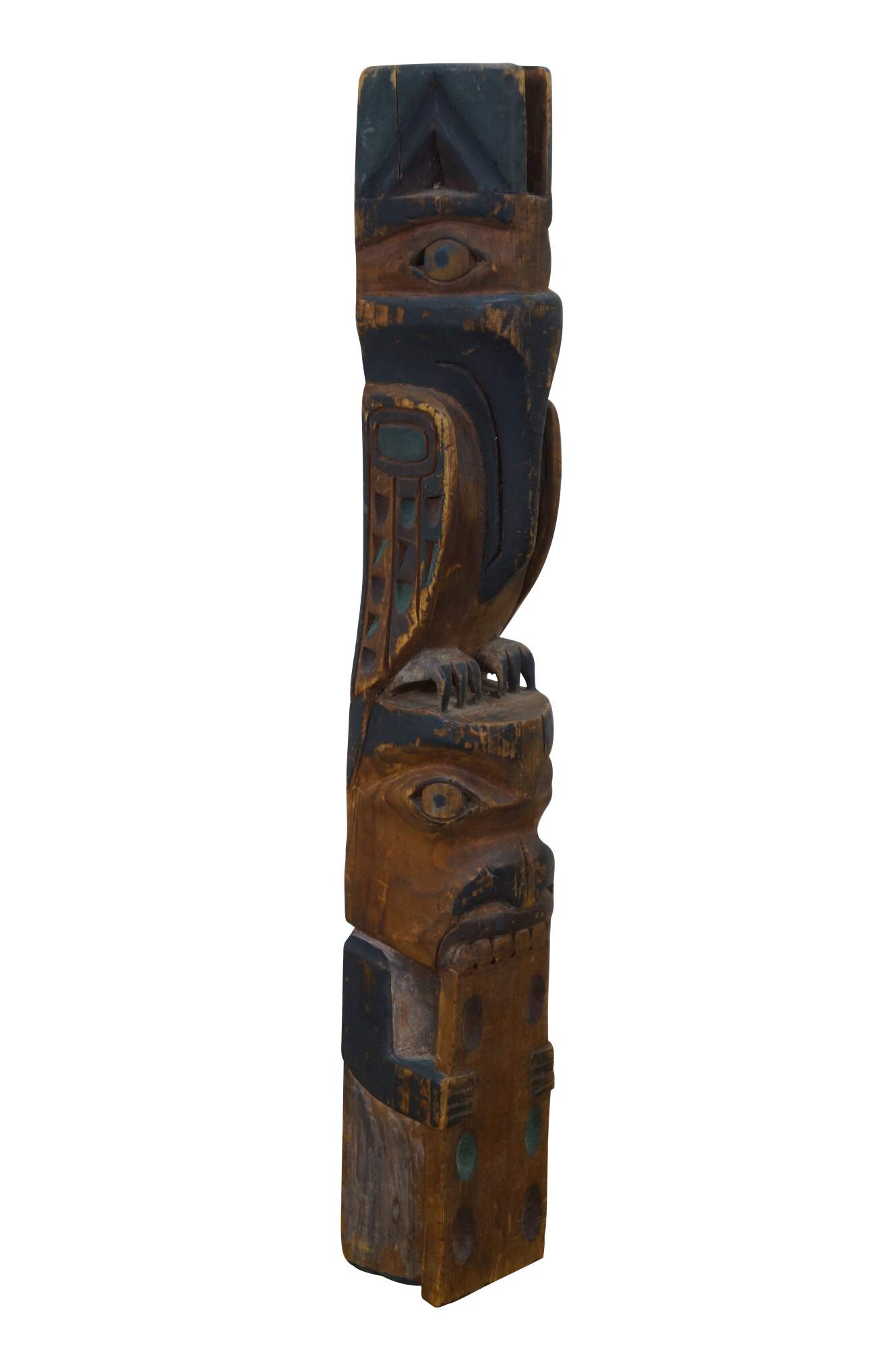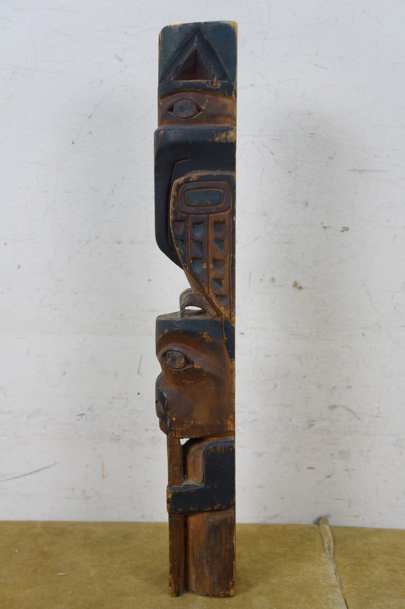 Old vintage hand carved and painted Northwest Coast Native american / Haida souvenir totem pole. Features two figure - a Raven like bird and a humanoid or beaver-like creature that appears to be chewing on a domino.