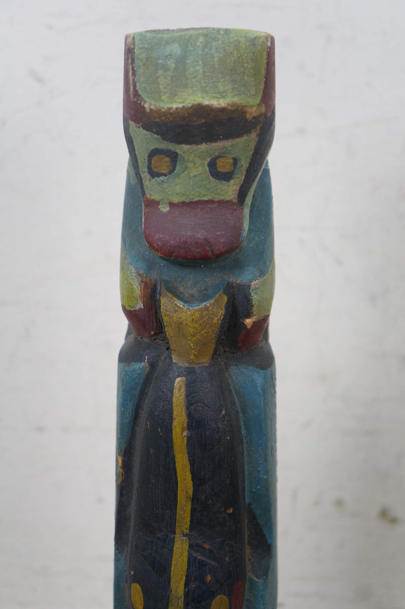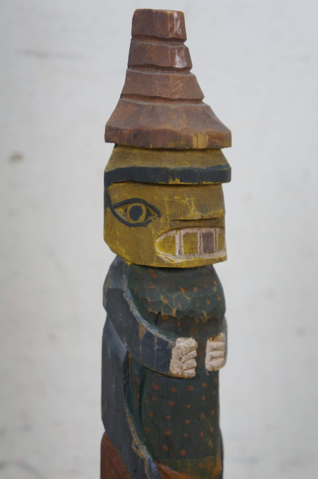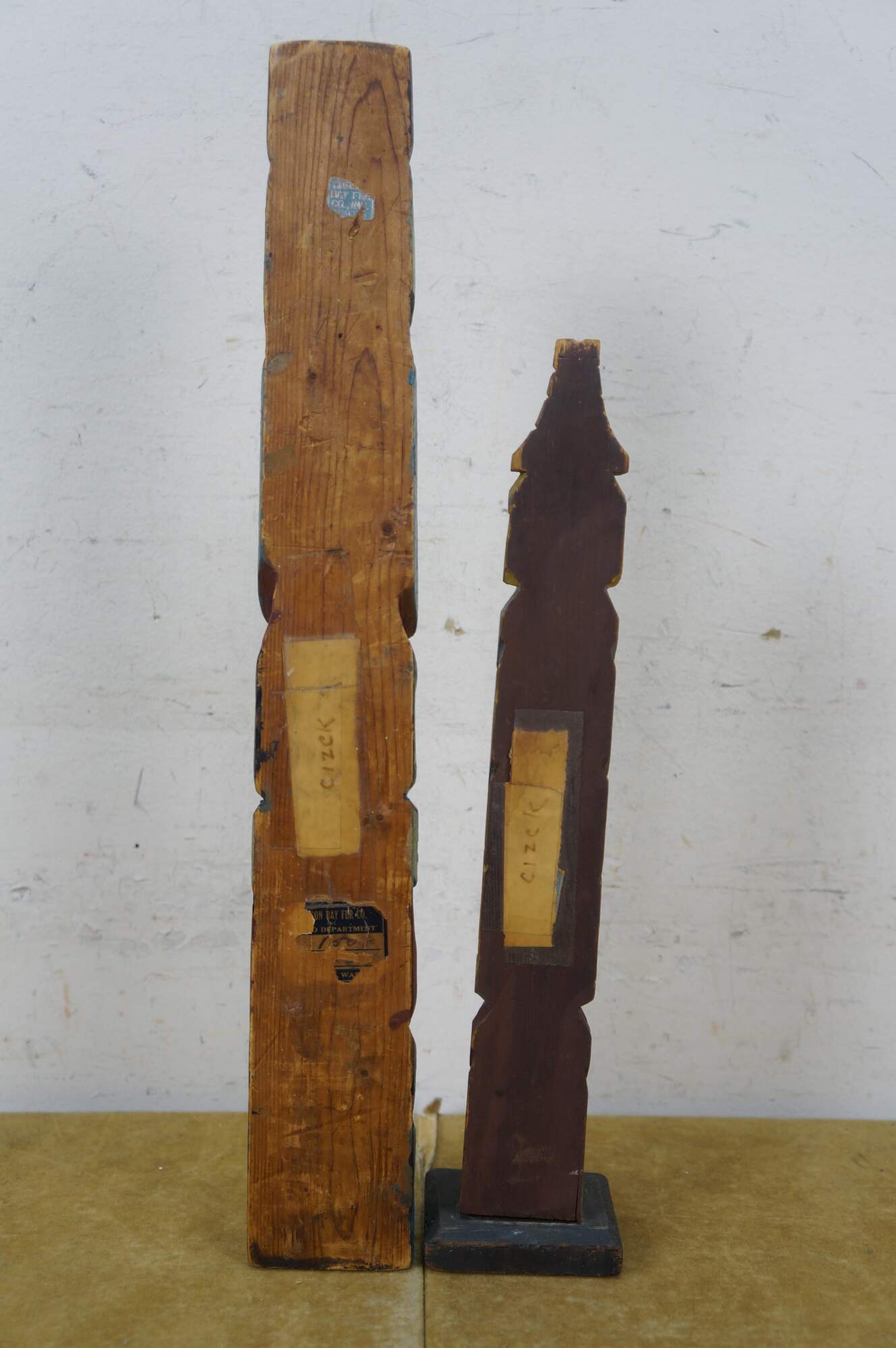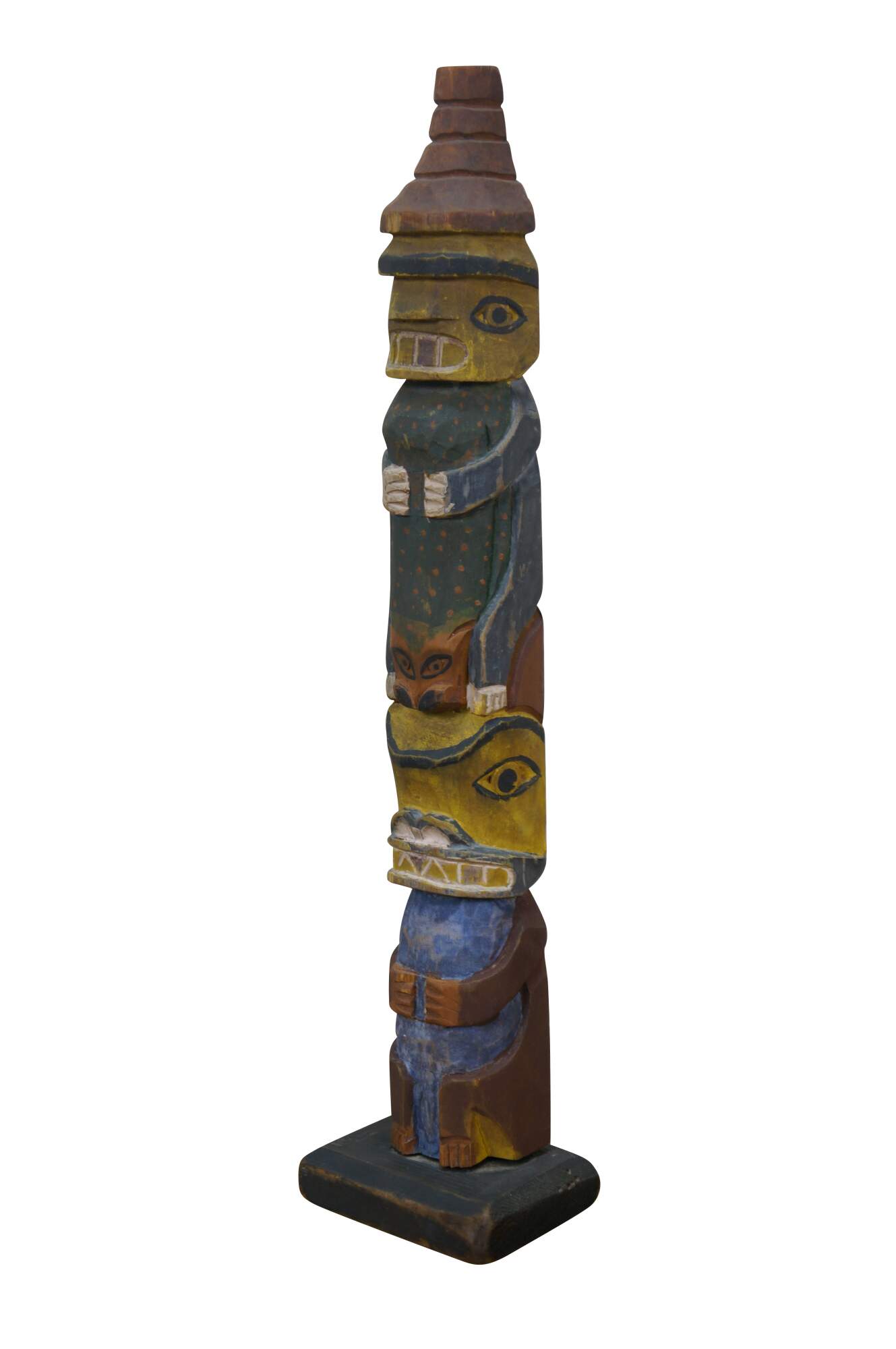 Mid to early 20th century hand carved and painted Pacific Northwest Native American folk art totem pole sculptures / figurines. Produced for the Hudson Bay Fur Company circa 1950s.