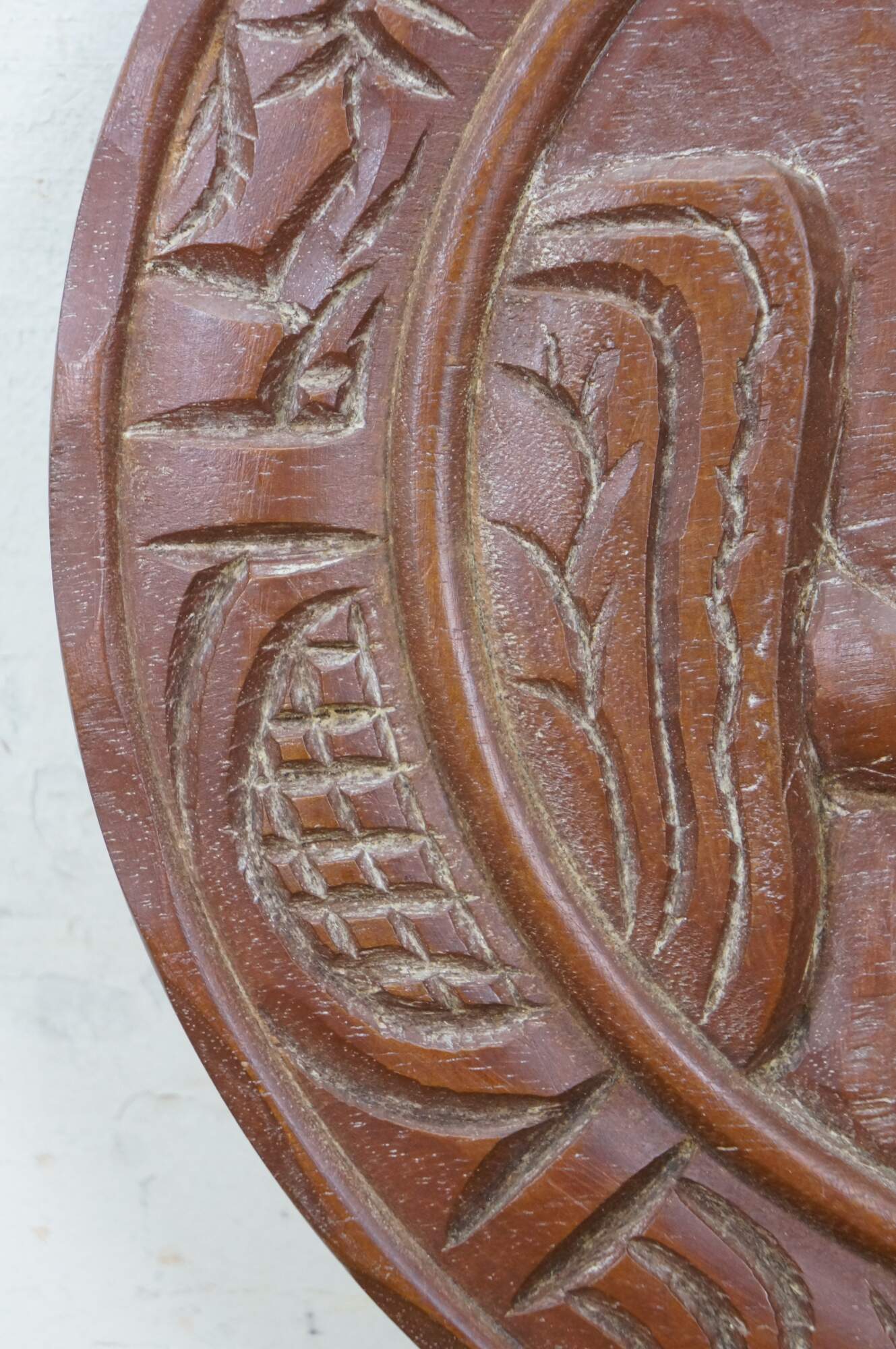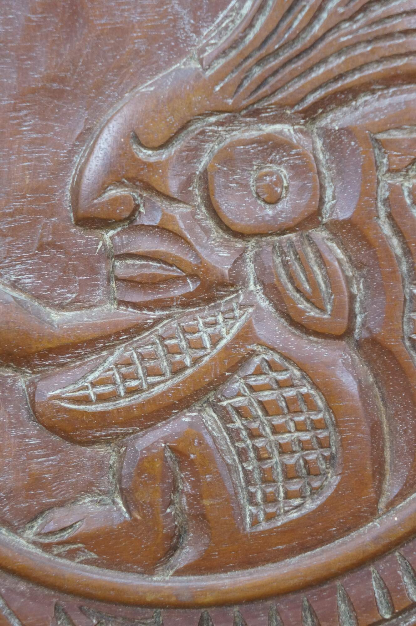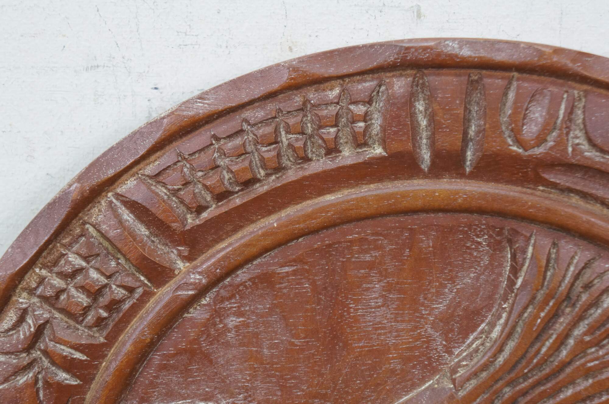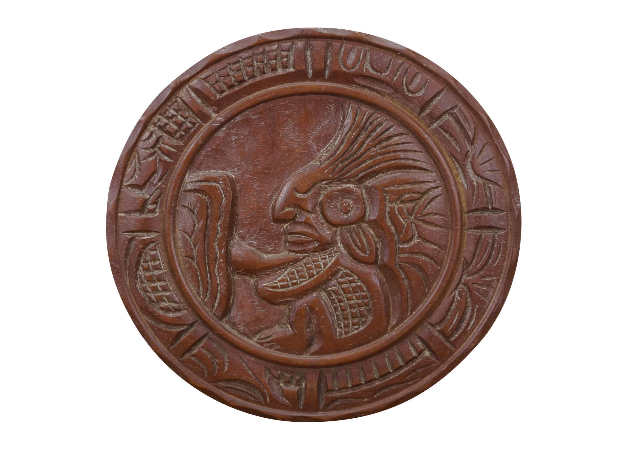 Vintage 20th century Mayan / Aztec style South American folk art carved wood wall hanging plate. Geometric border around a seated Indian Chief figure.
