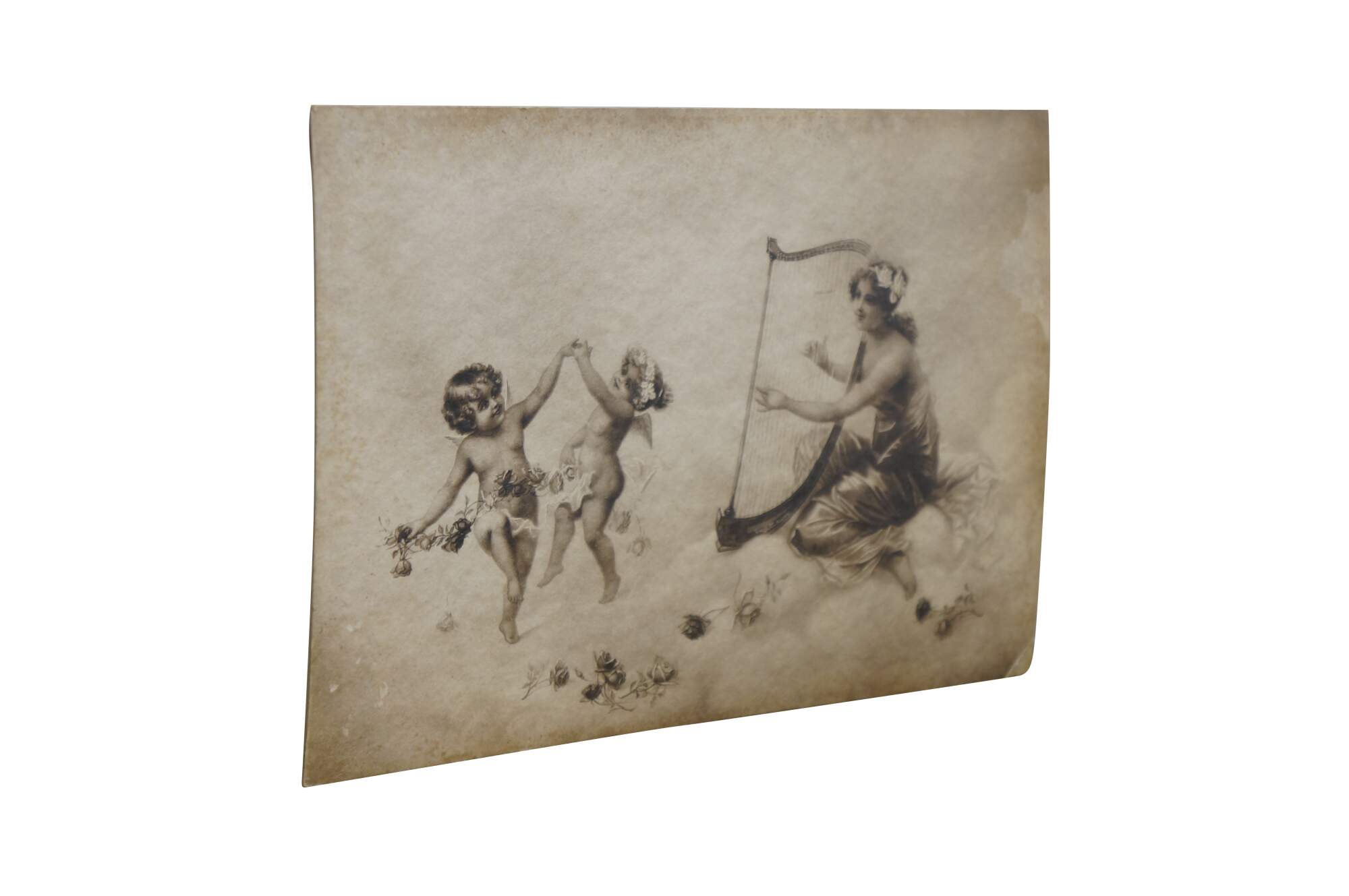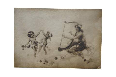 Turn of the century black and white lithograph print on cardstock of "Cupid's Minuet" by Magnus Greiner. Shows a beautiful female figure in neoclassical garments, seated on billowing clouds, playing a harp for a pair of dancing putti / cherubs. Copyright 1900 by the Taber Prang Art Company.