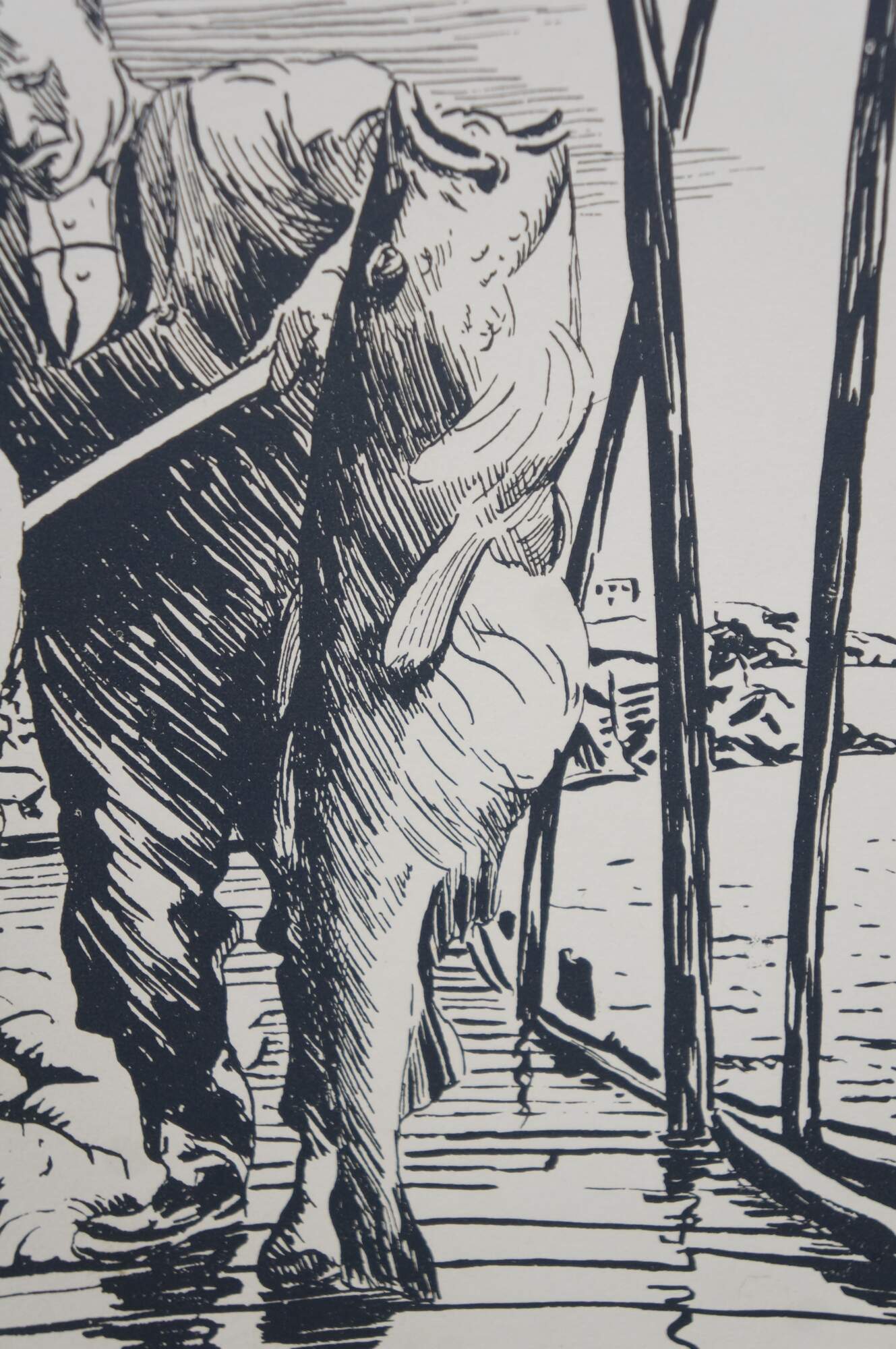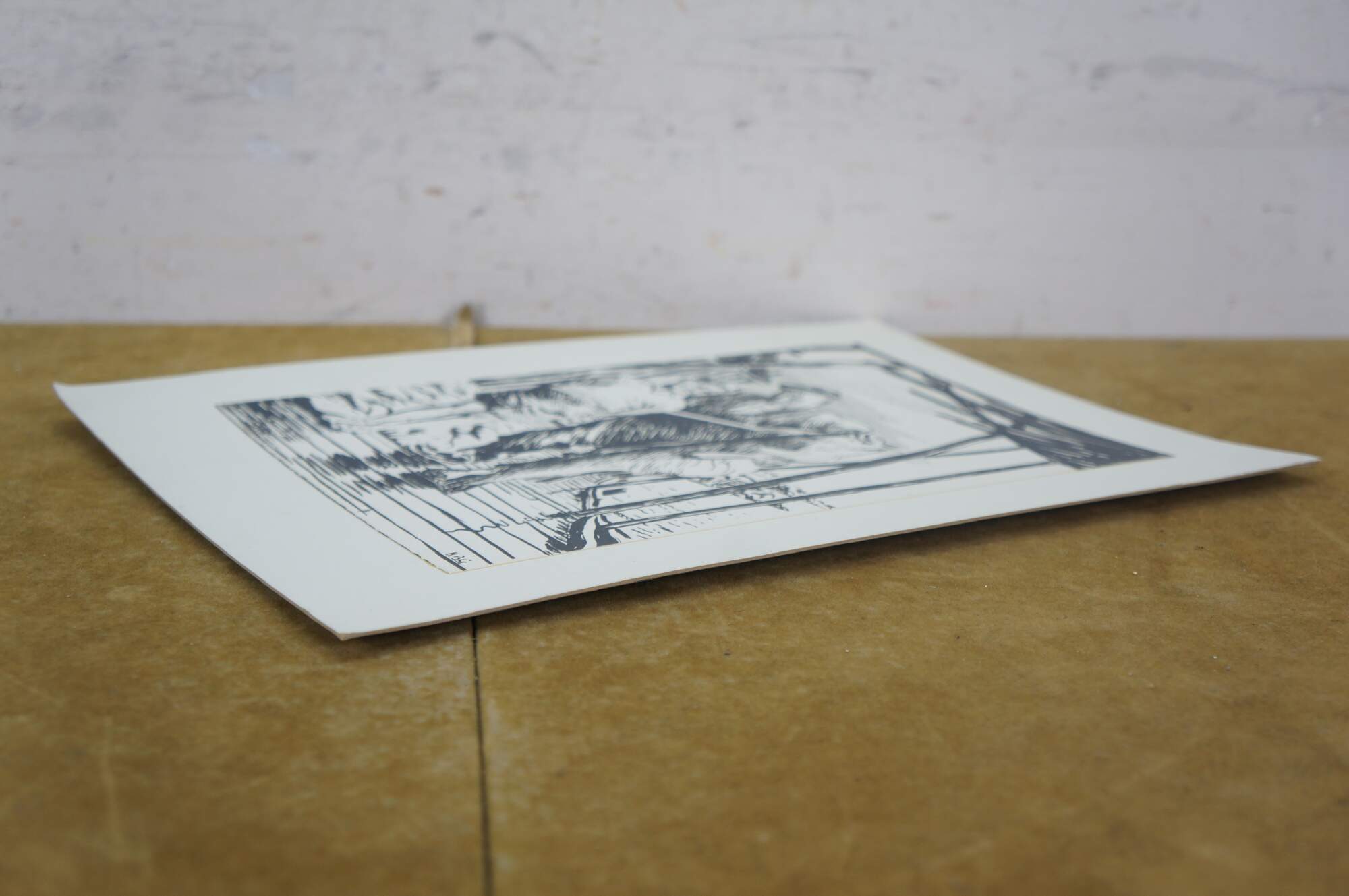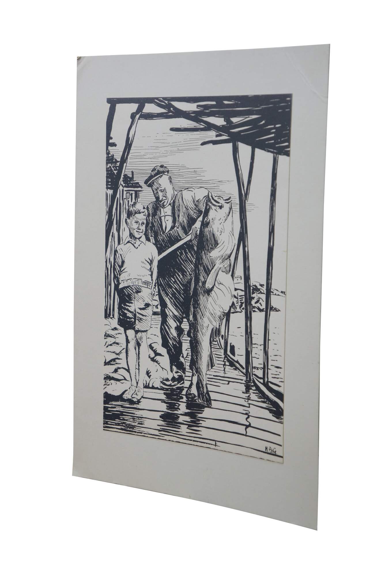 Mid to late 20th century print by Harold B. Goodridge. Shows a young boy and an older fisherman with an enormous fish, standing together on a Newfoundland dock. Printed and distributed by Goodridge as on of his many custom Christmas cards to friends and family. Mounted on cardstock. Portion of interior of card preserved on the back.