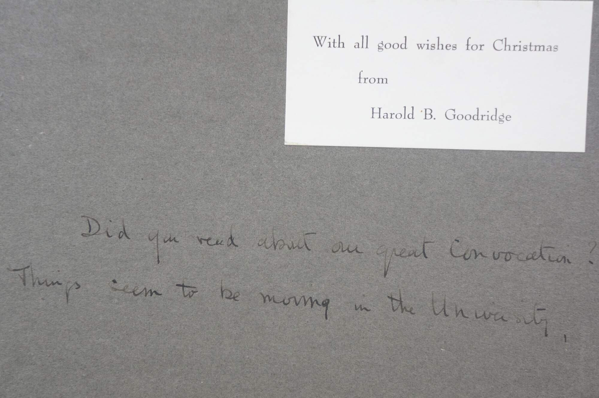 "Harold Berwick Goodridge was born in St. John's on Feb. 23, 1901, the son of Anne and Richard Goodridge. He was educated at Bishop Feild College in St. John's and at Bedford School and Cambridge University in England. In 1924 he began teaching in England and spent four years as head of the Department of Geography at Birkenhead School before leaving for India in 1934. There he served as master and acting principal at Daly College for Indian Princes at Indore. During 1942 he served with the Royal Indian Navy as artist and reporter. Goodridge returned to Newfoundland in 1944 and after two years as private secretary to Gov. Sir Humphrey Walwyn, he joined the faculty of Memorial University College, where he established the Department of Geography and served as its head for 14 years. In 1960 Goodridge retired from teaching to devote himself full-time to painting. He had no formal artistic training; he had first become interested in painting while in India and had received his first commissions there. After his return to Newfoundland he painted a large mural of John Cabot about to depart from Bristol at the beginning of his voyage of discovery, as part of the 450th anniversary of Cabot's voyage. It was subsequently used as the frontispiece for the 1949 Canadian Year Book, the first issue in which Newfoundland was included as a province. In the late 1950s the Newfoundland government commissioned the mural of Newfoundland history which now hangs in the lobby at Confederation Building. His work can be found in many public and private collections the world over. In 1977 he was awarded an honorary degree by Memorial for his contribution to the university and to art. Goodridge continued to paint until his death in April 1989. Harold Goodridge believed in sharing his art with as many people as possible. Each year he would design a Christmas card which contained one his drawings as the cover image; he would have these printed and sent to his friends. The subjects varied from the historic (Sir Humphrey Gilbert taking possession of Newfoundland for Queen Elizabeth I), to the contemporary (Bowring Park, the Anglican Cathedral), the religious (the adoration of the Magi) to the scenic (seagulls over cliffs)." (Heritage Newfoundland & Labrador)