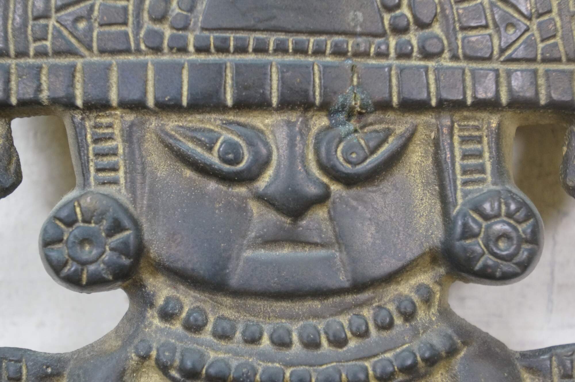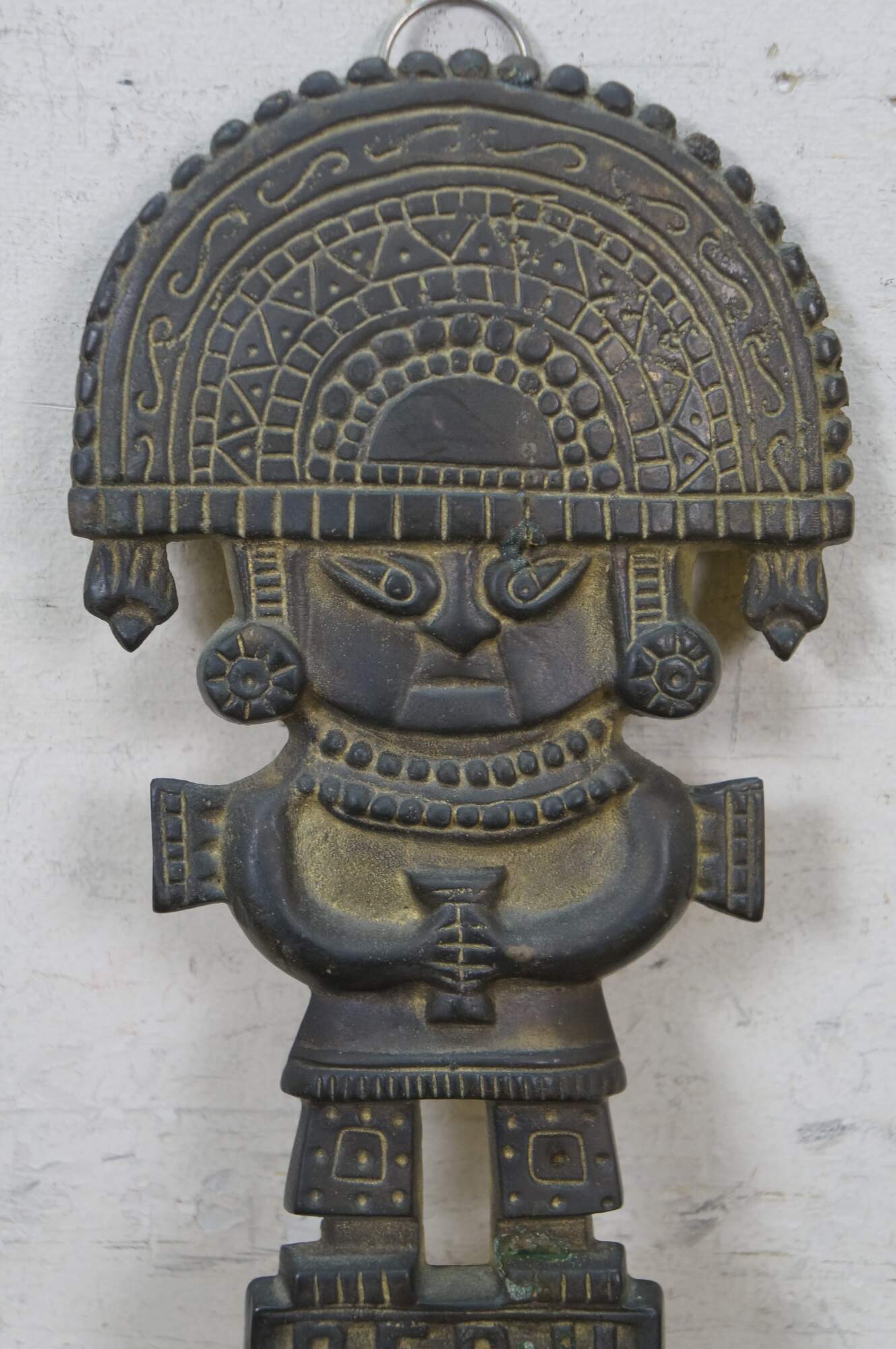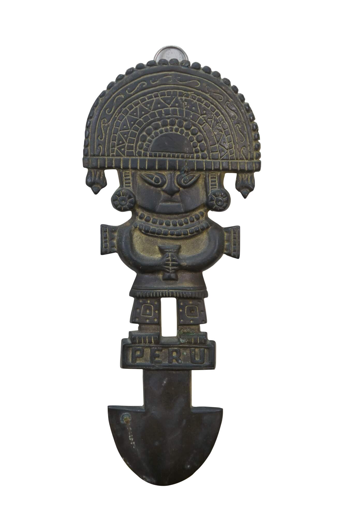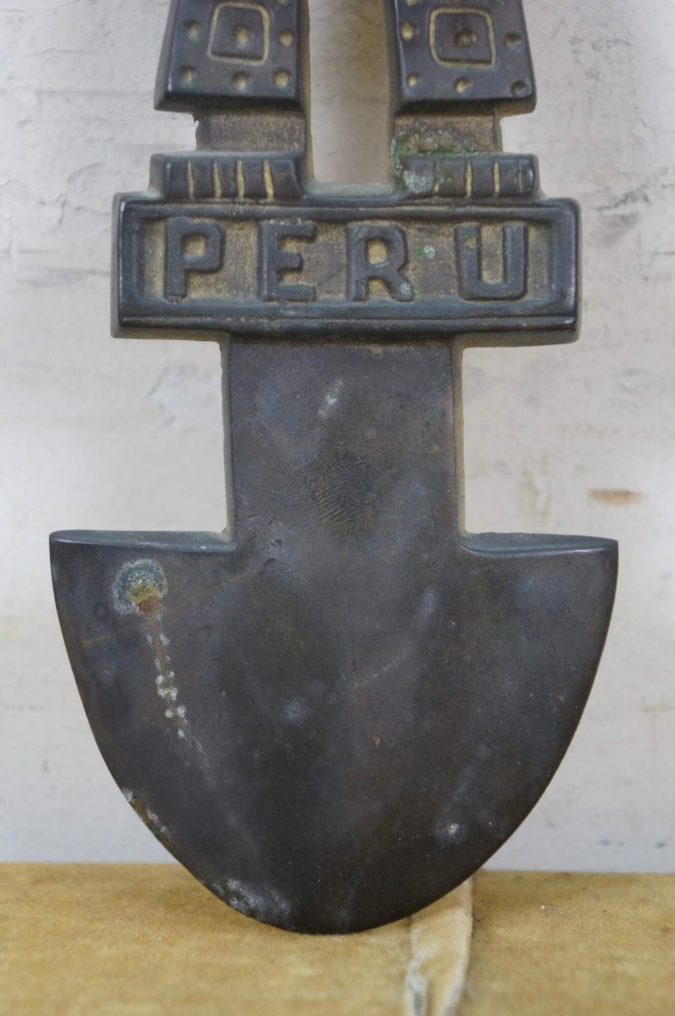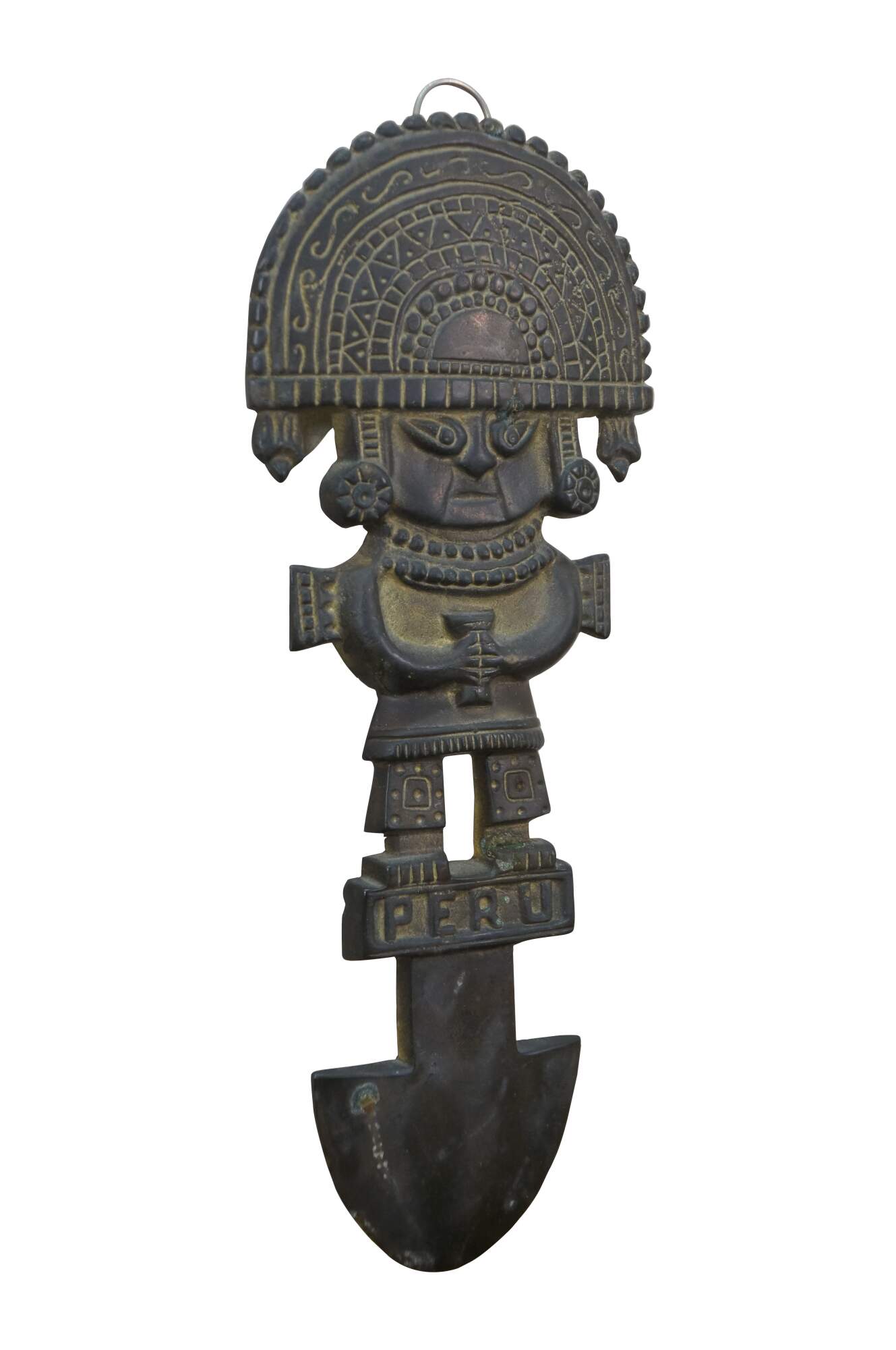Vintage 20th century brass wall hanging tumi - a tumi is a type Peruvian ceremonial knife now recreated as souvenir items and a symbol of Peru, often hung on the wall for good luck and protection. Features the figure of an Incan / Aztec warrior god in eleaborate headdress and jewelry holding a cup, standing above a crescent shaped axe blade, marked with the word Peru.