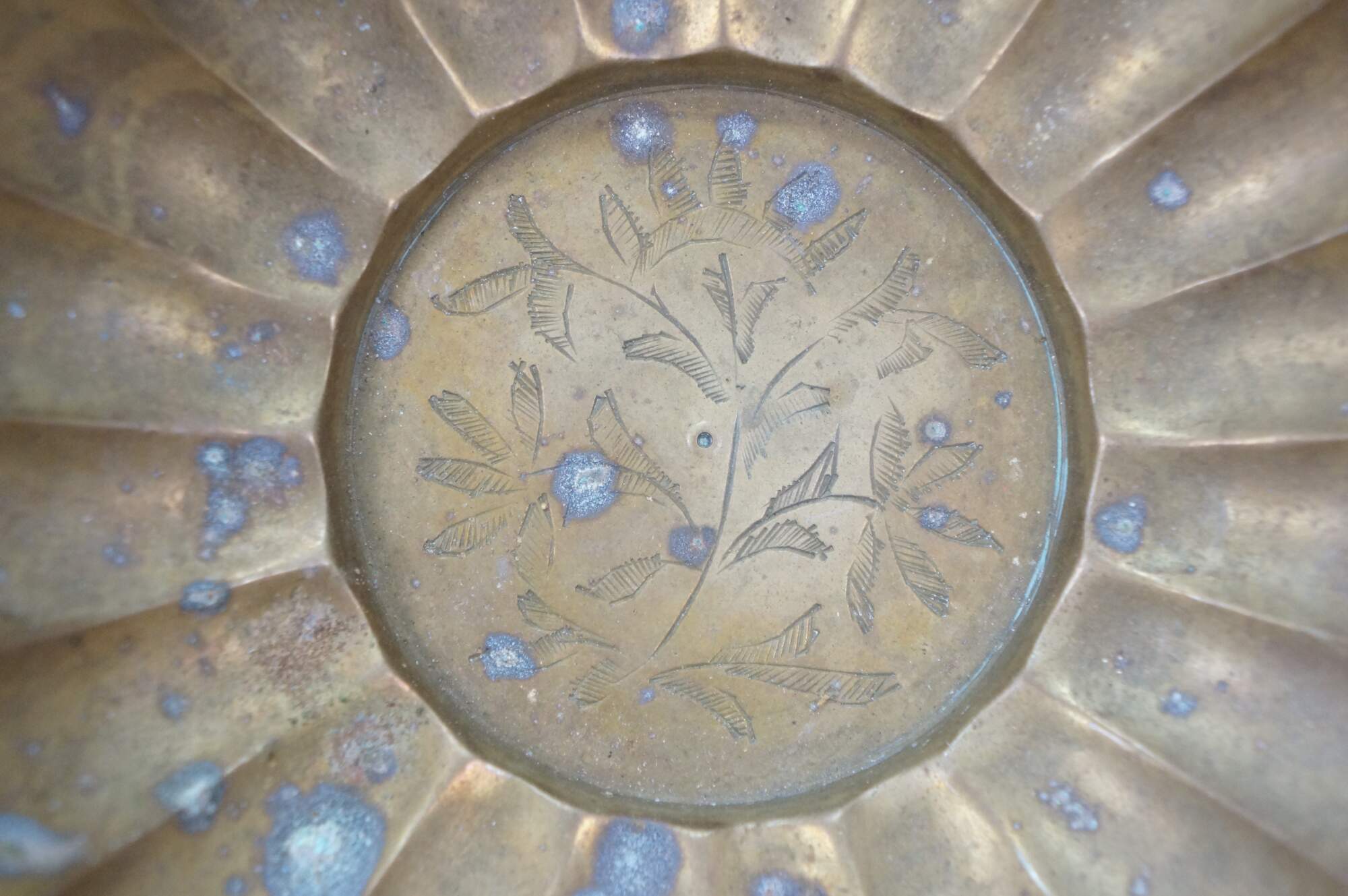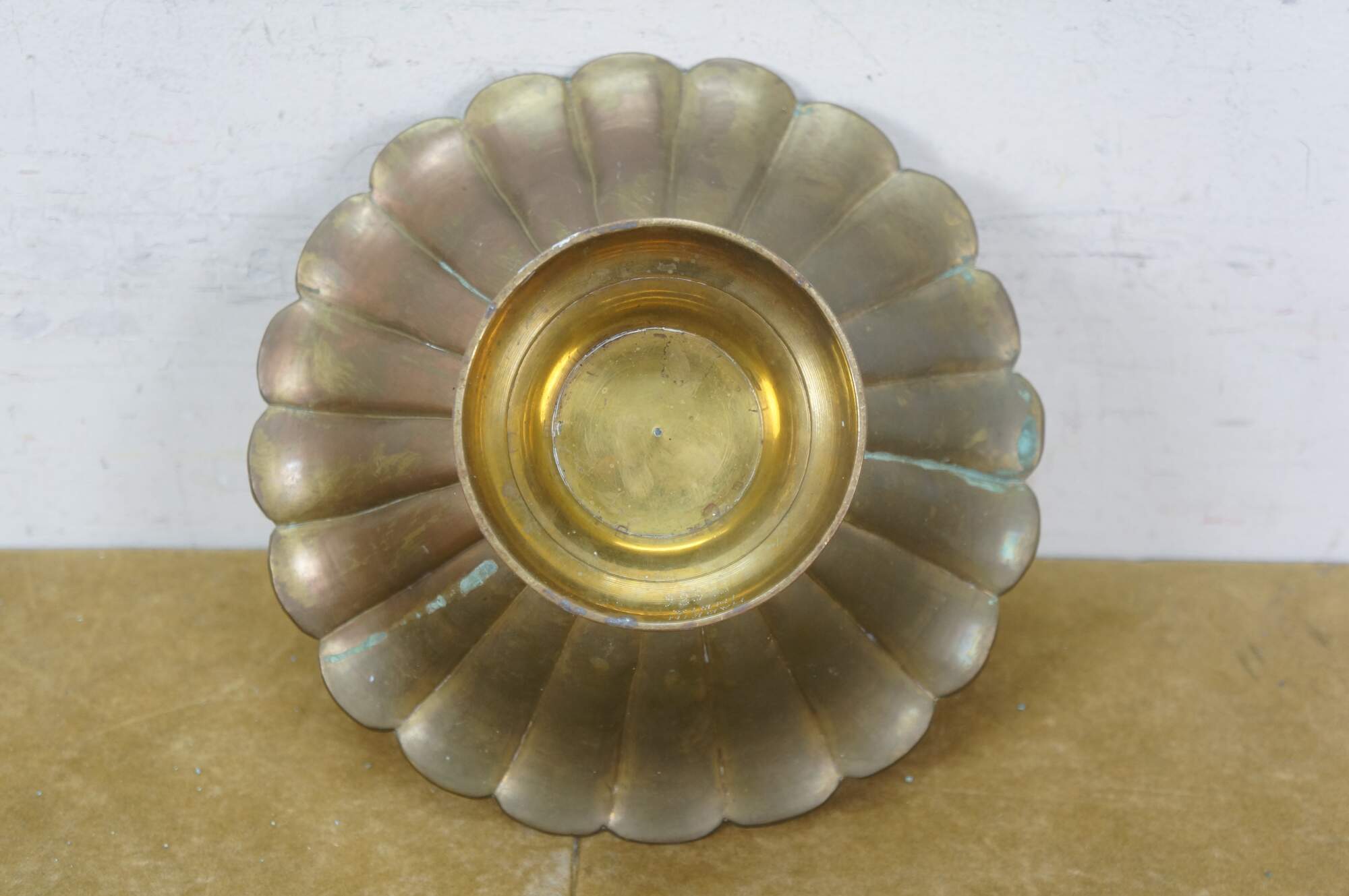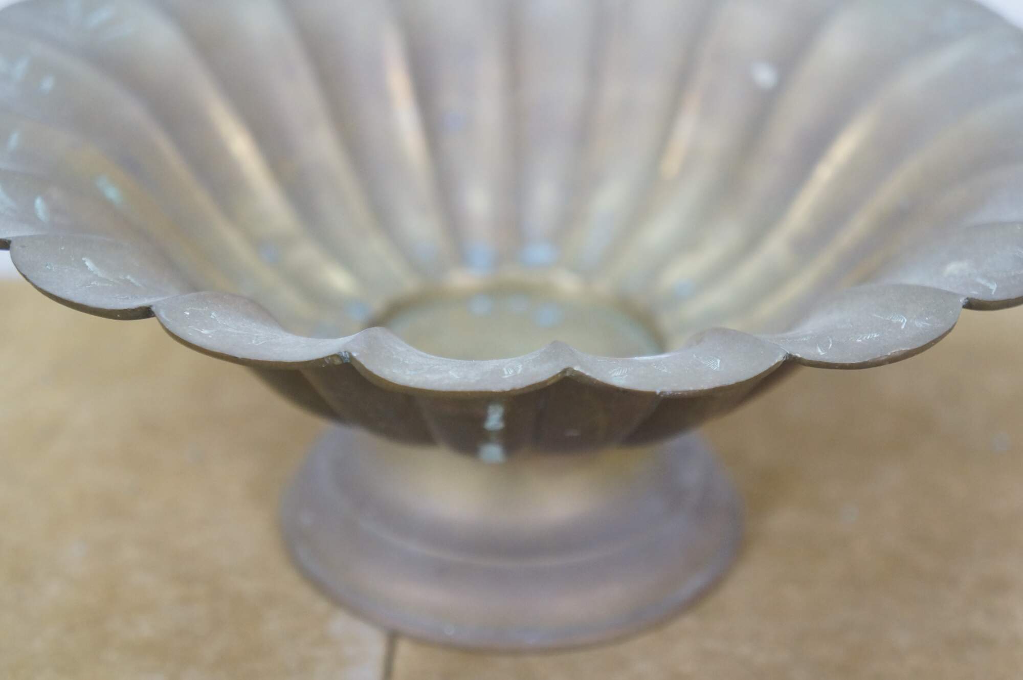 Late 20th century brass footed compote / dish - scalloped edge, fluted, flower shaped bowl with leaf etched edges and center with round pedestal base. Made in India.
