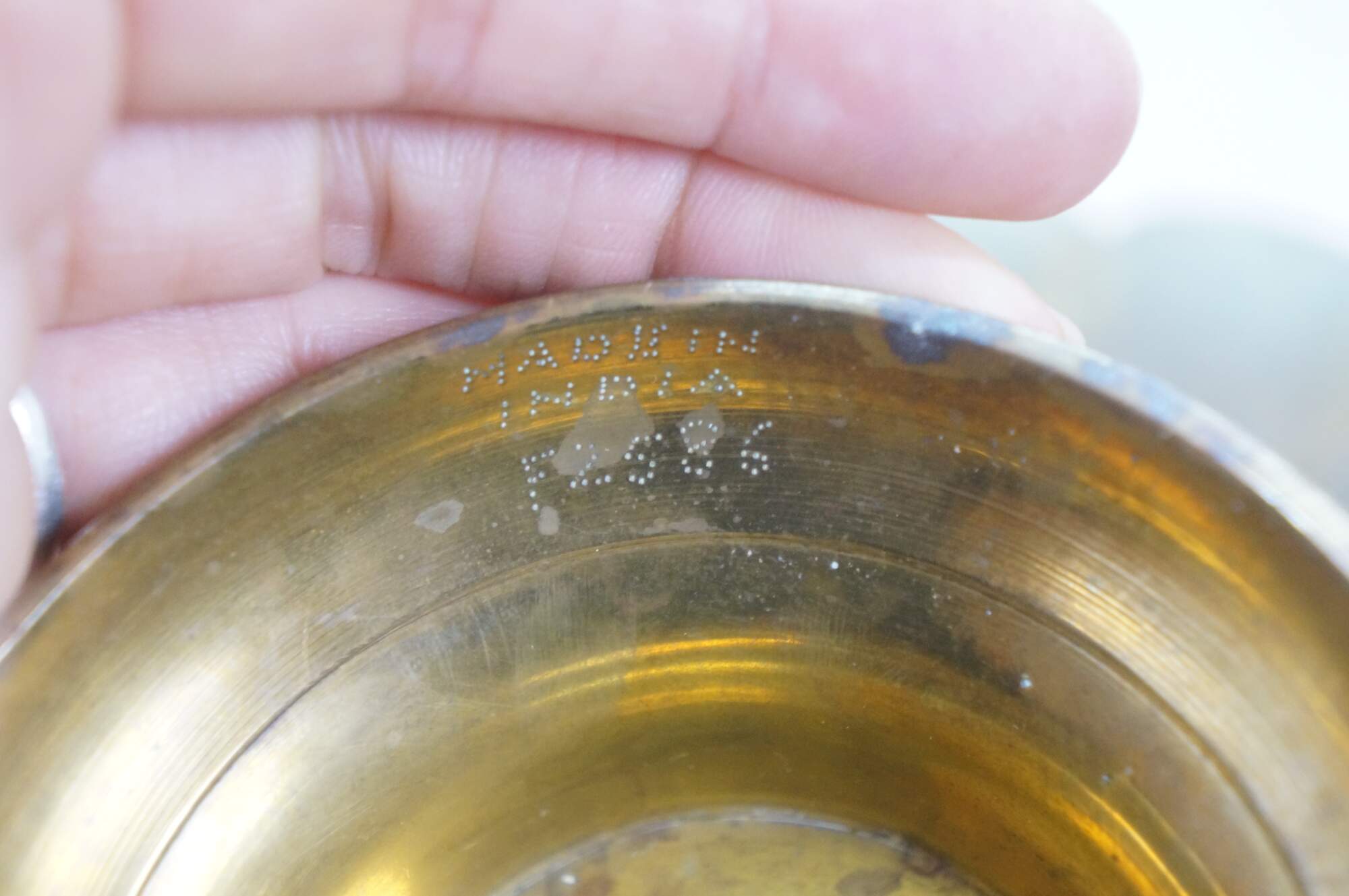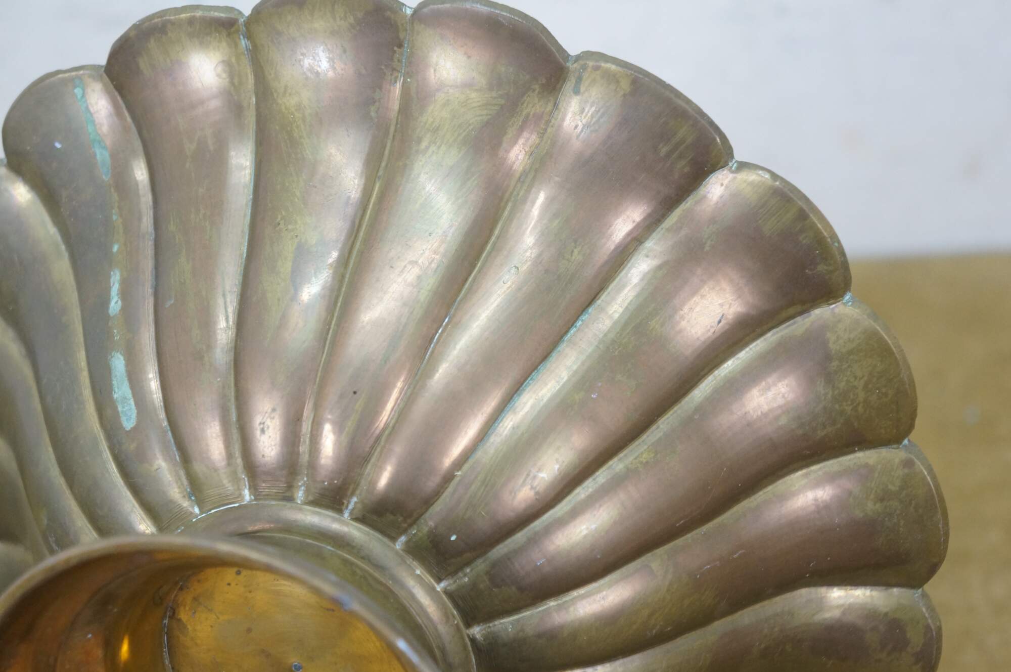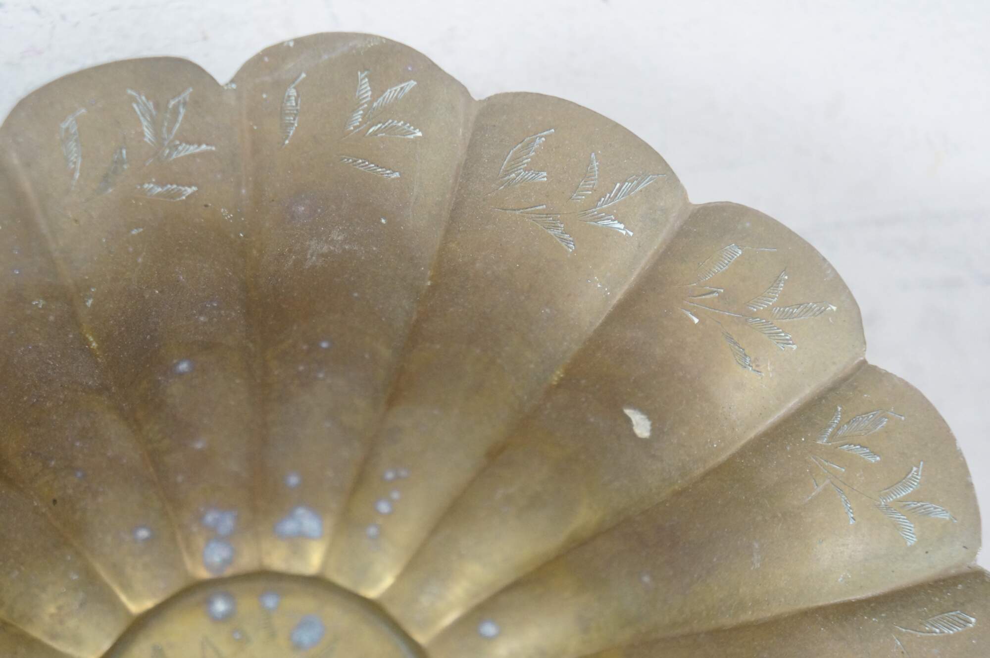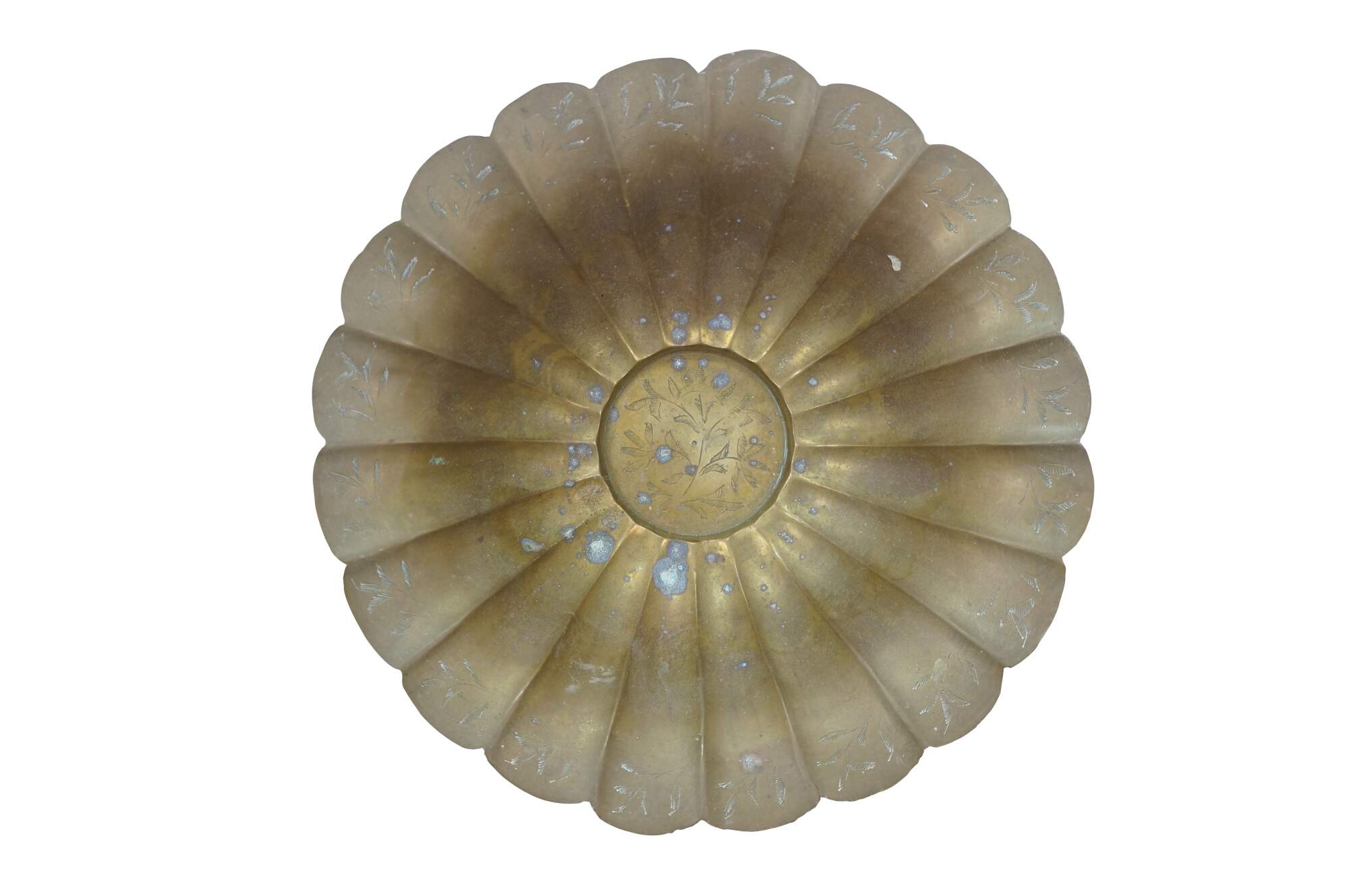 Late 20th century brass footed compote / dish - scalloped edge, fluted, flower shaped bowl with leaf etched edges and center with round pedestal base. Made in India.