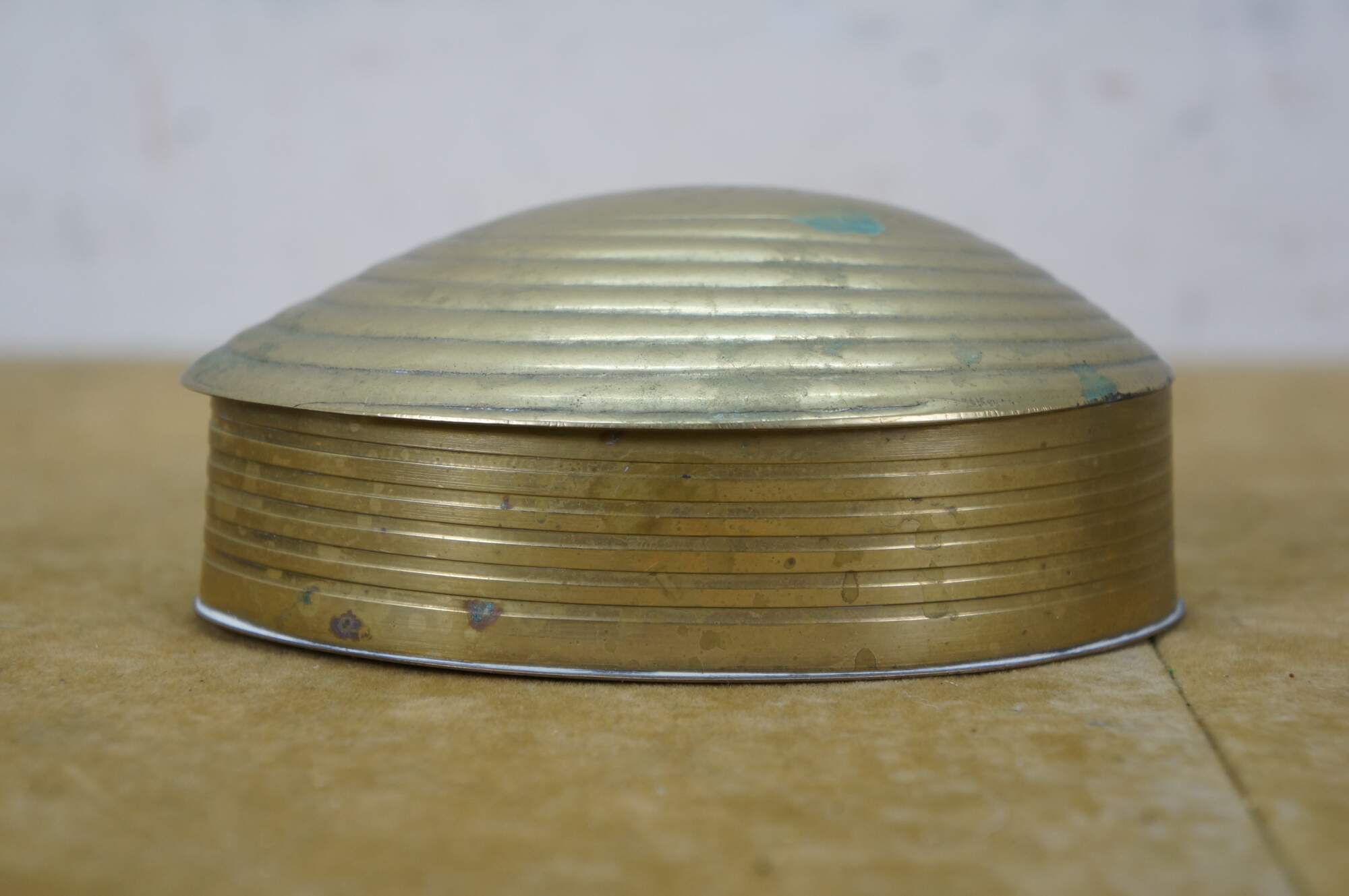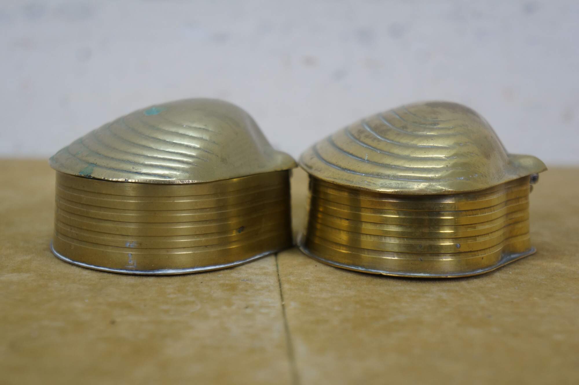 Pair of mid to late 20th century brass trinket / keepsake boxes with clamshell shaped flip top lid. Made in India.