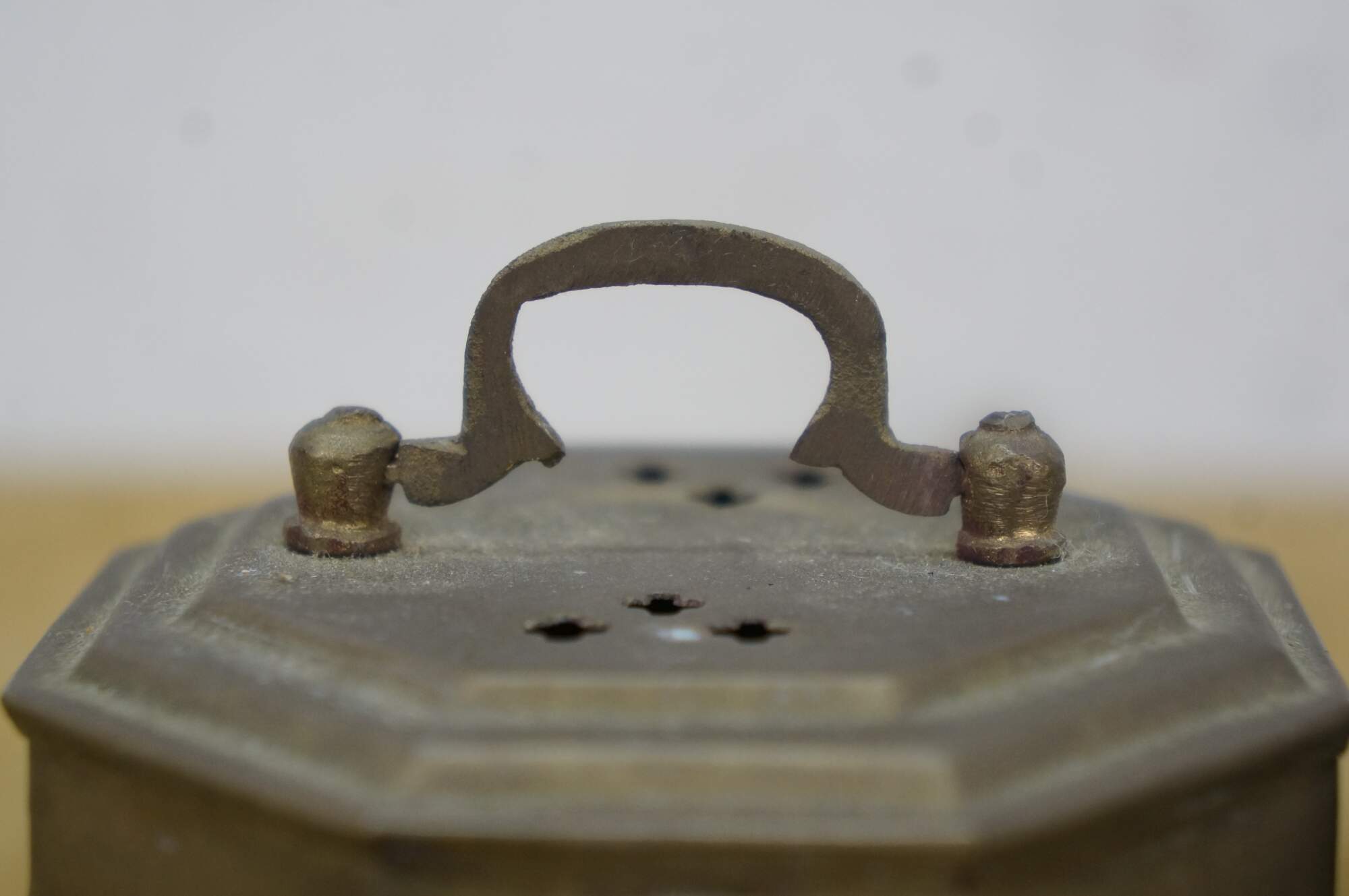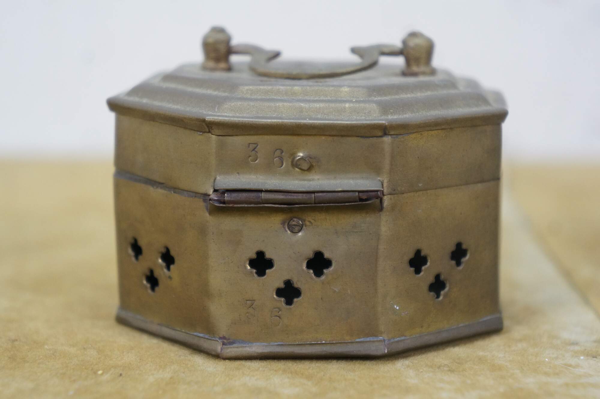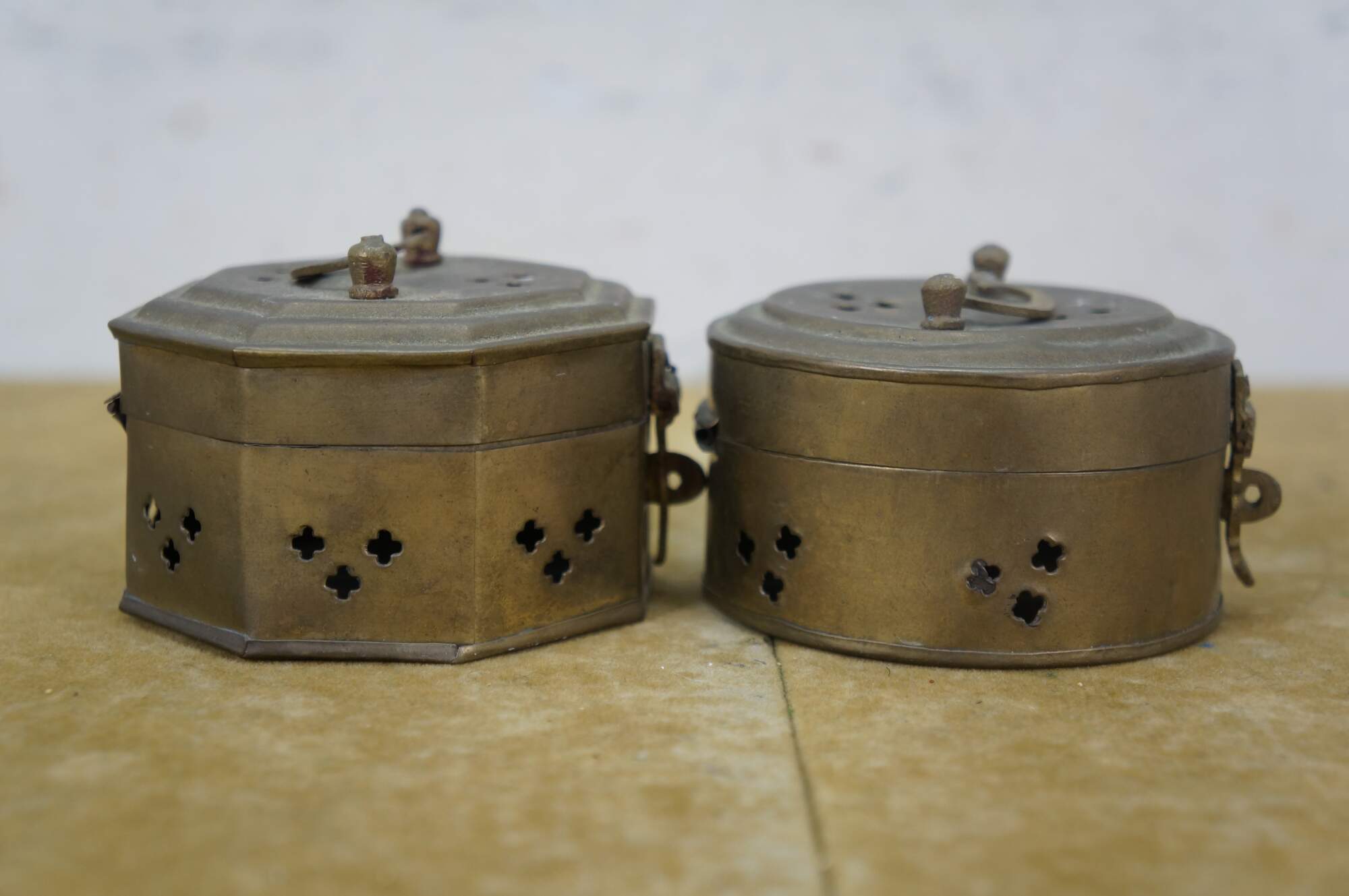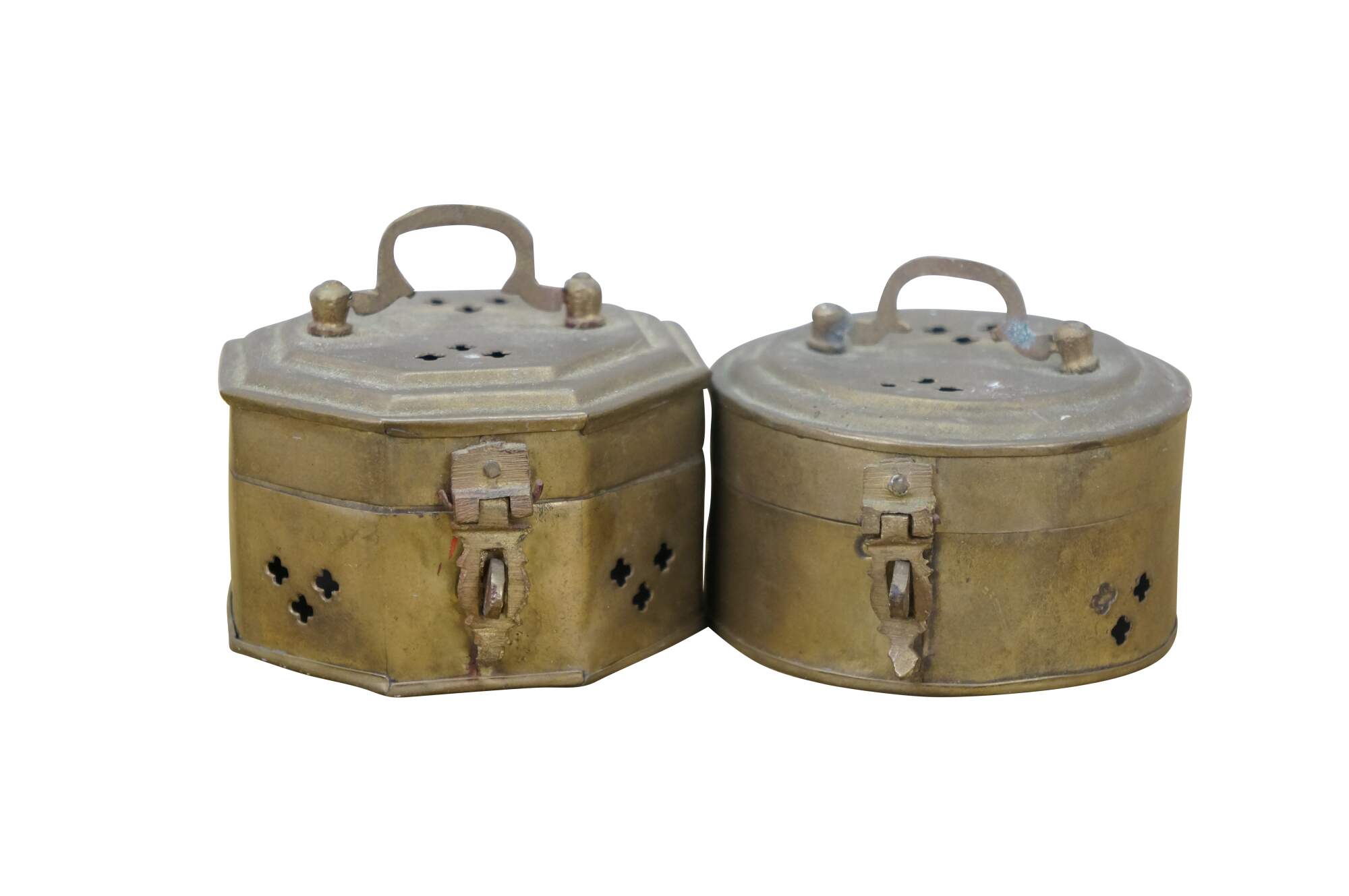 Pair of mid to late 20th century Indian brass cricket / trinket boxes. One round and one octagonal with pierced details, lockable hasp closure and rotating bail handles on top.