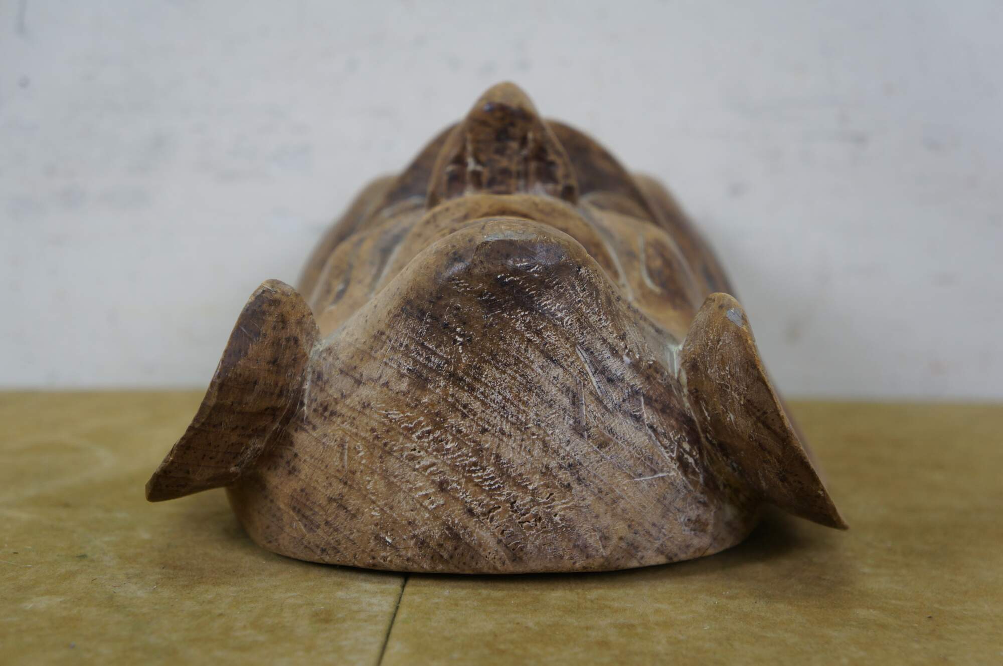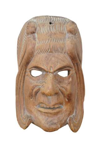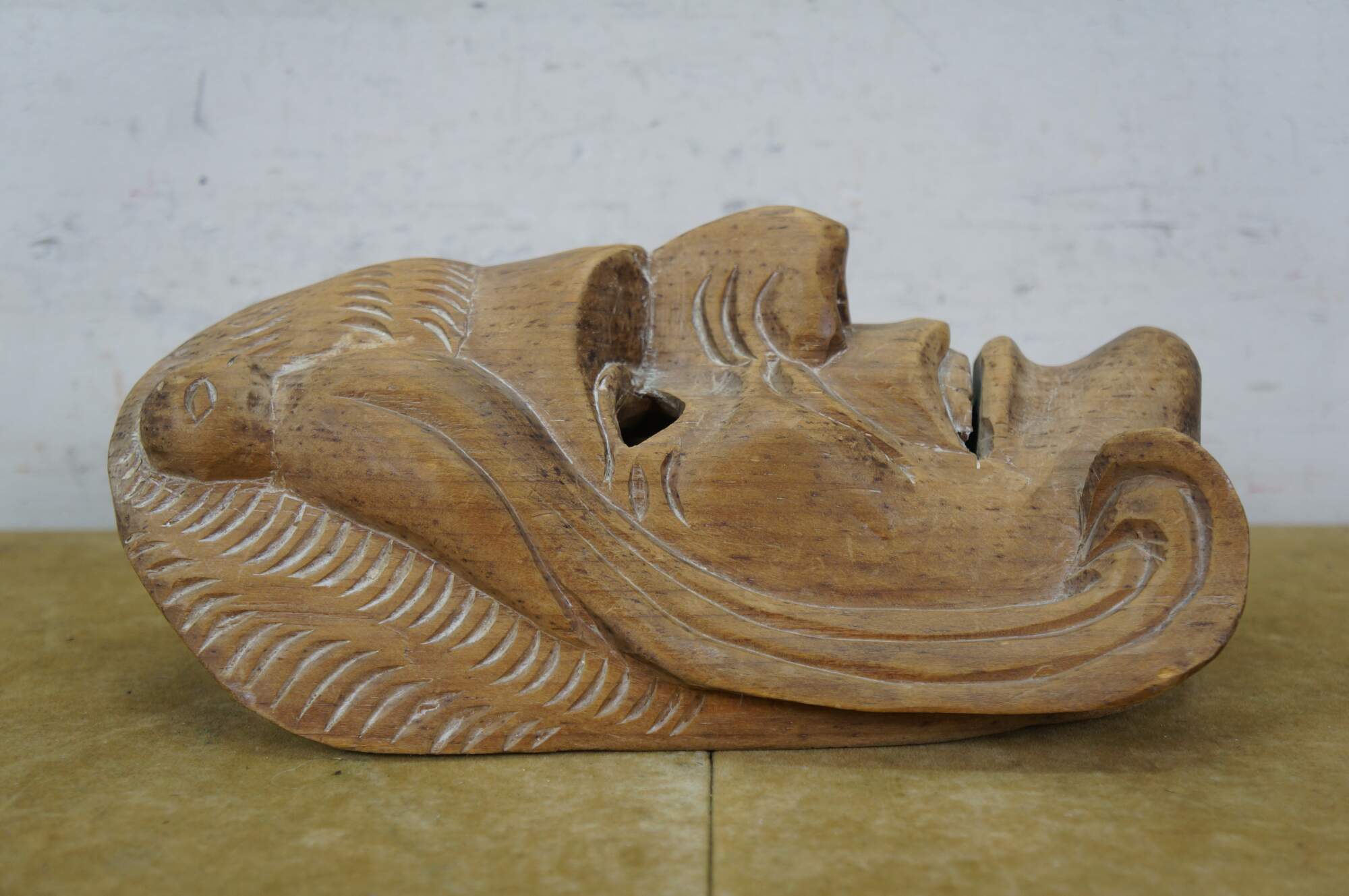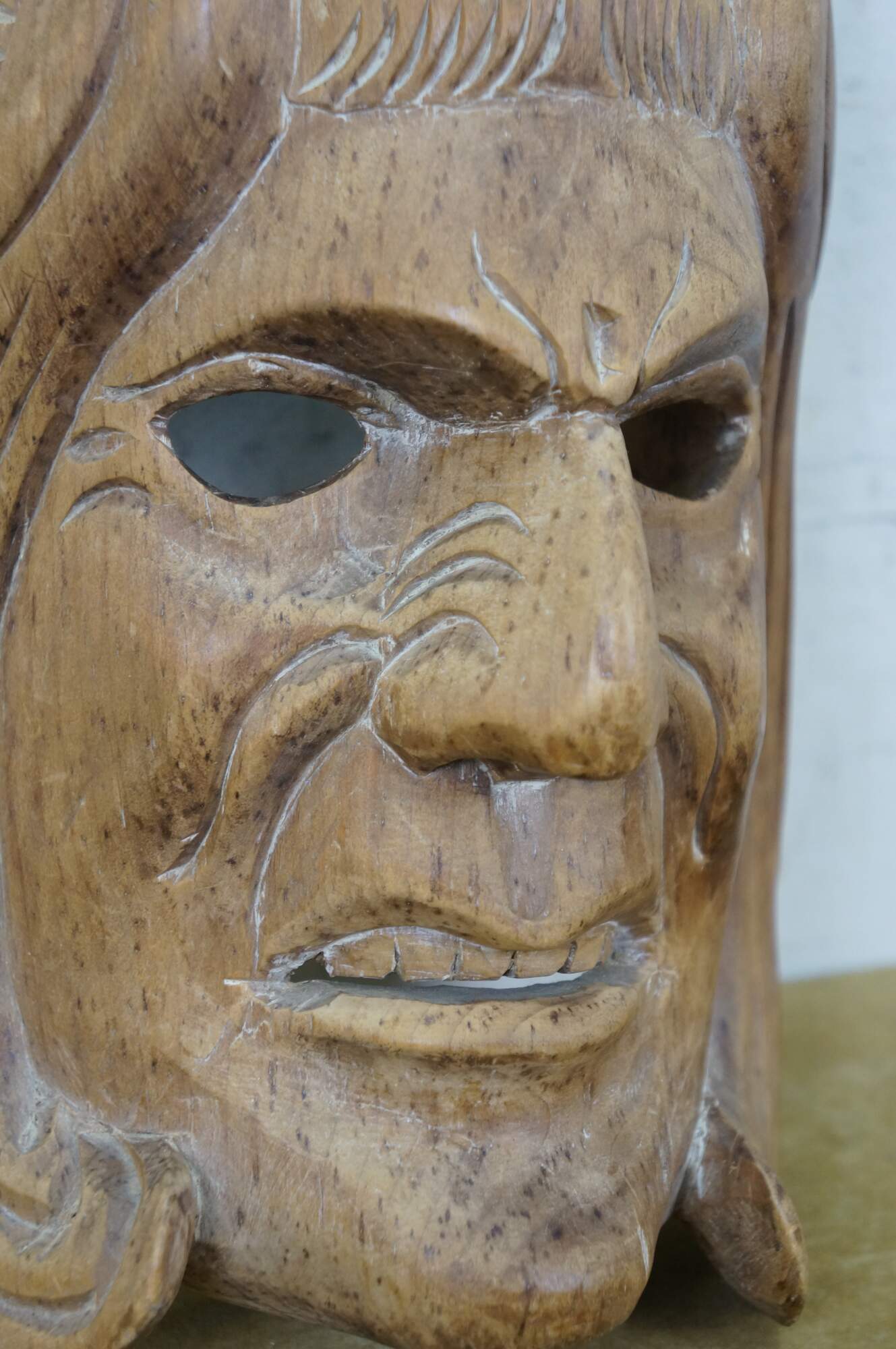 Vintage 20th century hand carved Guatemalan / Mayan wall hanging mask - detailed human face with tall hair, flanked on either side by parrots / birds with long tail feathers.