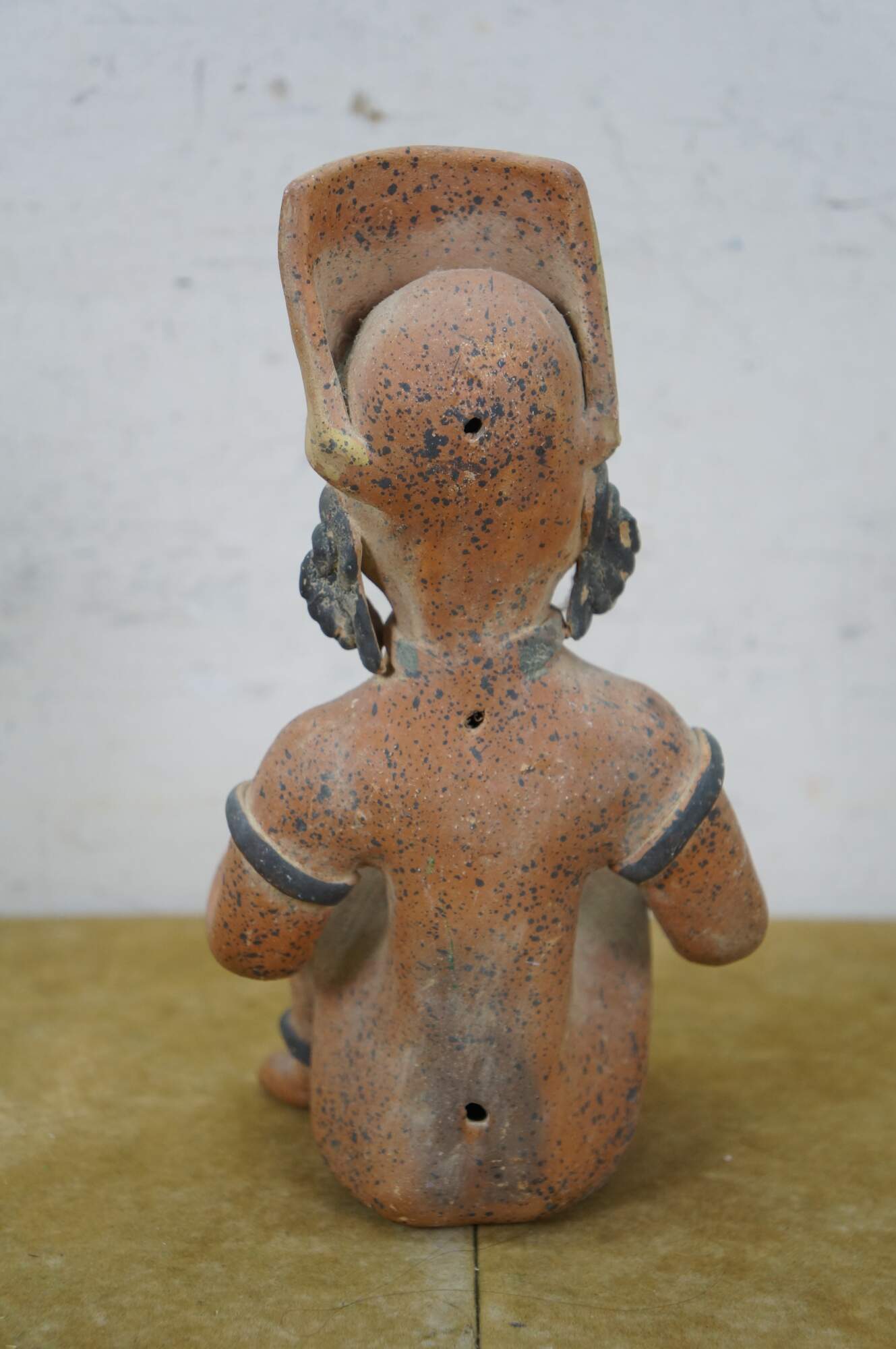 Vintage 20th century terracotta figurine / sculpture in the shape of an Aztec / Mayan style person in a seated position with hands on raised knees, dressed in yellow loin cloth, jewelry and headdress.