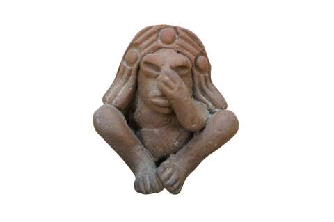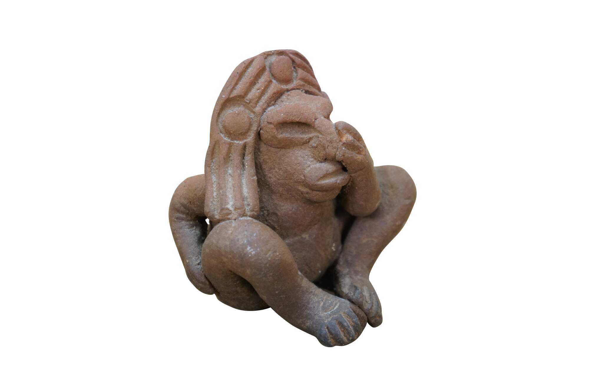 Vintage folk art style red earthenware whistle in the shape of a Mayan / Aztec inspired figure in a headdress, seated with one hand on his nose and the other on his backside.